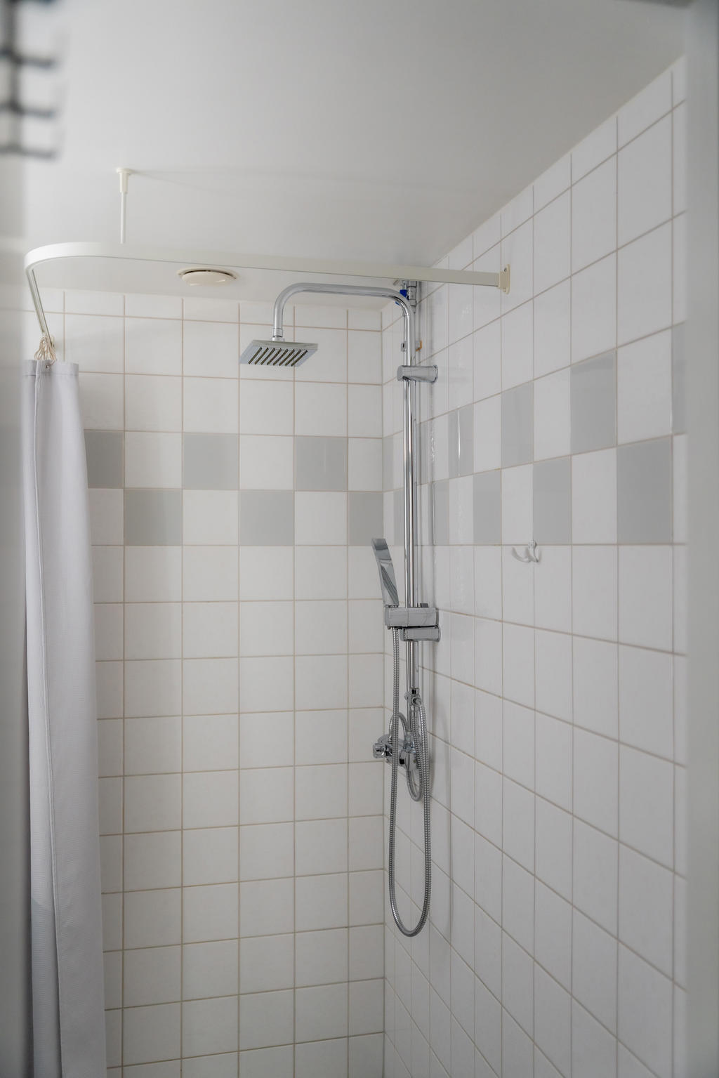 Badrummet är fräscht och helkaklat med dusch, tvättmaskin, spegelskåp och dimbar belysning som skapar en trivsam känsla.