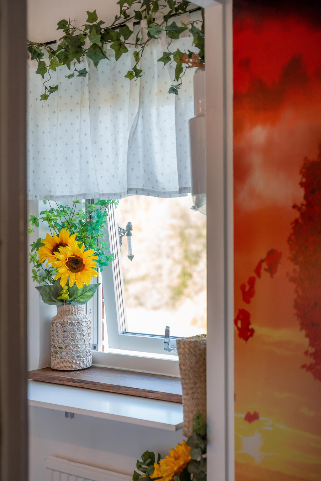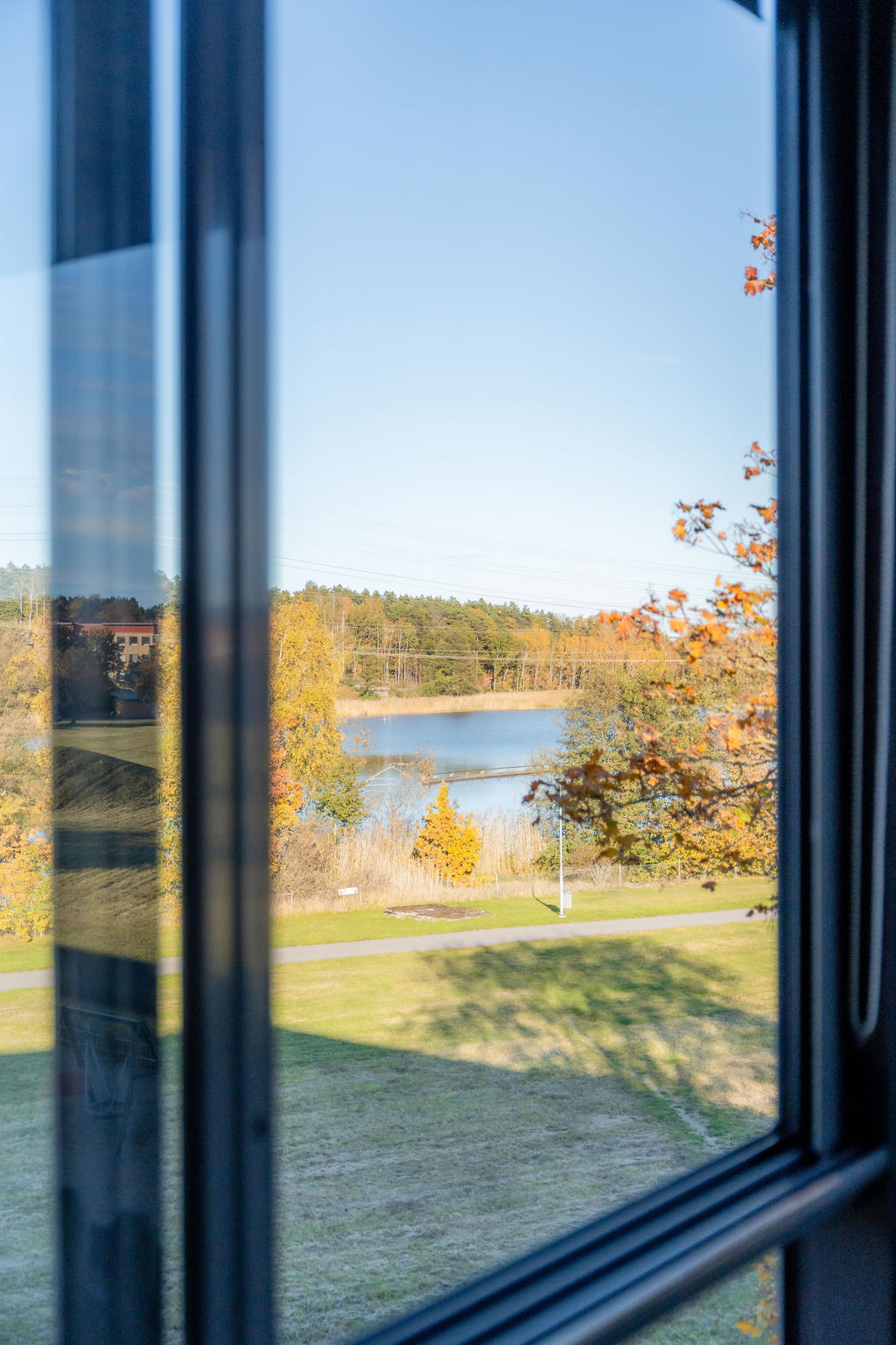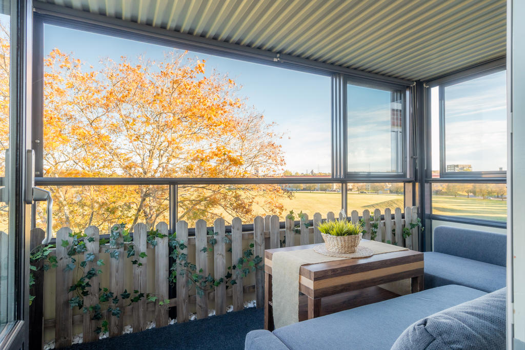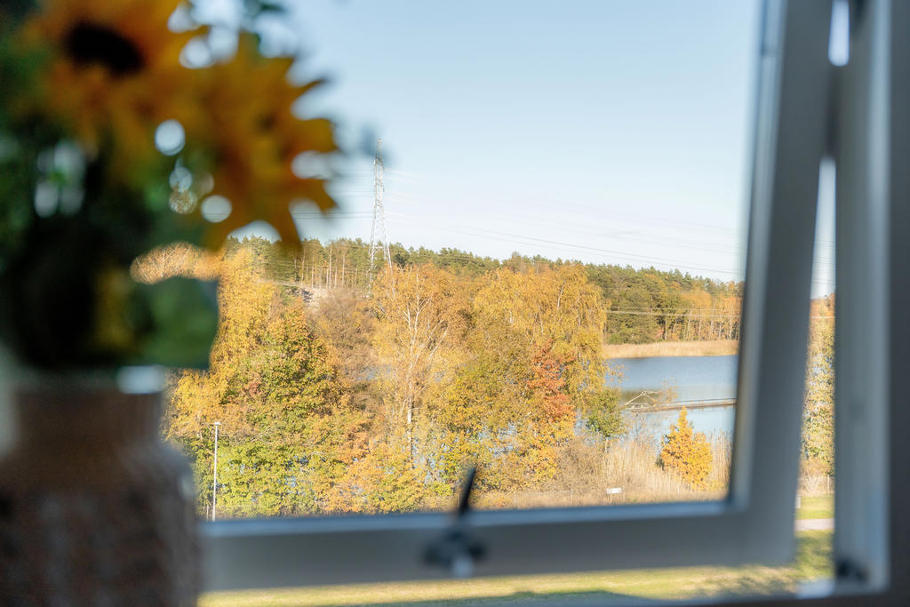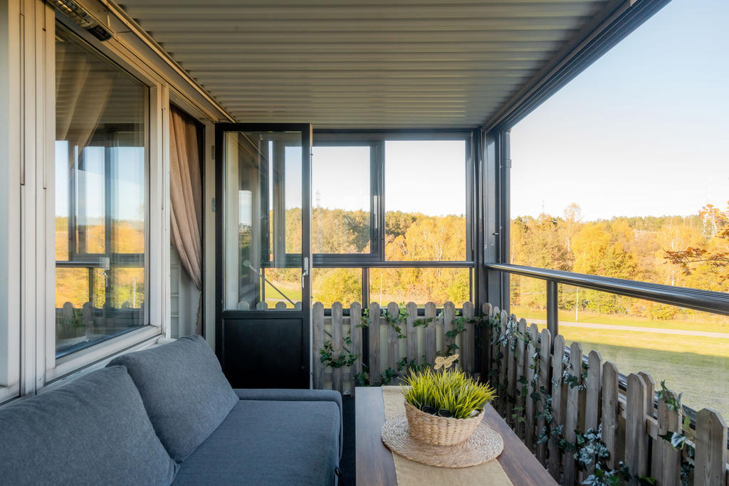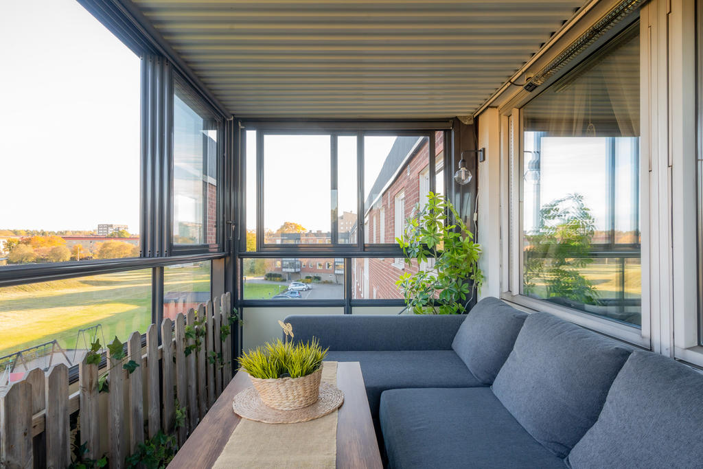 Den inglasade balkongen bjuder på utsikt mot både grönska och vatten – en härlig plats för morgonkaffet eller en lugn stund efter jobbet. Här finns plats för ett smalt bord på hjul som enkelt kan flyttas efter behov – perfekt för både arbete och måltider.