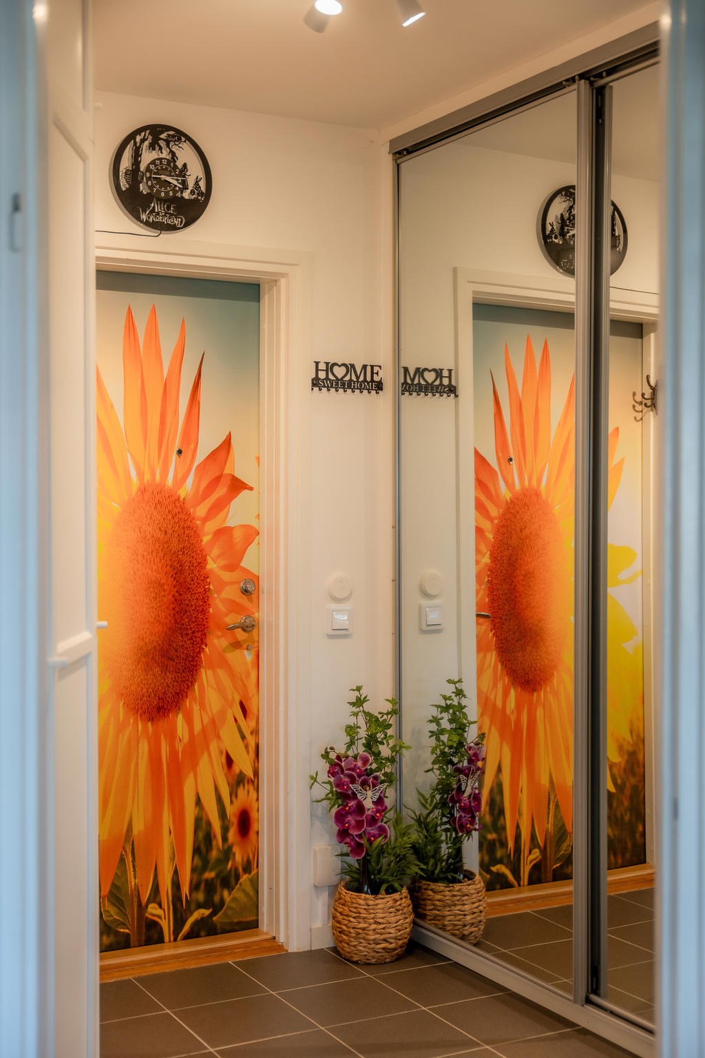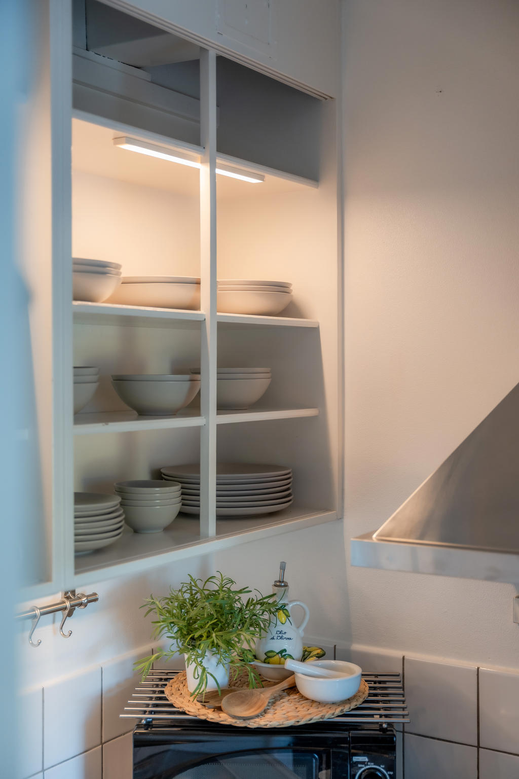 The apartment has been renovated and features new floors, walls, and shelving. Dimmable lighting has been installed in the main closet, kitchen, and bathroom, with preparations made for dimmable lighting in the living area as well. Energy-efficient LED lights are fitted throughout.