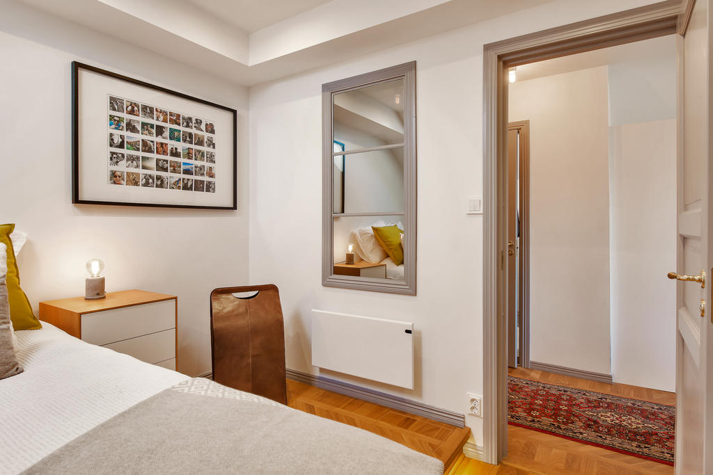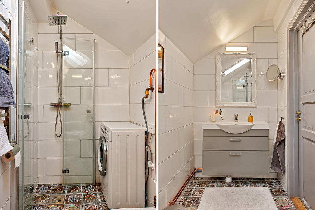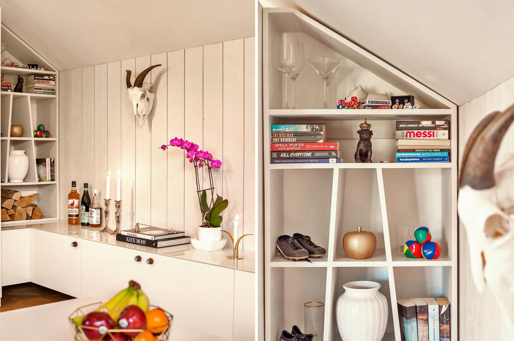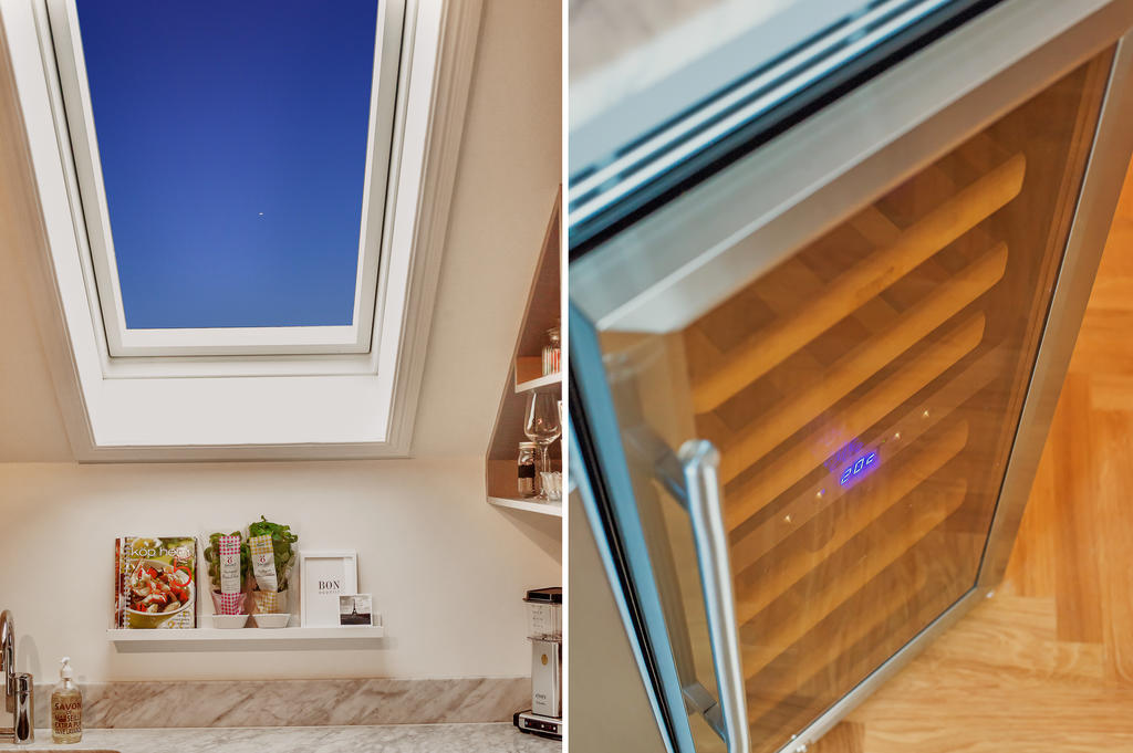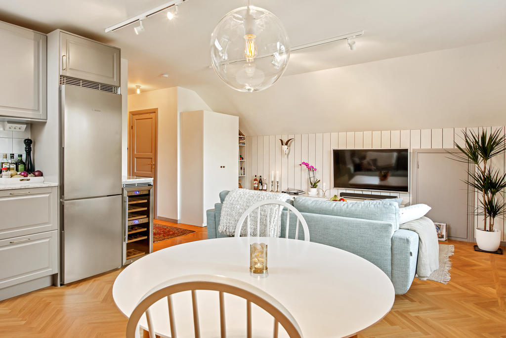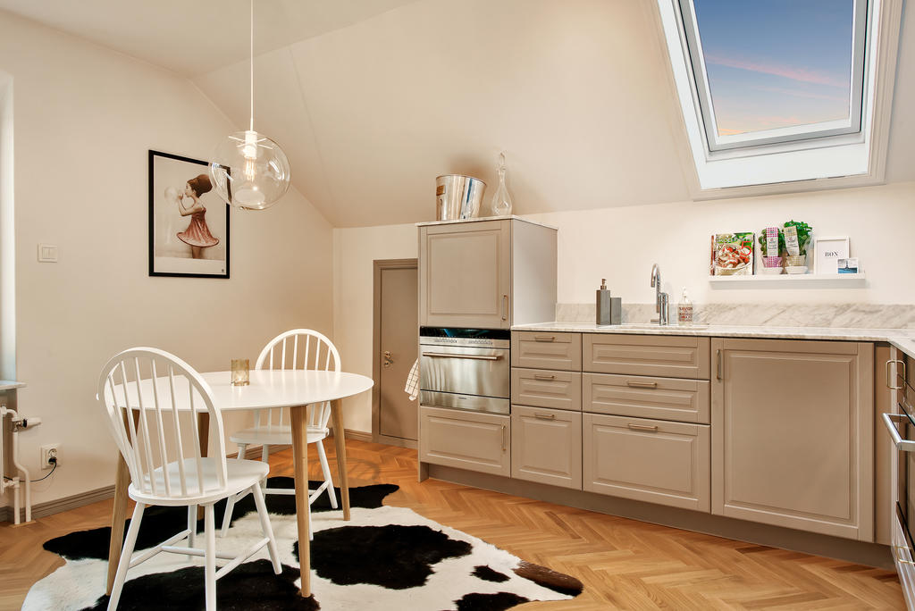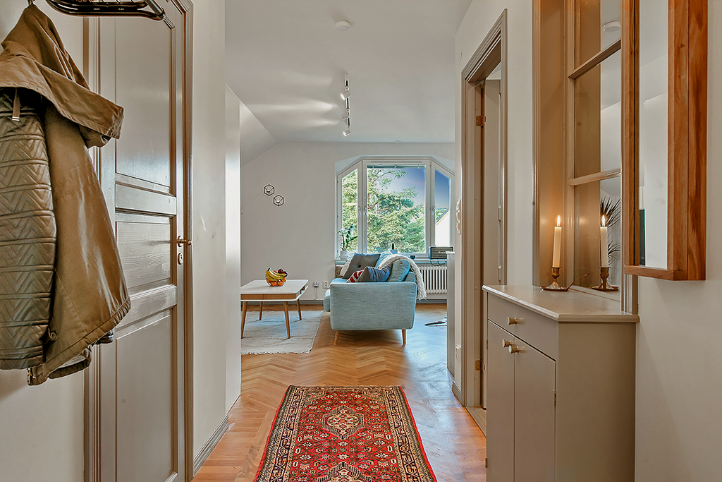 Lägenheten totalrenoverades 2015 och präglas av en tydlig röd tråd genom hela bostaden. Dörrarna och listverken i vacker grå ton harmonierar med kökets eleganta nyanser, vilket tillsammans med den enhetliga äkta stavparketten skapar ett exklusivt och sammanhållet uttryck. Köket är fullt utrustat med intrigerade vitvaror såsom diskmaskin och lyxig vinkyl. Både köksbänken och fönsterbrädorna är i vacker marmor som förstärker bostadens lyxiga känsla. De sociala ytorna är ljusa och öppna, med ett fantastiskt ljusinsläpp. I vardagsrummet finns en inbyggd bokhylla samt en smakfullt inbyggd tv-möbel med knoppar i samma stil – ytterligare en detalj som binder samman bostadens genomtänkta design. Vardagsrummet har eleganta dimbara spotlights, och även övrig belysning är till större delen dimbar. Det rofyllda sovrummet har ett dekorativt trappsteg med infälld belysning och ett fönster mot hallen som ger både ljus och rymd. Badrummet från 2015 är utfört i trendig marockansk stil med kopparfärgade rördetaljer samt bekvämligheter som golvvärme och tvättmaskin. Det finns också en torktumlare i bostaden. Mattvätt finns i bostadsrättsföreningens välutrustade tvättstuga. Bostaden har varit sporadiskt bebodd sedan den totalrenoverades och är väl bevarad och i fint skick.