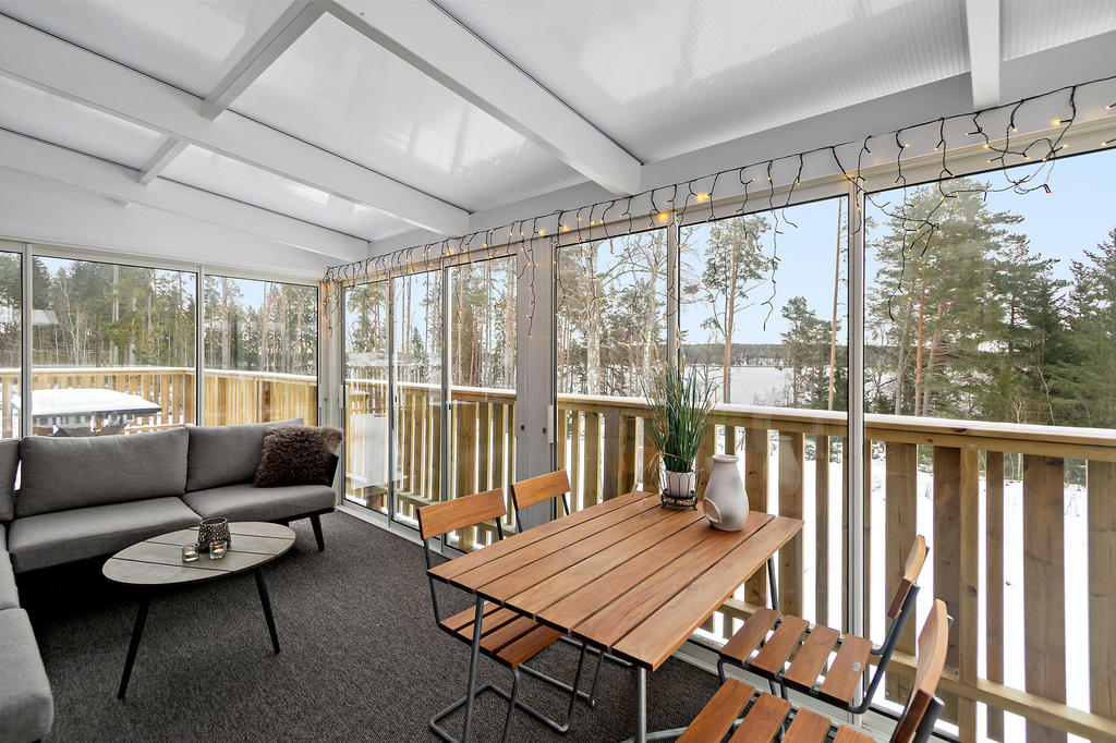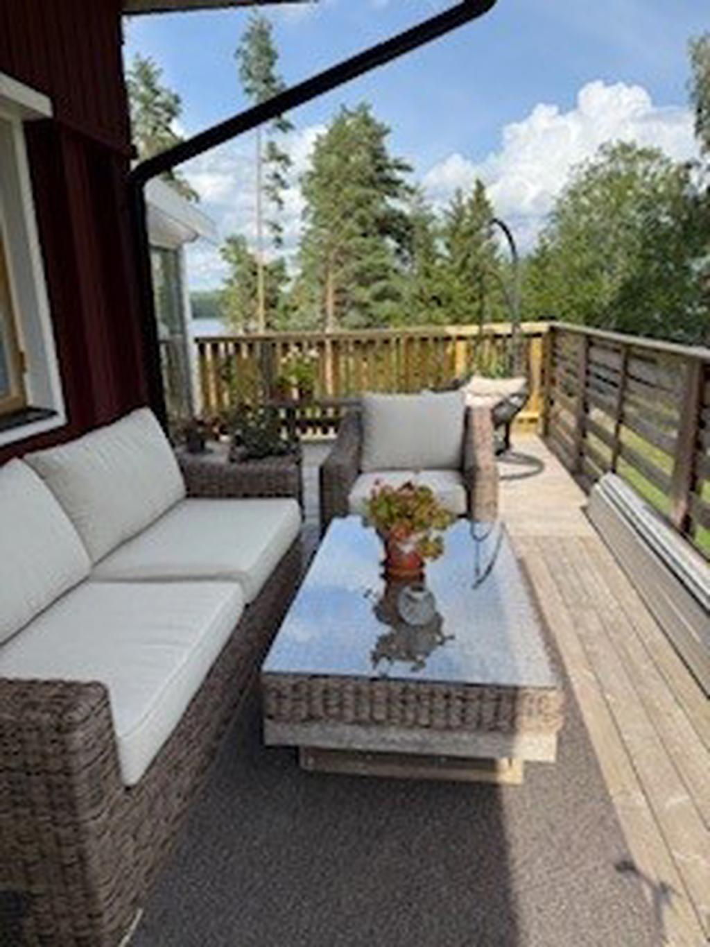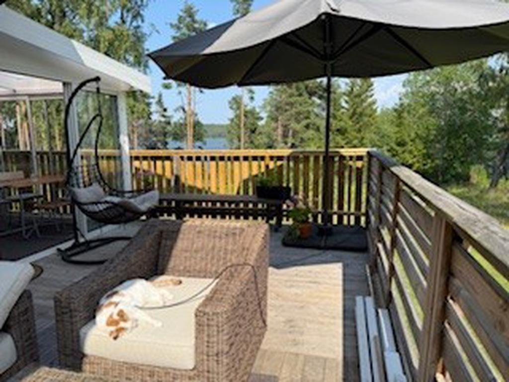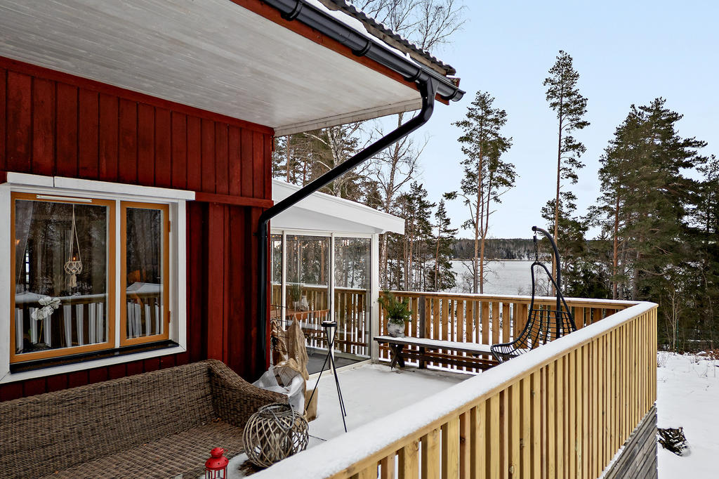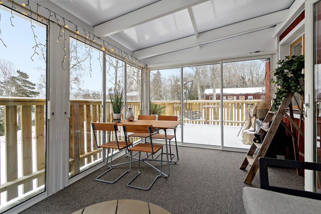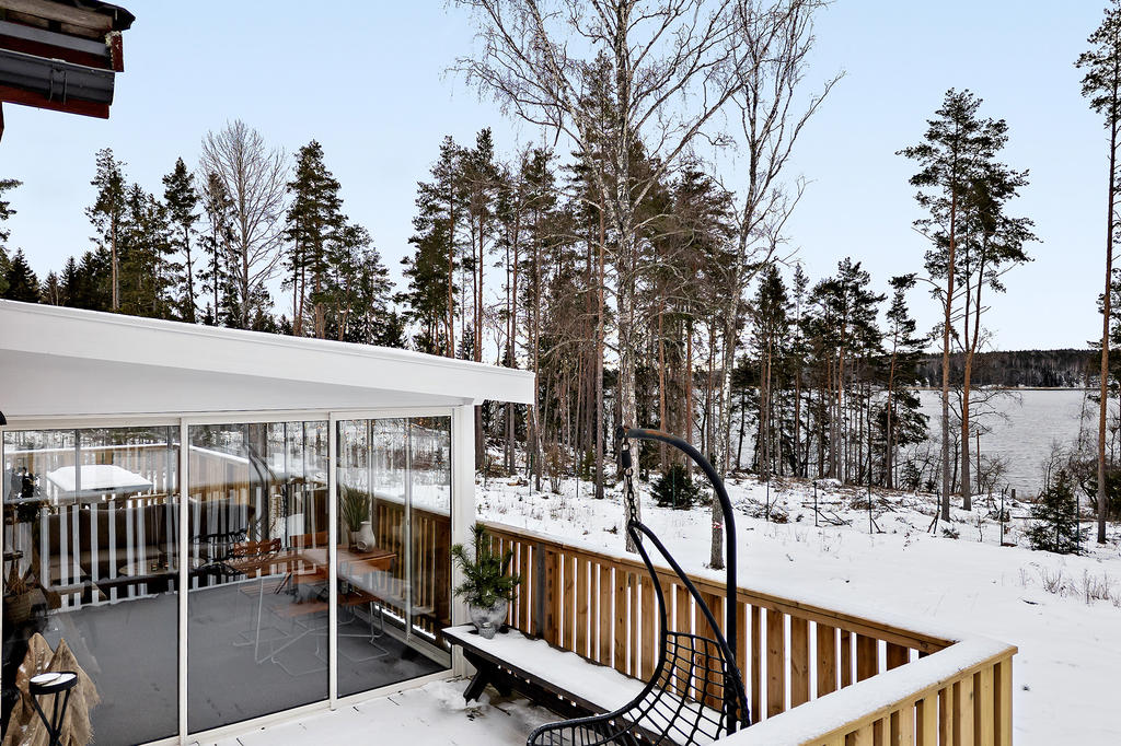 Bostaden har förädlats med ett välbyggt uterum om 15 kvm som kan nyttjas året om. Här har man underbar kontakt med skog och sjö. Vidare finns ett generöst trädäck om ca 60 kvm.