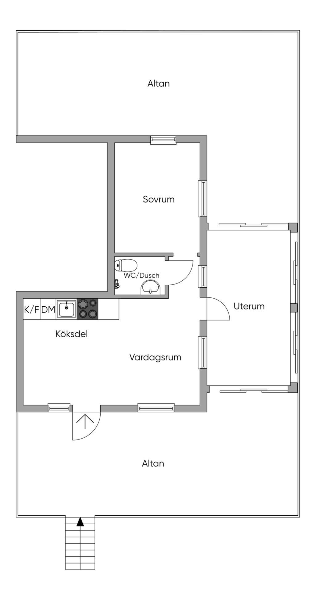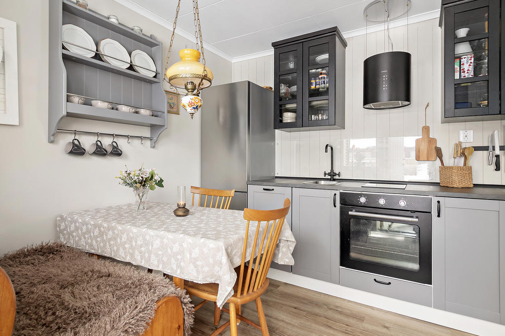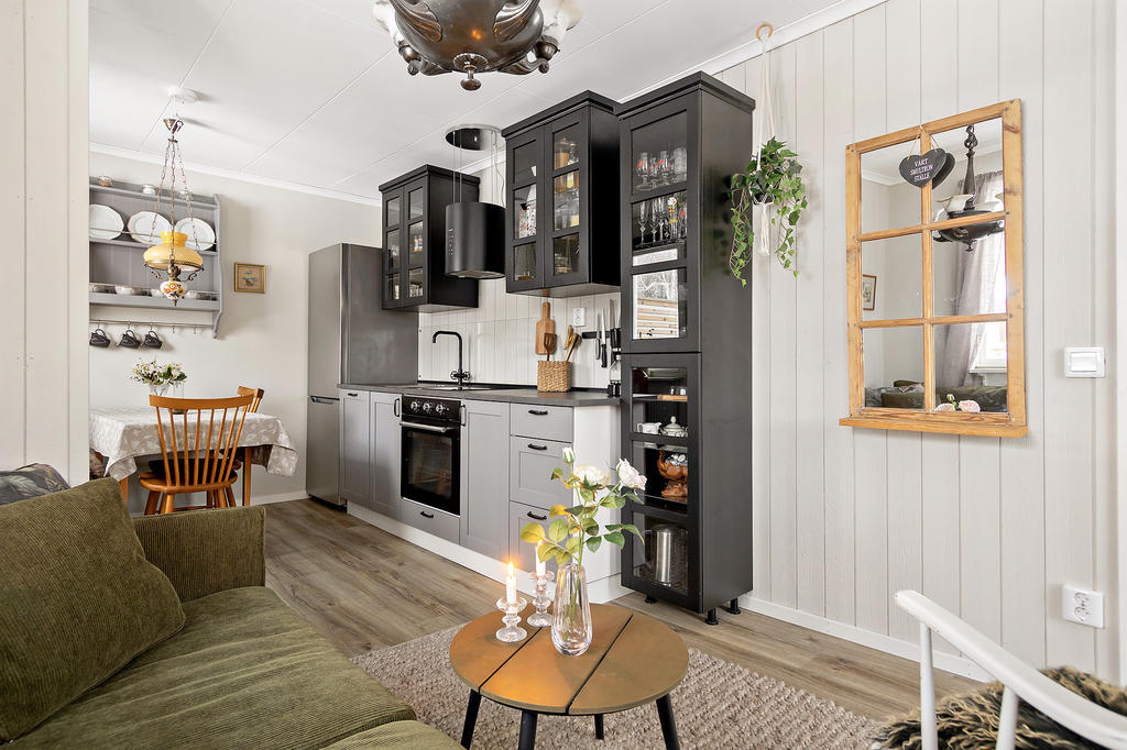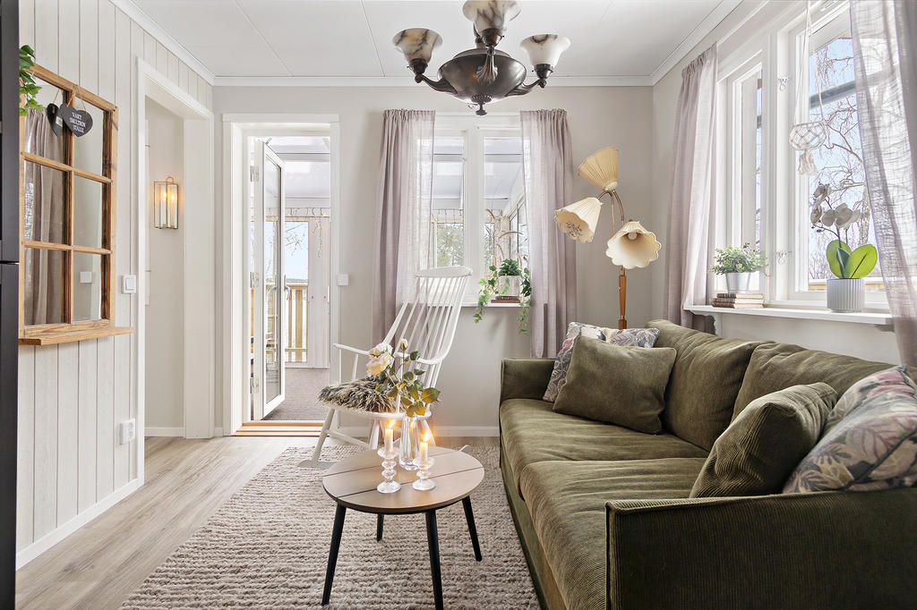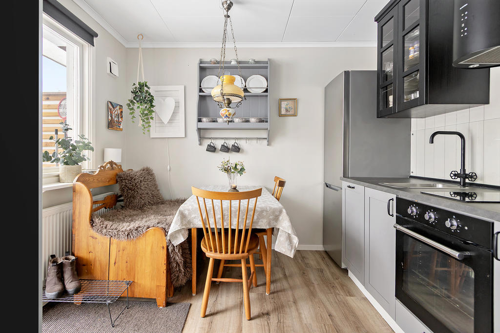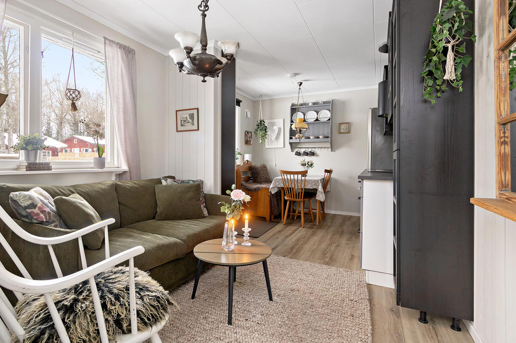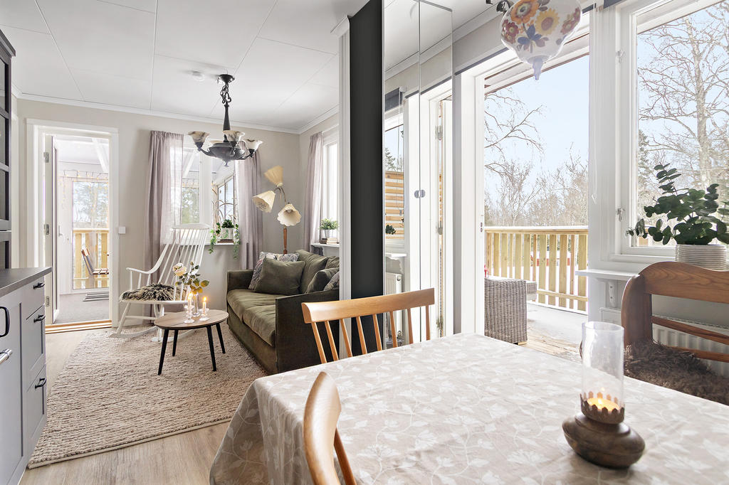 Interiört stoltserar bostaden med en ytterst väldisponerad planlösning. Härlig social yta med öppet mellan en fin köksdel, matplats och vardagsrum, en helglasad altandörr leder ut till uterummet. Väl tilltaget uterum, skjutdörrar i glas som gör att man kan öppna upp under den varma säsongen.