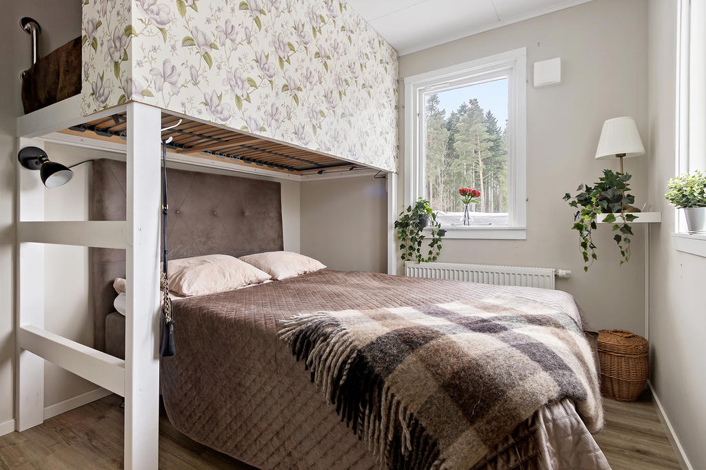 Trivsamt sovrum som rymmer en dubbelsäng och ytterligare möblemang samt ett smart platsbyggd sovloft.