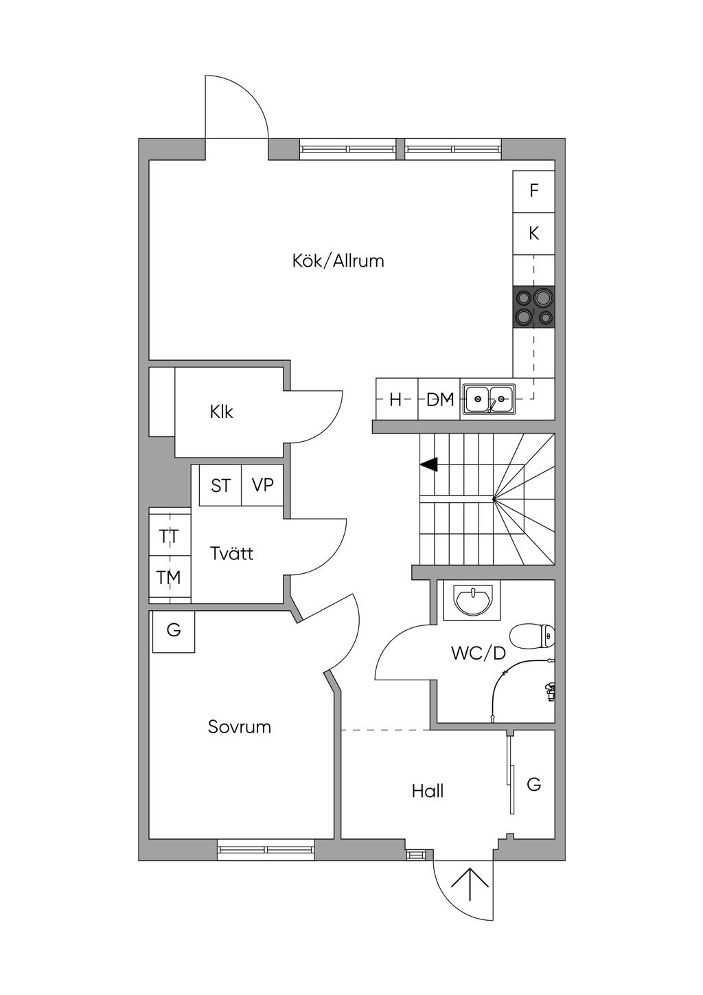 Redan på framsidan välkomnas du av en stenbelagd altan med plats för utemöbler, en härlig plats för kvällsfikat eller en lugn stund i solen. När du kliver in i hallen möts du av en ljus, inbjudande och praktisk entré med ljusa väggar och mörkt klinkergolv med golvvärme. Här finns gott om förvaring och bra avhängningsmöjligheter. Det moderna köket är bostadens hjärta, ljust, socialt och fullt utrustat med rostfria vitvaror såsom spishäll, diskmaskin, kyl, frys, mikrovågsugn och fläkt. De ljusa skåpluckorna, de generösa arbetsytorna och den rymliga matplatsen gör detta till en självklar samlingspunkt för både vardagsmiddag och helgens festmåltid. Vardagsrummet erbjuder en luftig och trivsam atmosfär med fint ljusinsläpp, ljusa väggar och ekparkett. Här finns gott om plats för både soffgrupp och matmöbler, en optimal yta för umgänge och familjeliv. Från vardagsrummet nås den bakre altanen med trätrall, insynsskyddad oas med sol under eftermiddag och kvällstimmar, idealisk för grillkvällar eller avkoppling i loungemöbeln. Idealisk plats där man kan gå barfota i gräset. På entréplanet finns även ett stilrent badrum med klinkergolv, ljus kakel, dusch, handfat med kommod, golvvärme och spotlights. På samma plan finns även en praktisk tvättstuga med både tvättmaskin, torktumlare och arbetsyta. Perfekt för att underlätta vardagen.