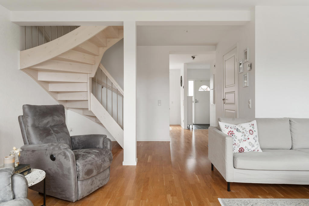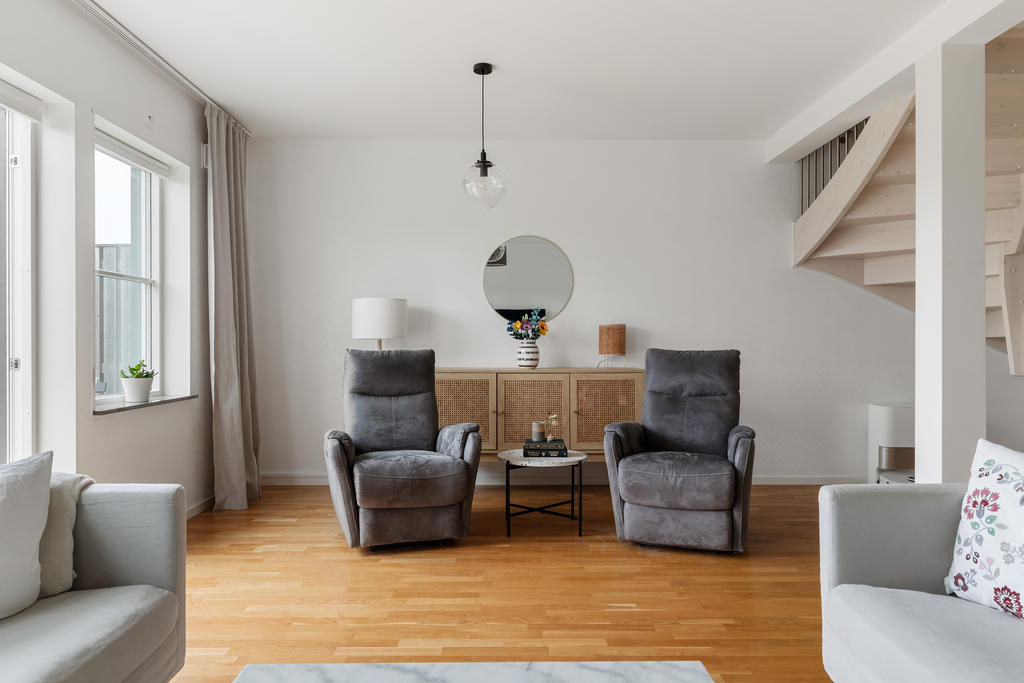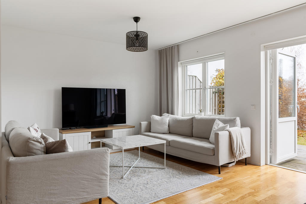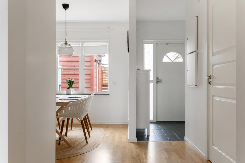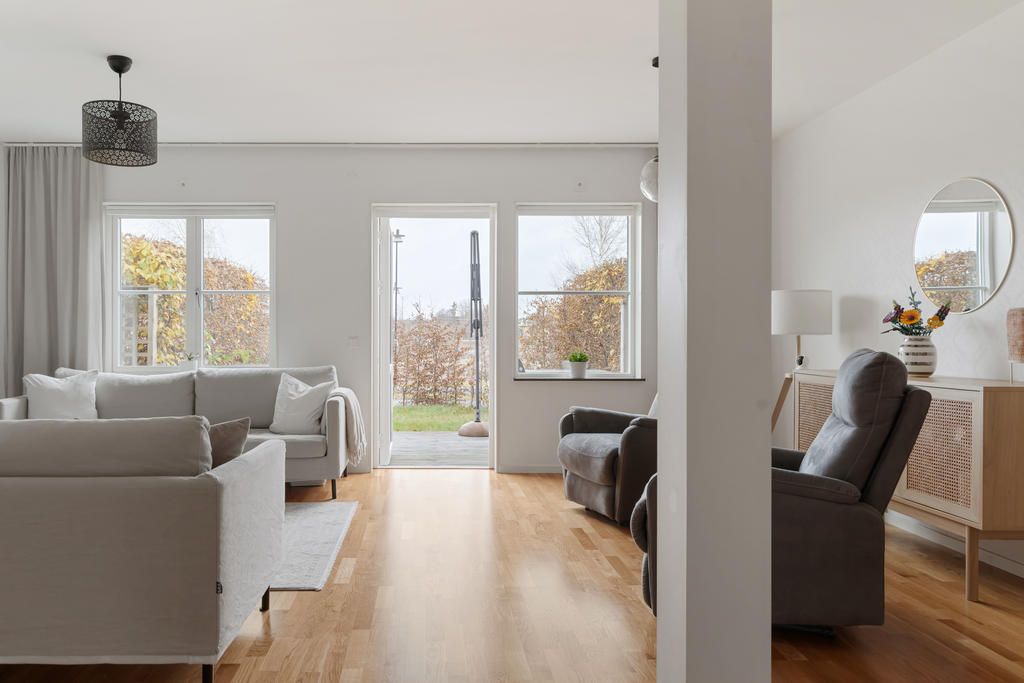 Redan på framsidan välkomnas du av en stenbelagd altan med plats för utemöbler, en härlig plats för morgonkaffet eller en lugn stund i solen. När du kliver in i hallen möts du av en ljus, inbjudande och praktisk entré med vita väggar och mörkt klinkergolv med golvvärme. Här finns gott om förvaring i garderob med skjutdörrar och bra avhängningsmöjligheter. Det moderna köket är bostadens hjärta, ljust, socialt och fullt utrustat med rostfria vitvaror såsom induktionshäll, diskmaskin, kyl, frys, mikrovågsugn och fläkt. De vita skåpluckorna, de generösa arbetsytorna och den rymliga matplatsen gör detta till en självklar samlingspunkt för både vardagsmiddag och helgens festmåltid. Vardagsrummet erbjuder en luftig och trivsam atmosfär med fint ljusinsläpp, vita väggar och ekparkett. Här finns gott om plats för både soffgrupp och matmöbler, en optimal yta för umgänge och familjeliv. Från vardagsrummet nås den bakre altanen med trätrall, insynsskyddad oas med sol under eftermiddag och kväll, idealisk för grillkvällar eller avkoppling i loungemöbeln. På entréplanet finns även ett stilrent badrum med klinkergolv, vitt kakel, dusch, handfat med kommod, golvvärme och spotlights, samt en praktisk tvättstuga med både tvättmaskin, torktumlare och arbetsyta.