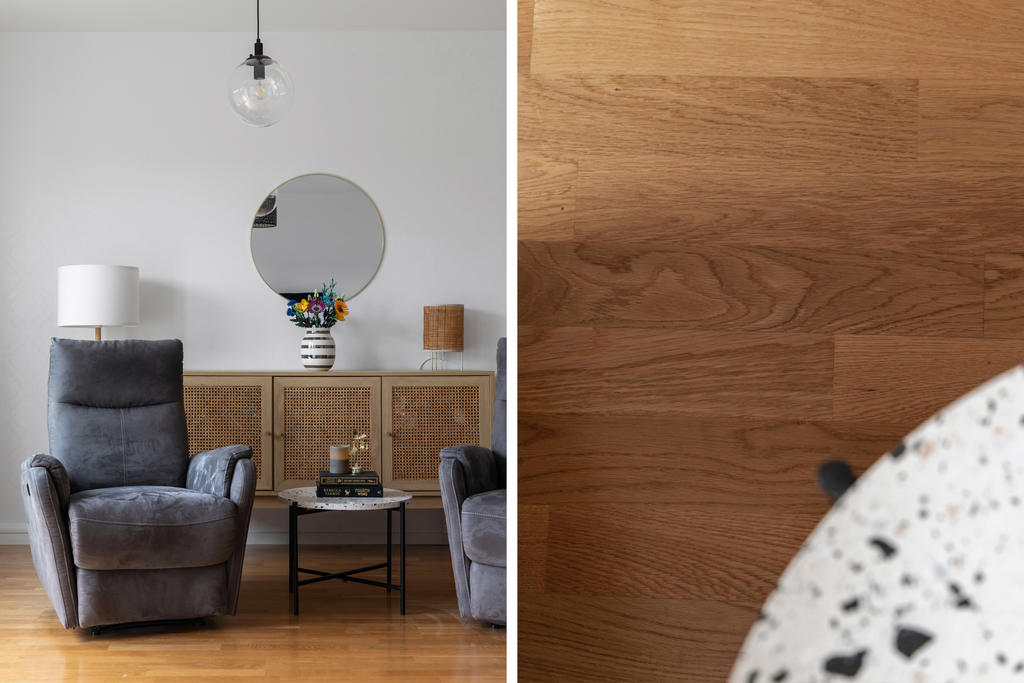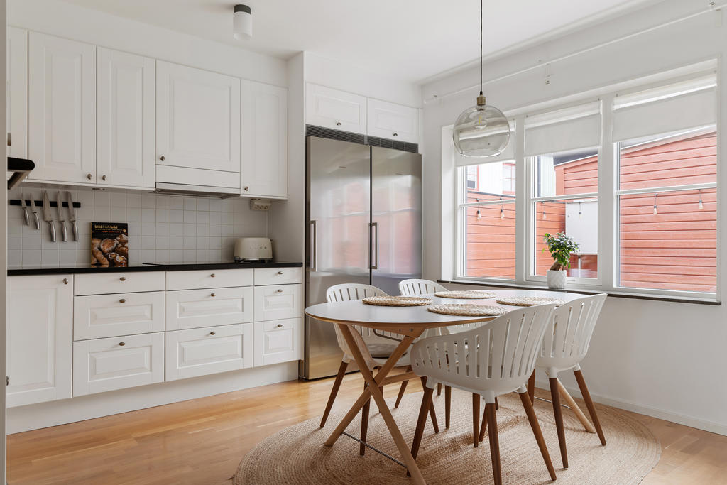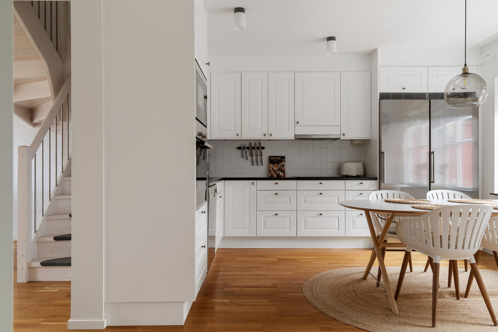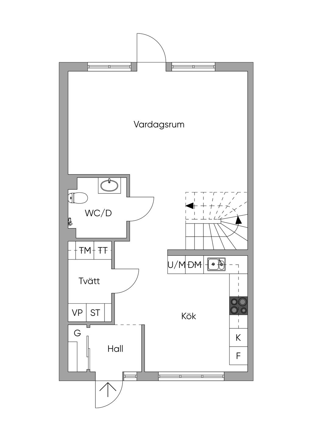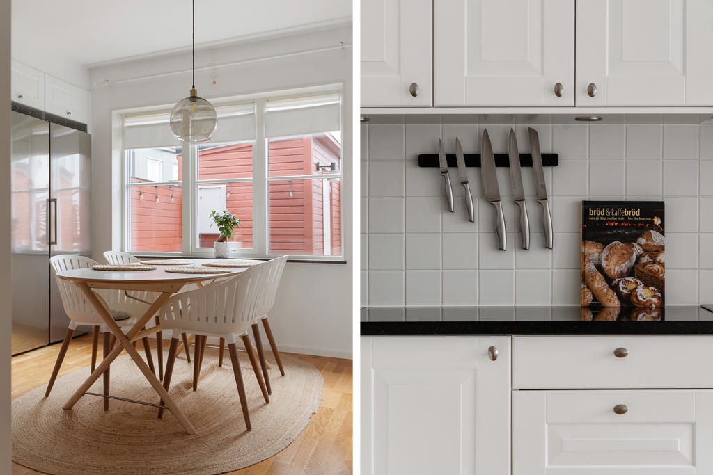 Redan på framsidan välkomnas du av en stenbelagd altan med plats för utemöbler, en härlig plats för morgonkaffet eller en lugn stund i solen. När du kliver in i hallen möts du av en ljus, inbjudande och praktisk entré med vita väggar och mörkt klinkergolv med golvvärme. Här finns gott om förvaring i garderob med skjutdörrar och bra avhängningsmöjligheter. Det moderna köket är bostadens hjärta, ljust, socialt och fullt utrustat med rostfria vitvaror såsom induktionshäll, diskmaskin, kyl, frys, mikrovågsugn och fläkt. De vita skåpluckorna, de generösa arbetsytorna och den rymliga matplatsen gör detta till en självklar samlingspunkt för både vardagsmiddag och helgens festmåltid. Vardagsrummet erbjuder en luftig och trivsam atmosfär med fint ljusinsläpp, vita väggar och ekparkett. Här finns gott om plats för både soffgrupp och matmöbler, en optimal yta för umgänge och familjeliv. Från vardagsrummet nås den bakre altanen med trätrall, insynsskyddad oas med sol under eftermiddag och kväll, idealisk för grillkvällar eller avkoppling i loungemöbeln. På entréplanet finns även ett stilrent badrum med klinkergolv, vitt kakel, dusch, handfat med kommod, golvvärme och spotlights, samt en praktisk tvättstuga med både tvättmaskin, torktumlare och arbetsyta.
