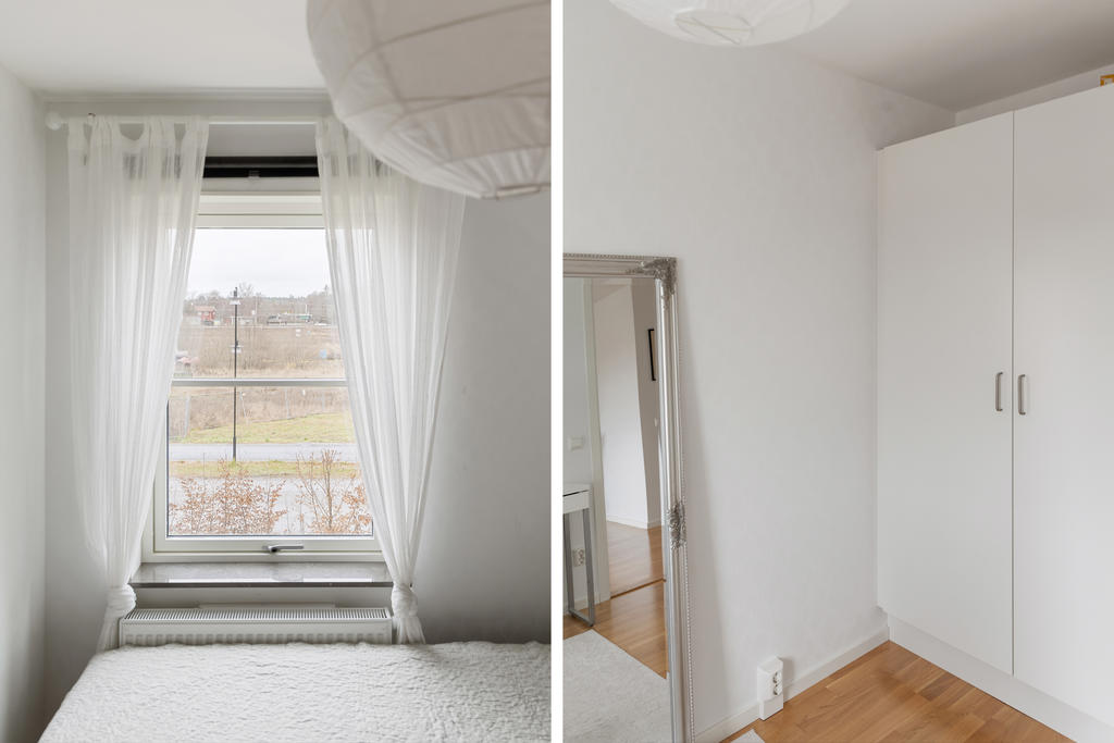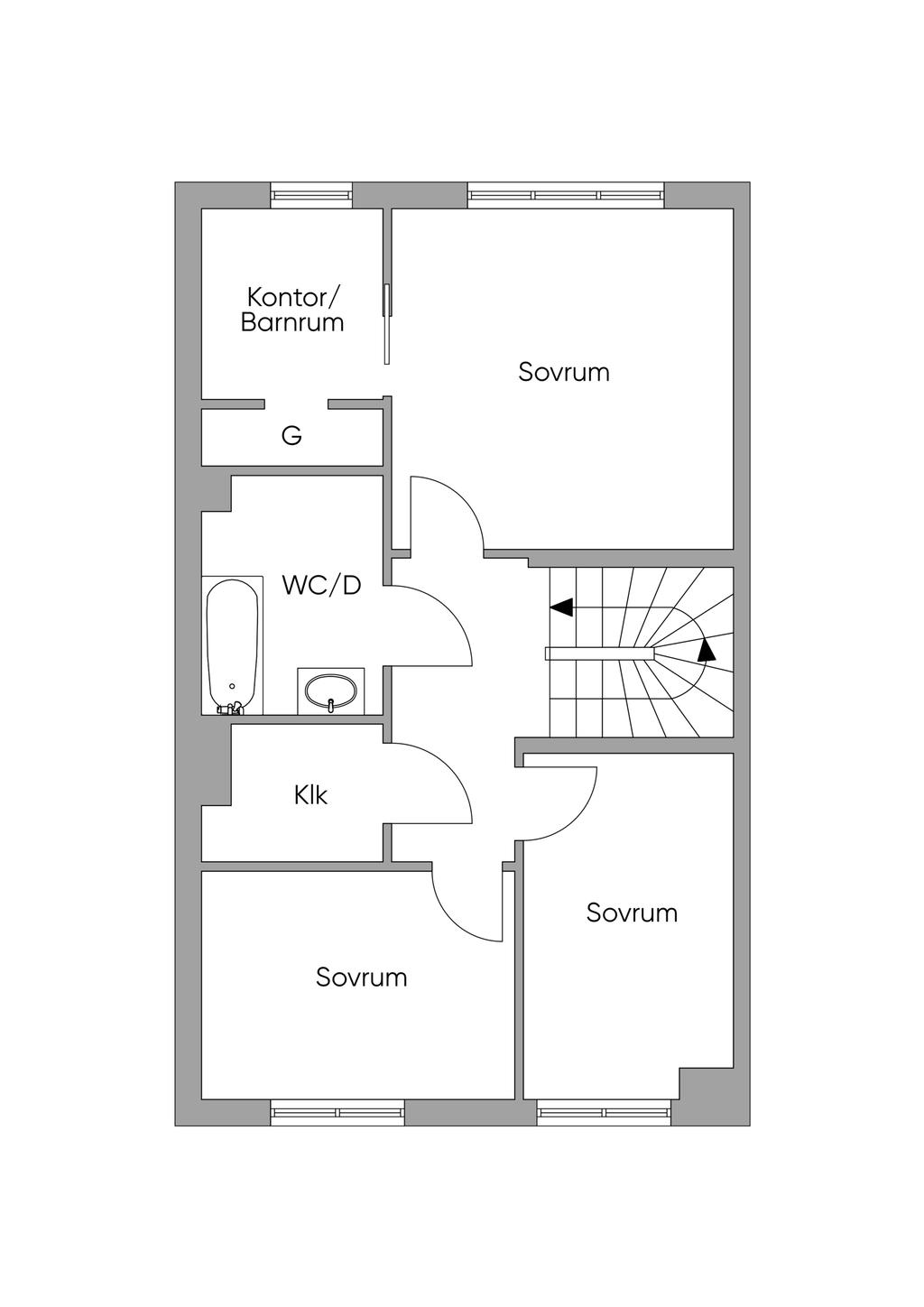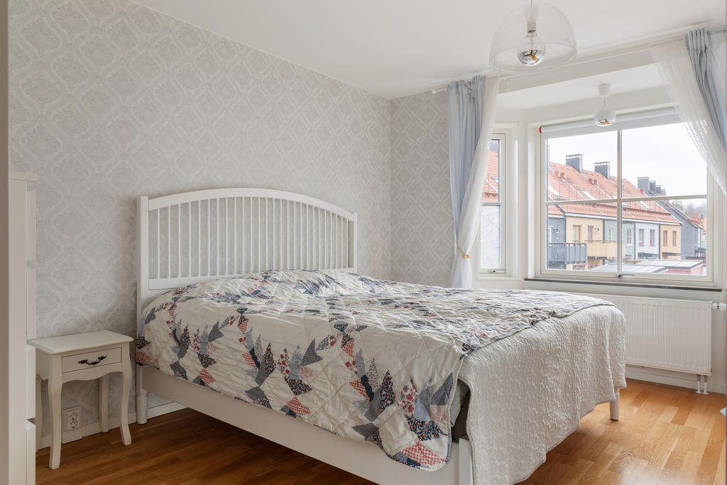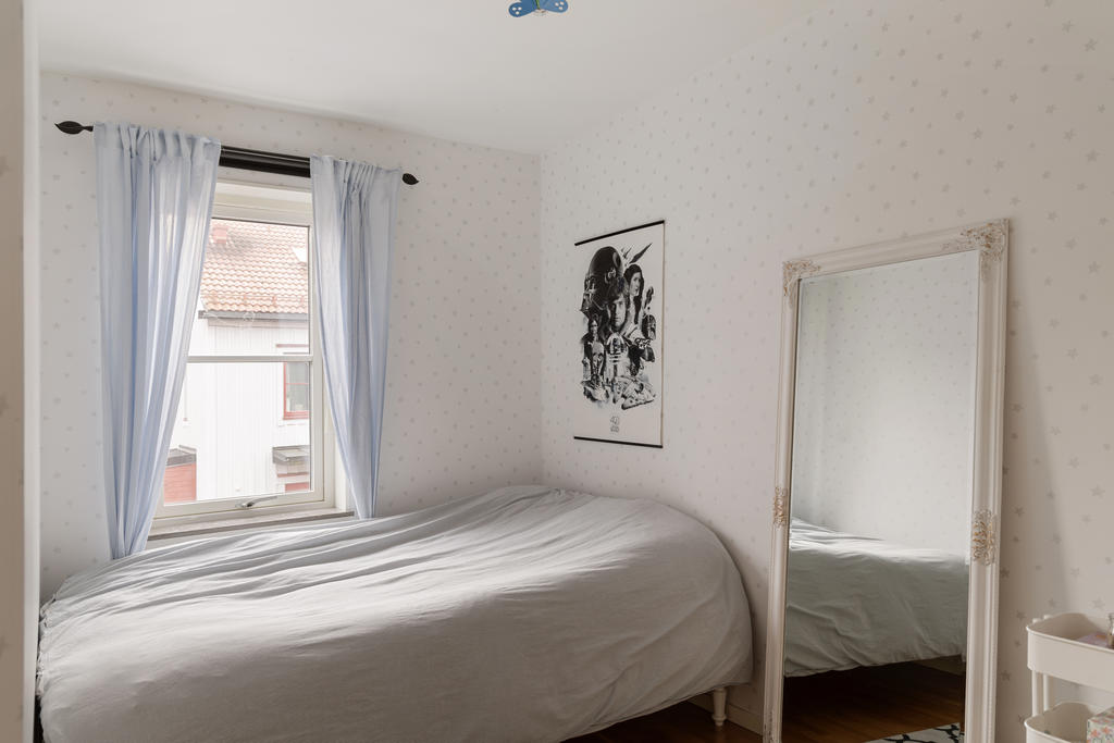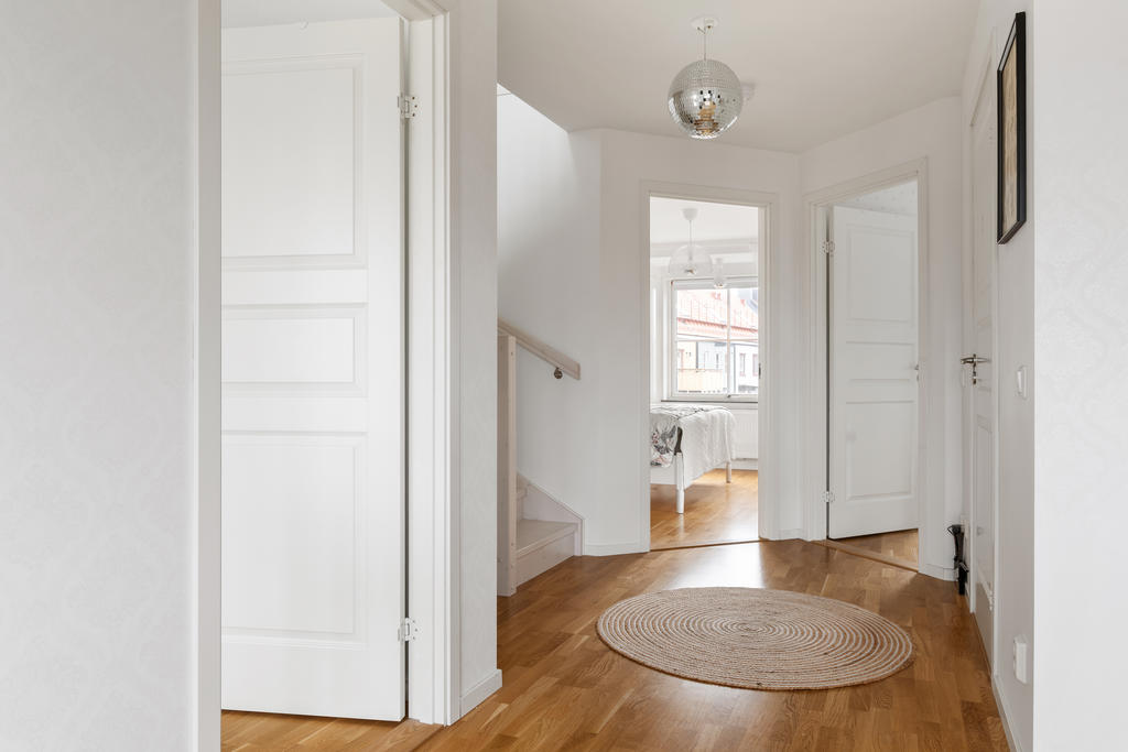 Det övre planet bjuder på hela fyra sovrum, utformat för familjen som behöver många rum eller önskar plats för kontor och gästrum. Master bedroom har platsbyggda garderober, vackert ljusinsläpp och plats för dubbelsäng. De tre övriga sovrummen är ljusa, charmiga och flexibla, utmärkta som barnrum, gästrum eller hemmakontor. Alla rum har ljusa väggar och ekparkettgolv som skapar en harmonisk helhet. Här finns även ett stort, fräscht badrum med vitt kakel, mörkt klinkergolv och badkar, idealiskt plats för kvällsbadet eller en stunds avkoppling.