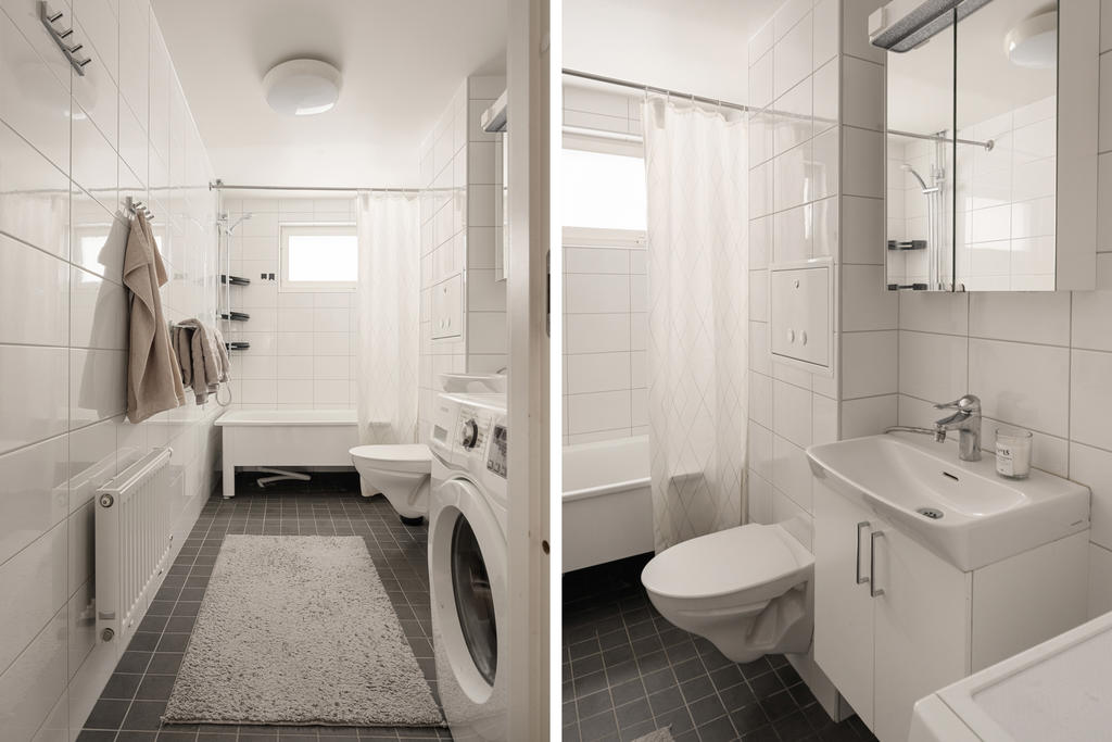 Det helkaklade badrummet är stambytt och i gott skick, utrustat med dusch, wc, handfat samt förvaringsskåp som gör vardagen smidig.