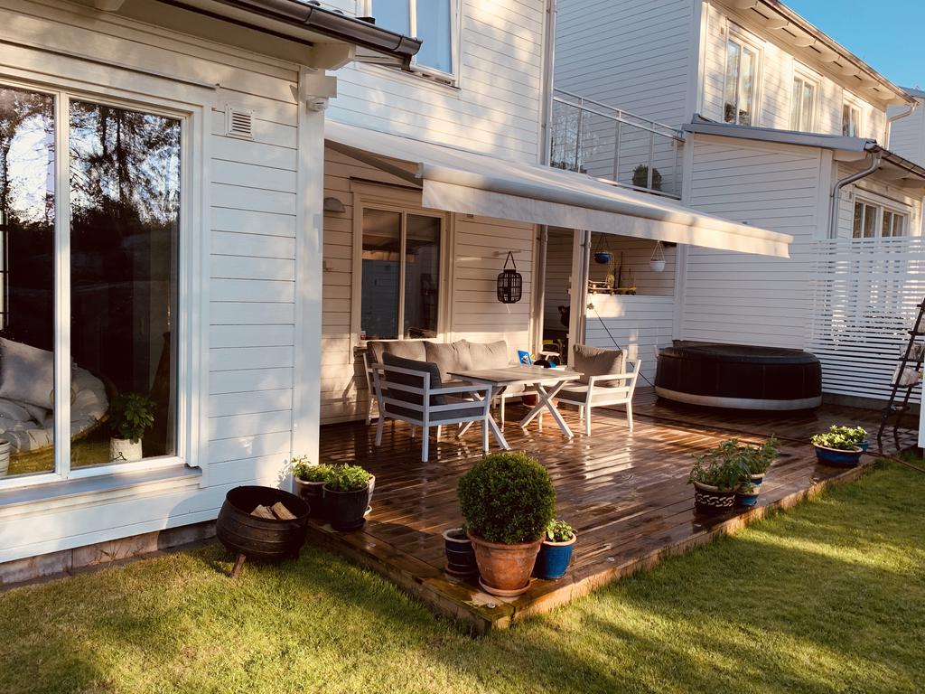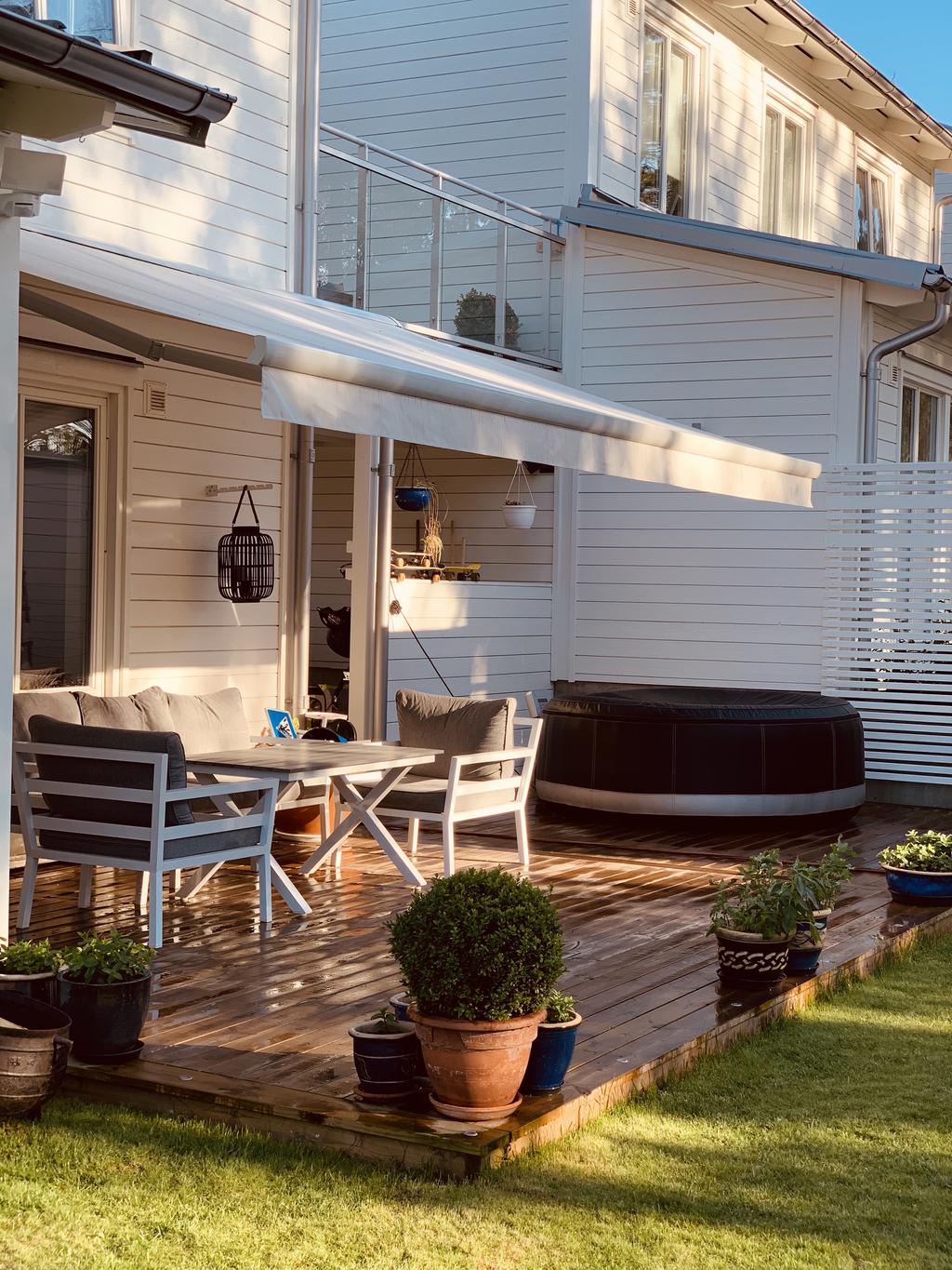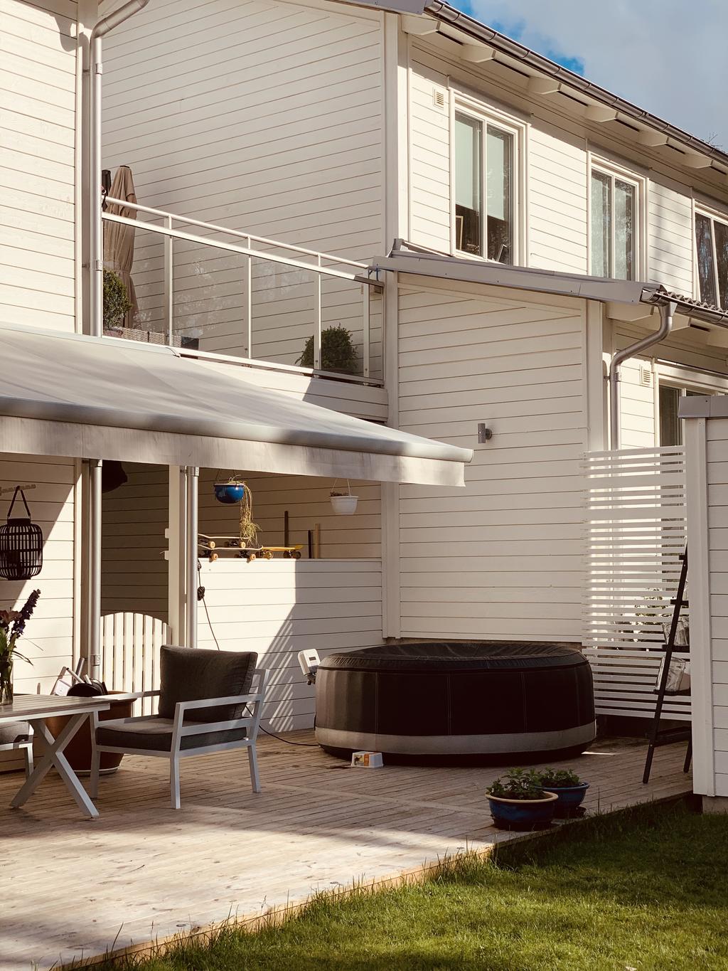 Terassen erbjuder många möjligheter för alla i familjen att umgås. Hängmattorna under sommaren är ett måste. Altanen, gräsmattan och vår spa pool har gett oss många skratt och lekfulla stunder.