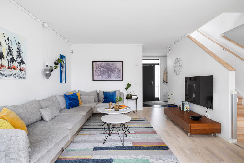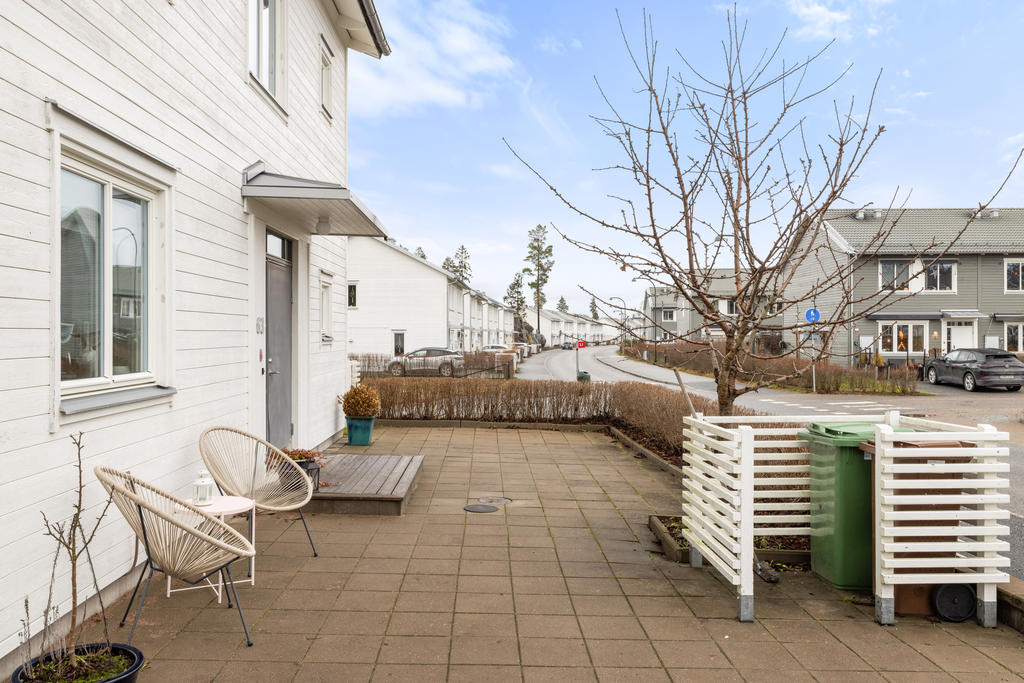 När man byggt radhuset så har stort fokus legat på familjelivet. Snygg design där funktionalitet möter dagens standard. Trevlig och välkomnande framsida med plats för fina utemöbler. Väl inne så finns de sociala rummen på entréplan och trevlig takhöjd på 2,5m. Rymligt vardagsrum med utgång till husets mysiga baksida. Här kan du njuta av att vara ute tillsammans med familj och vänner. Träaltan som övergår till större gräsmatta. Plats för umgänge, härliga utemöbler, studsmatta och varma sommardagar. Vill barnen ha mer plats finns natur i anslutning till baksidan och en lekpark på andra sidan gatan. Köket har hög klass med generösa ytor där smakrika måltider kan lagas. Plats finns för större matbord och socialt umgänge kring köksön. På entréplan finns även familjebadrummet med tvättmöjligheter.