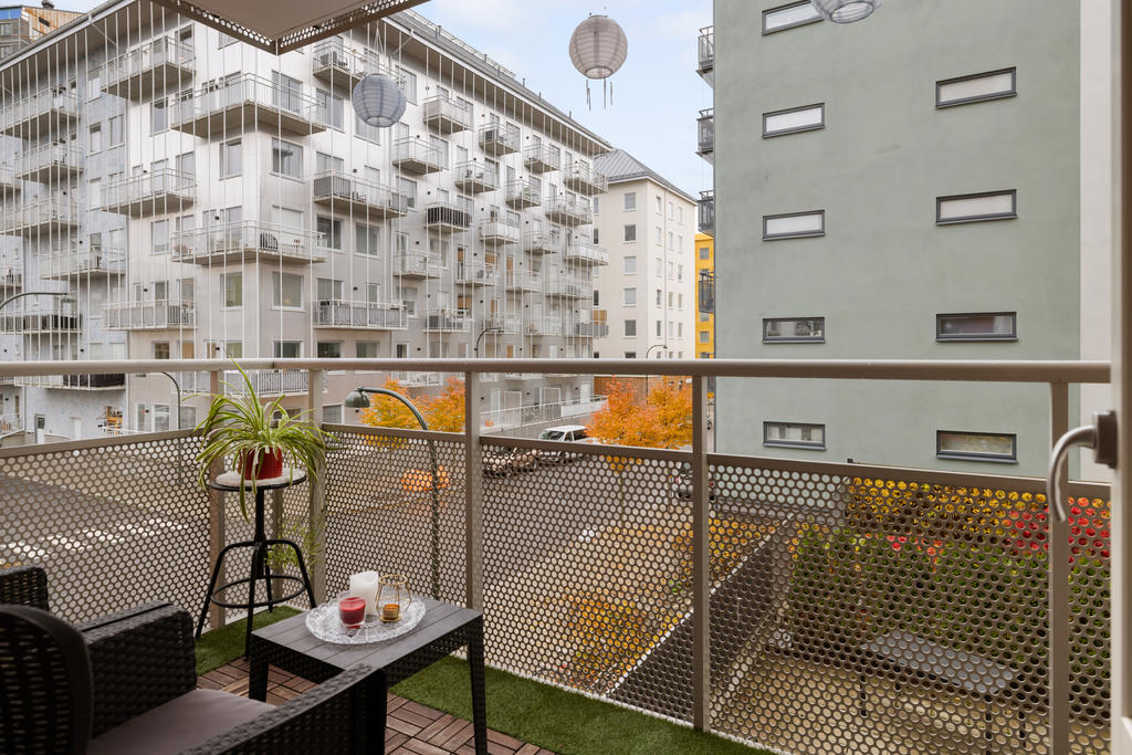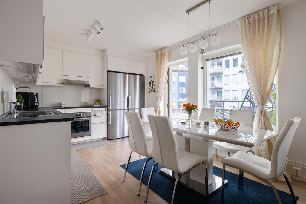 Den öppna planlösningen mellan kök och vardagsrum bjuder in till sociala stunder och umgänge. Från rummet når du en av bostadens två balkonger – idealisk för middagar i kvällssolen. Den andra balkongen, med utgång från master bedroom, vetter mot föreningens grönskande innergård och erbjuder en lugn oas för avkoppling.