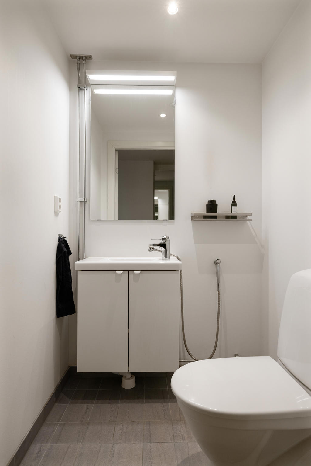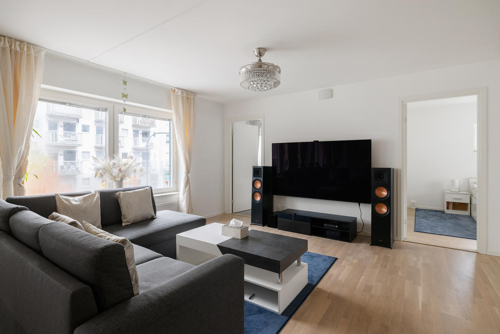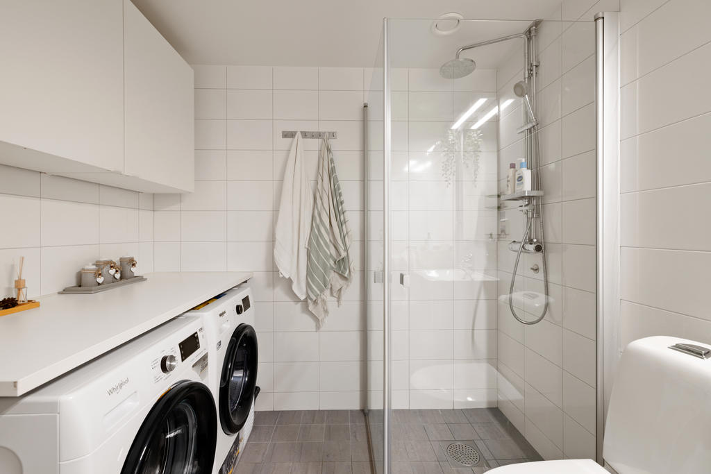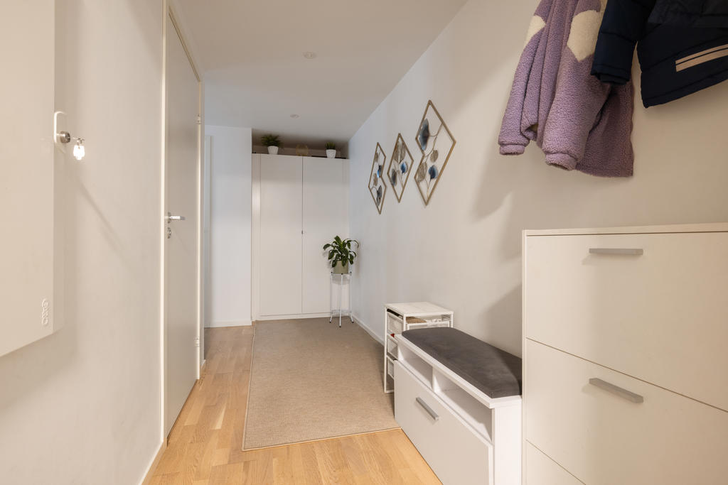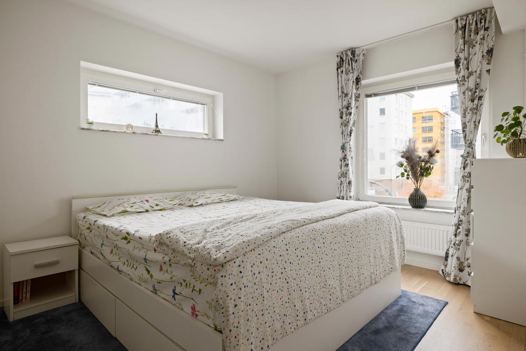 Lägenheten rymmer tre rymliga sovrum med bra förvaringsmöjligheter och plats för både vila och arbete. Badrummet är stilrent och utrustat med både tvättmaskin och torktumlare, och dessutom finns en separat gäst-WC för extra bekvämlighet.