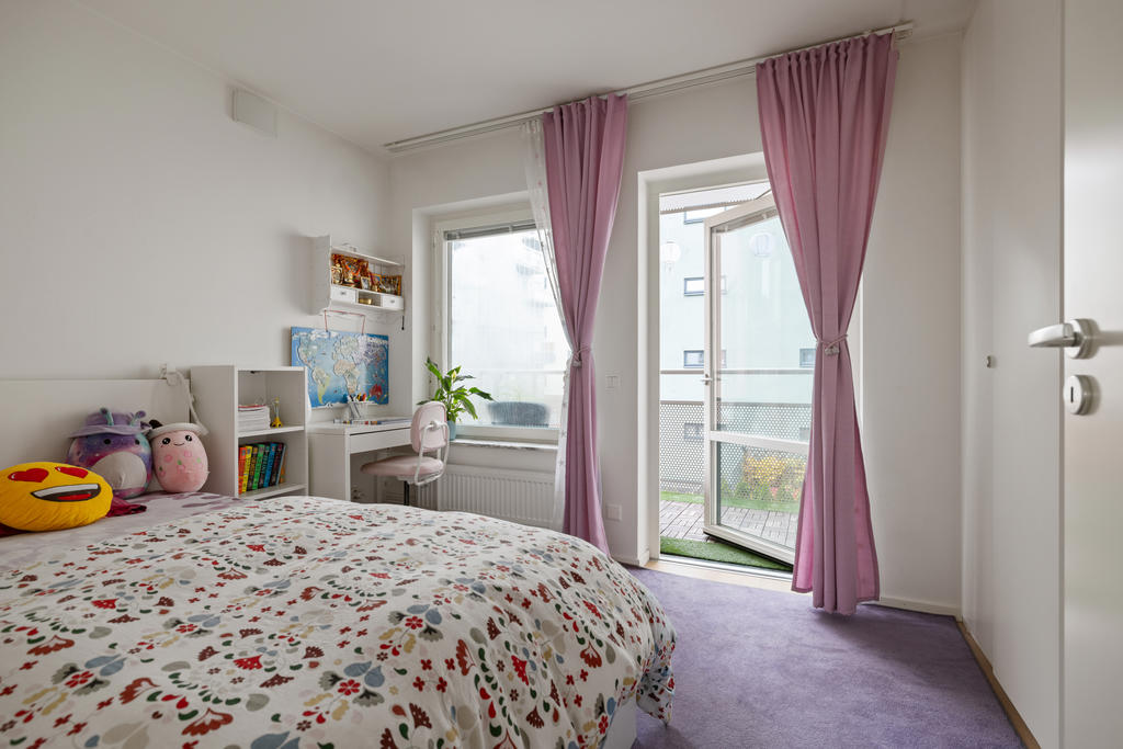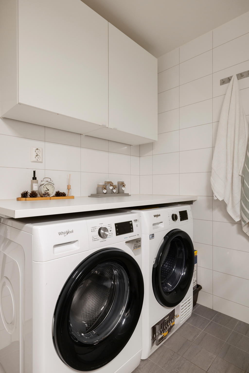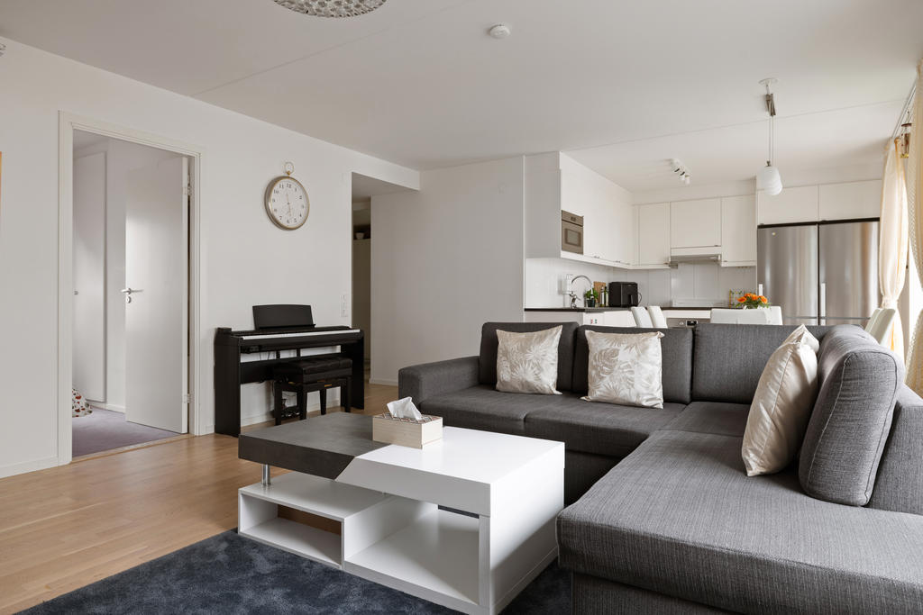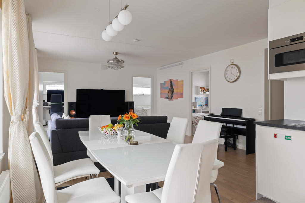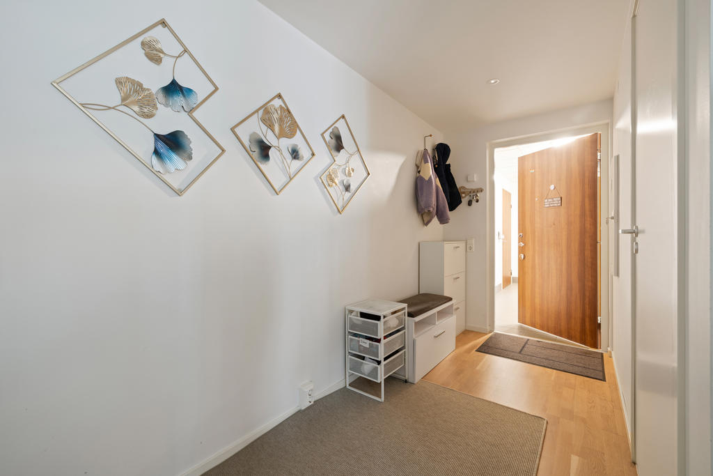 Lägenheten rymmer tre rymliga sovrum med bra förvaringsmöjligheter och plats för både vila och arbete. Badrummet är stilrent och utrustat med både tvättmaskin och torktumlare, och dessutom finns en separat gäst-WC för extra bekvämlighet.
