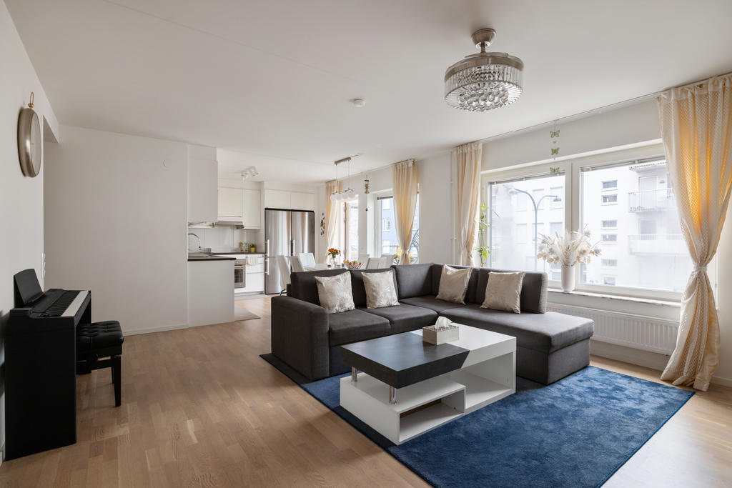 Lägenheten rymmer tre rymliga sovrum med bra förvaringsmöjligheter och plats för både vila och arbete. Badrummet är stilrent och utrustat med både tvättmaskin och torktumlare, och dessutom finns en separat gäst-WC för extra bekvämlighet.