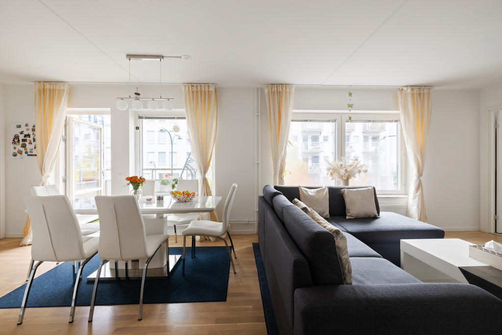85 kvm med 4 rum (3 sovrum + vardagsrum) erbjuder flexibilitet för växande familj, hemmakontor eller gäster. Öppen vardagsrum-köksplanlösning skapar social atmosfär – samlingspunkten för daglig gemenskap. Modernt badrum med tvättmaskin och torktumlare sparar tiden på att bära ned tvätt. Separat gäst-WC för extra bekvämlighet. Goda förvaringsmöjligheter med garderober, klädkammare och källarförråd.