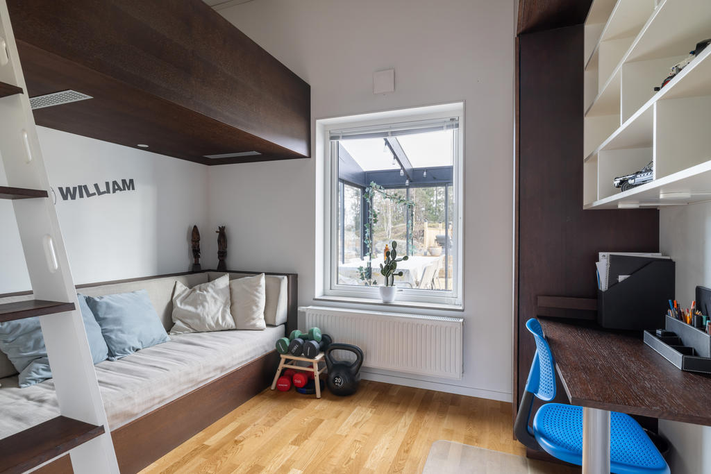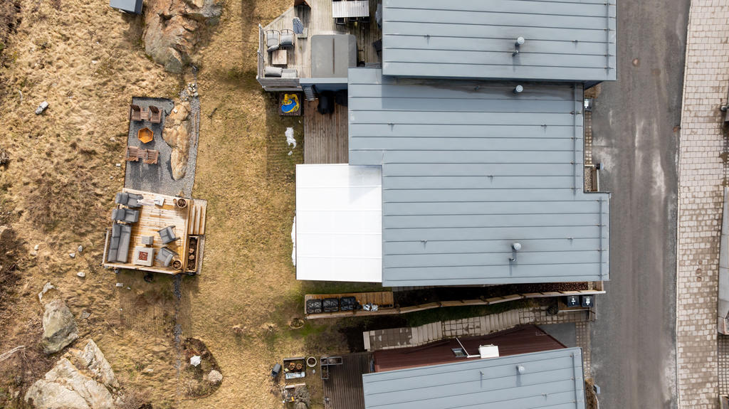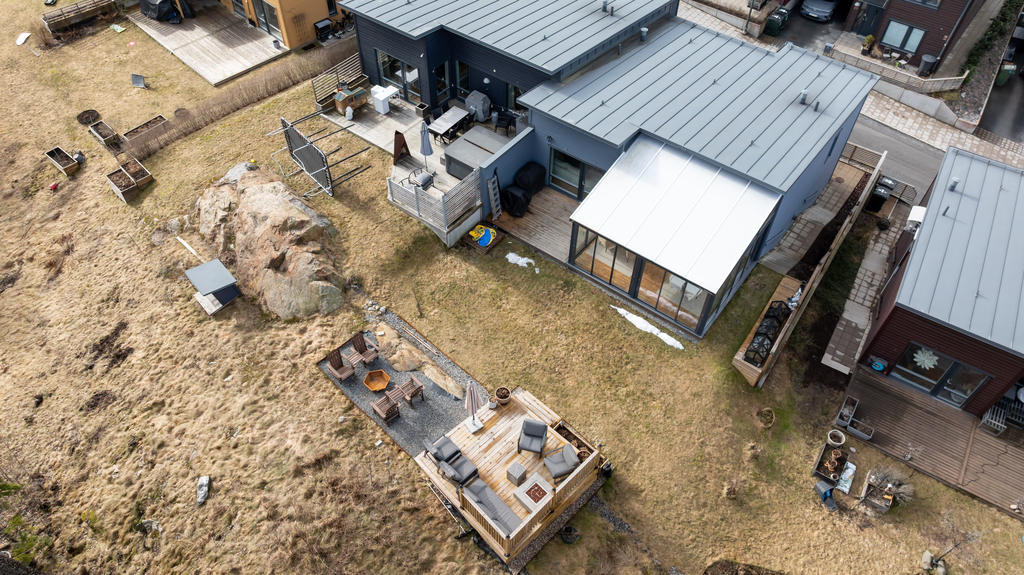 På övre plan har man sociala rum i öppen planlösning. Den generösa takhöjden tillsammans med stora fönster ger rymd och en öppen känsla. Här kan familjeliv och sociala tillställningar samsas i det exklusiva köket och mysiga vardagsrummet. Från vardagsrummet finns även utgång till husets baksida samt uterummet. Uterummet är en fantastisk plats med gott om utrymme för trevliga tillställningar eller en kopp te när det regnar ute. Tomten är en skyddad oas där man kan njuta av att vara ute och se barnen leka. Rymlig altan som övergår till gräsmatta och sedan naturområde. Generöst med sol och ingen insyn tack vare det höga läget. Övre plan har även tre bra sovrum samt fint badrum för familjen.