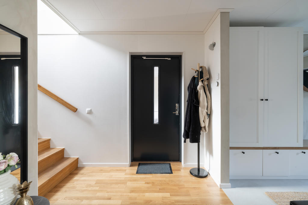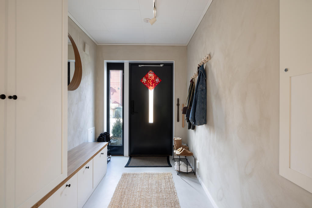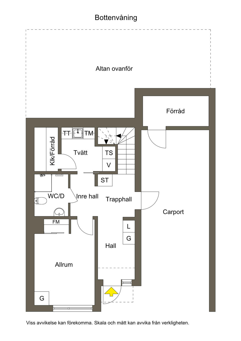 Välkomnande entré med plats för utemöbler. Här finns carport och plats för två bilar. Väl inne så erbjuder entréplan en rymlig hall, snyggt designat badrum, förråd och tvättstuga. Här finns även ett större rum som idag används som master bedroom med massa förvaring.