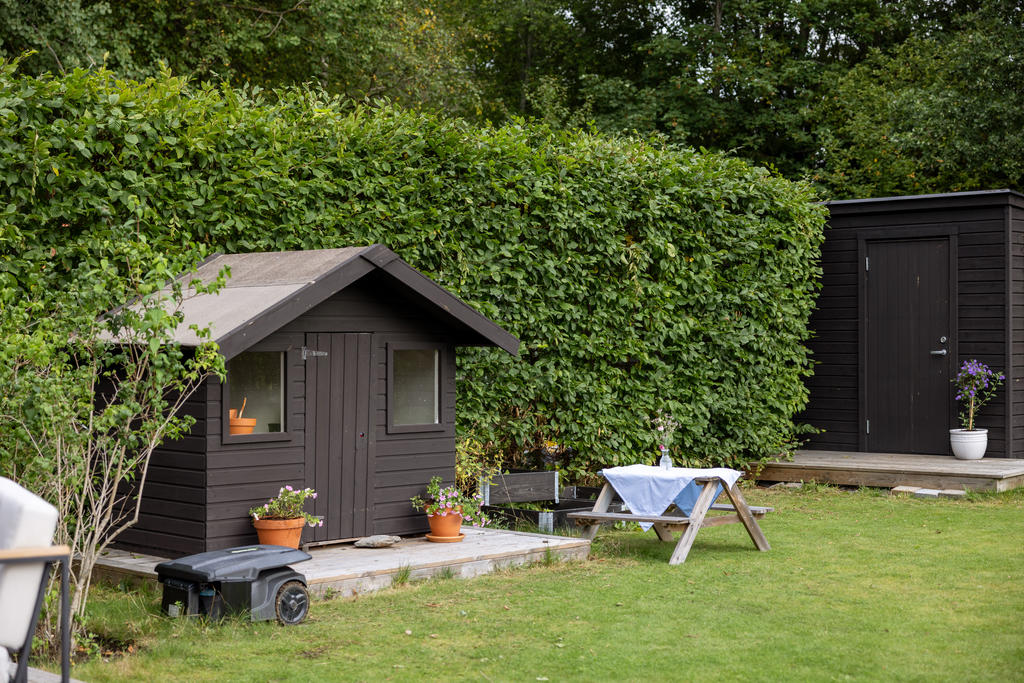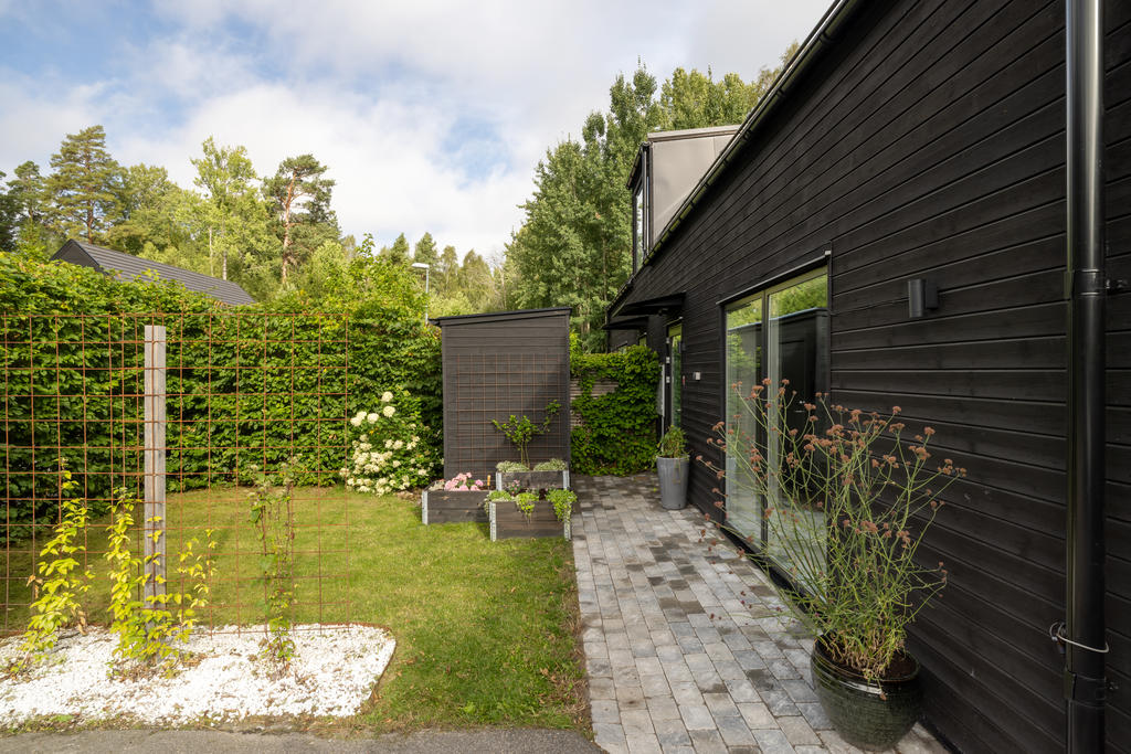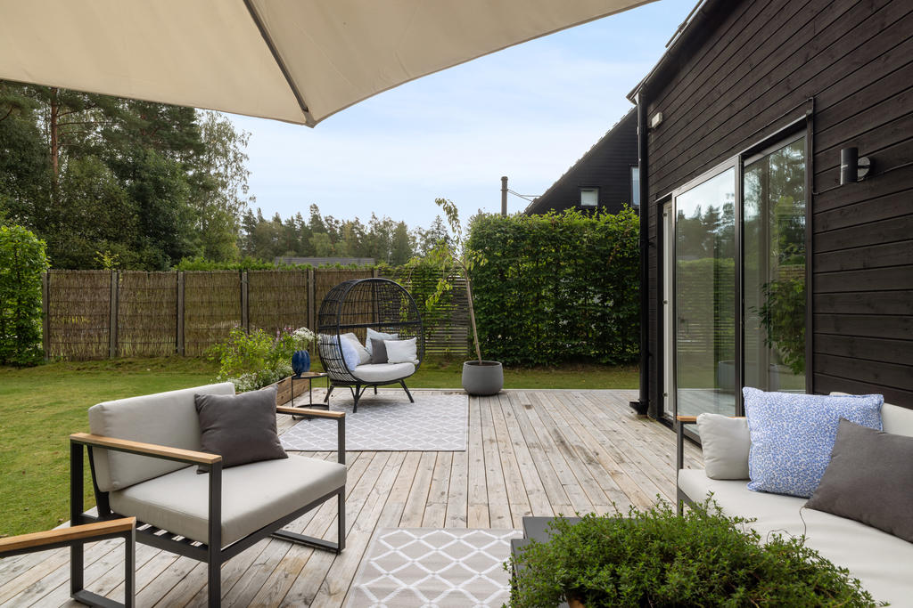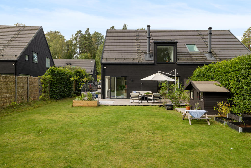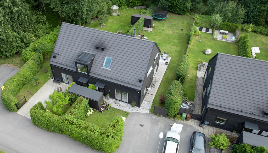 Den generösa tomten angränsar till naturen och erbjuder en underbar plats där familj och vänner kan njuta av uteliv tillsammans. Gott om utrymme för barnens lek, studsmatta och aktiviteter. Skyddande grönska skapar en privat oas.