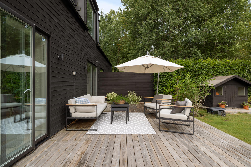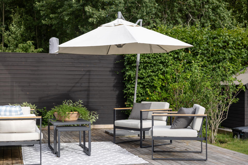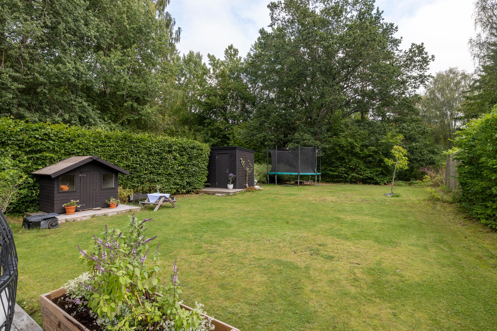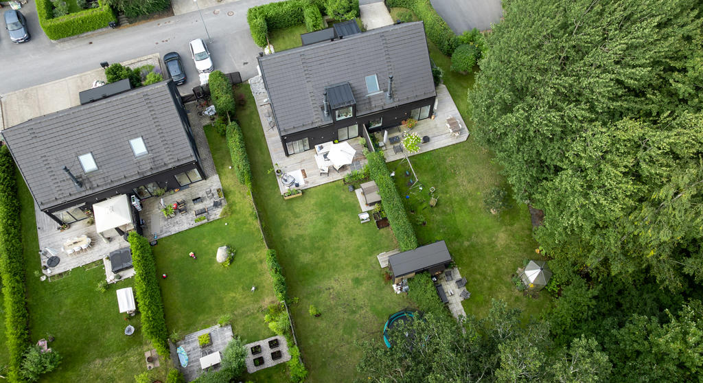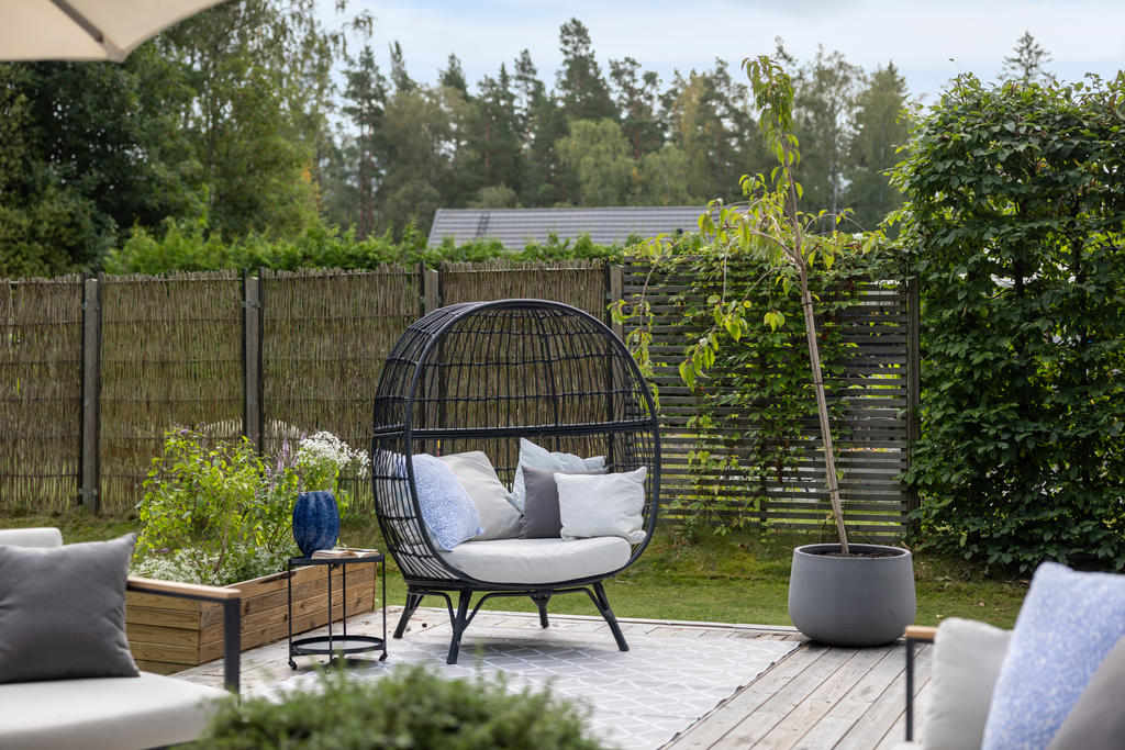 Den generösa tomten angränsar till naturen och erbjuder en underbar plats där familj och vänner kan njuta av uteliv tillsammans. Gott om utrymme för barnens lek, studsmatta och aktiviteter. Skyddande grönska skapar en privat oas.