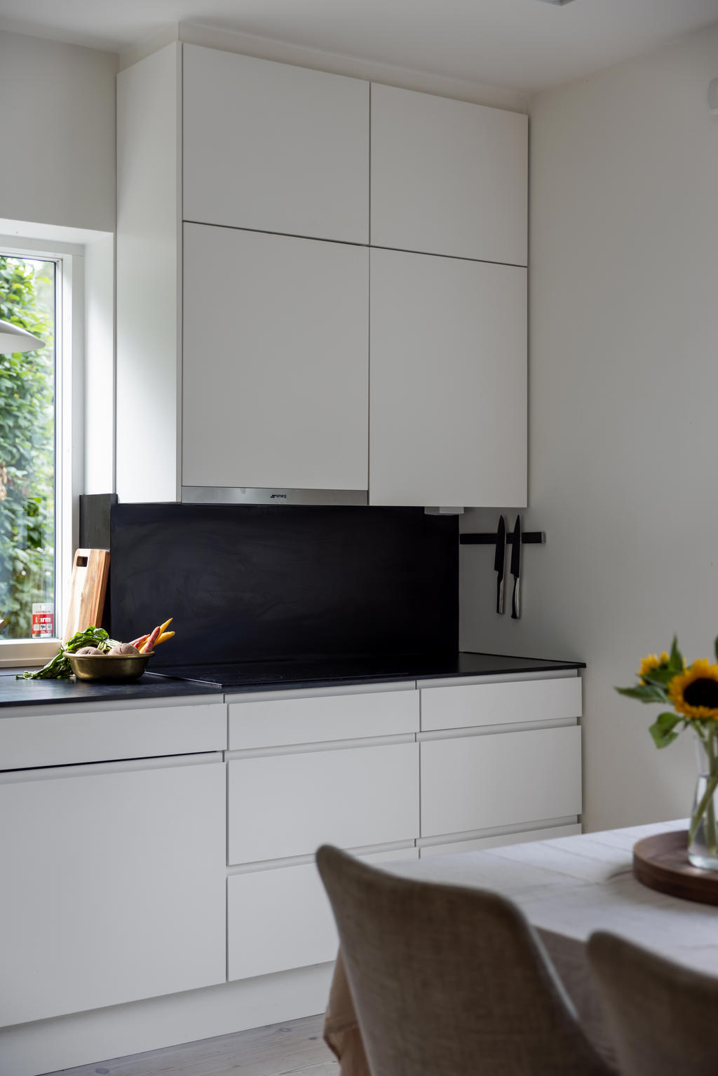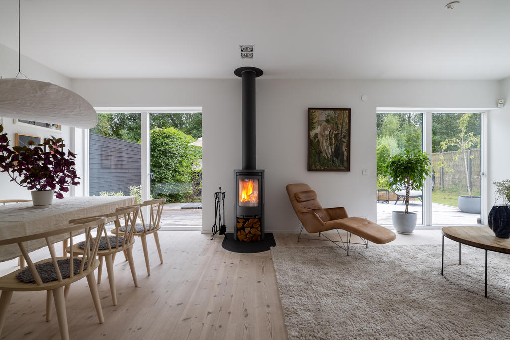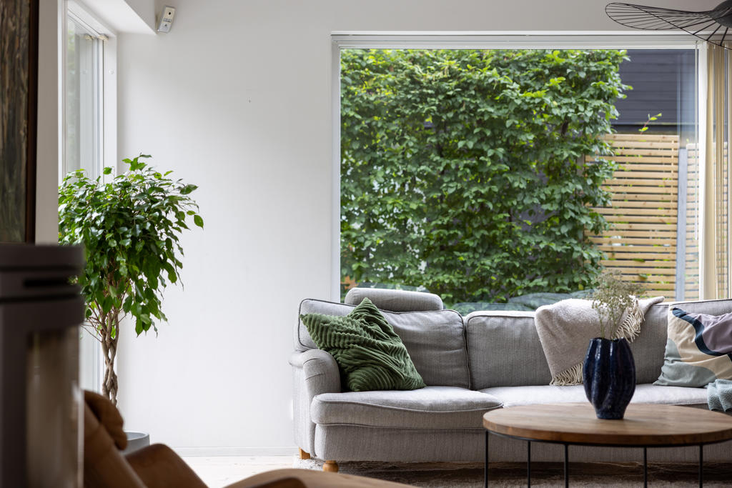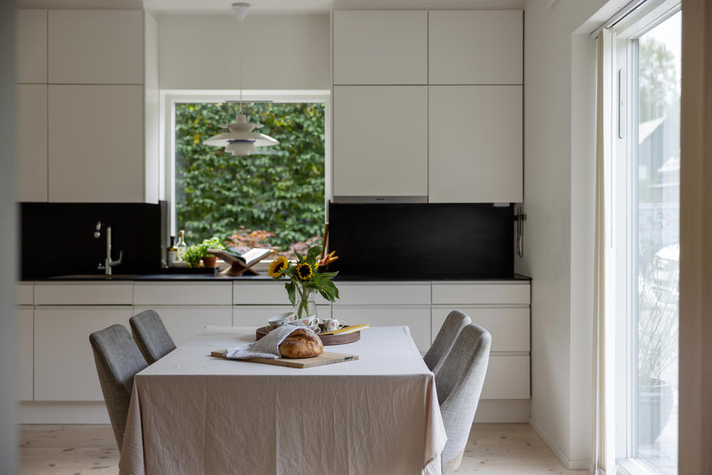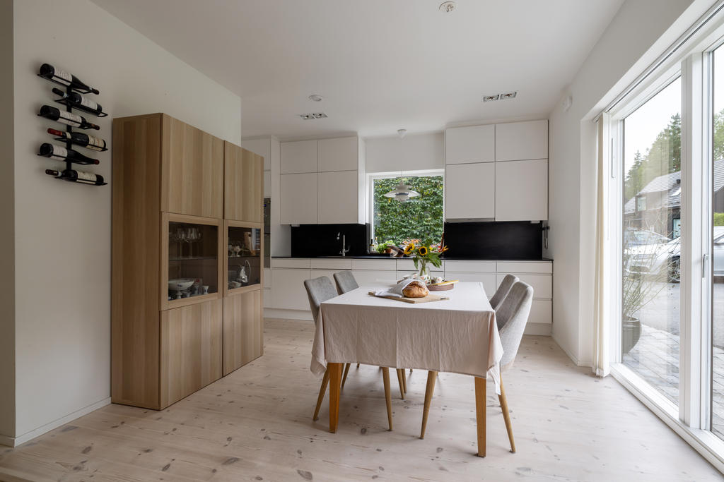 "Det vi fastnade för direkt med huset var ljuset och rymden. Högt i tak, stora fönster och en känsla av att ute och inne hänger ihop. Det märks i vardagen och gör att huset känns större än det är. Sällskapsytorna på nedre plan har varit den självklara samlingspunkten för både familjeliv och umgänge, och kontoret med sitt stora fönster mot skogen är en plats där det är lätt att trivas och komma till ro. En annan sak vi verkligen uppskattat är hur okomplicerat allt är. Huset är nytt och genomtänkt, utan konstigheter. Enkel förvaring, eluttag och belysning sitter där man faktiskt vill ha dem och inget har känts som tillfälliga lösningar.