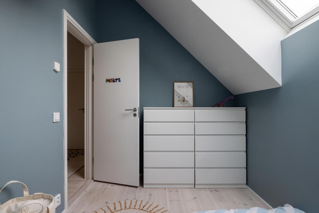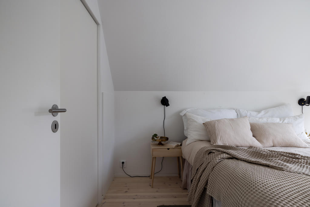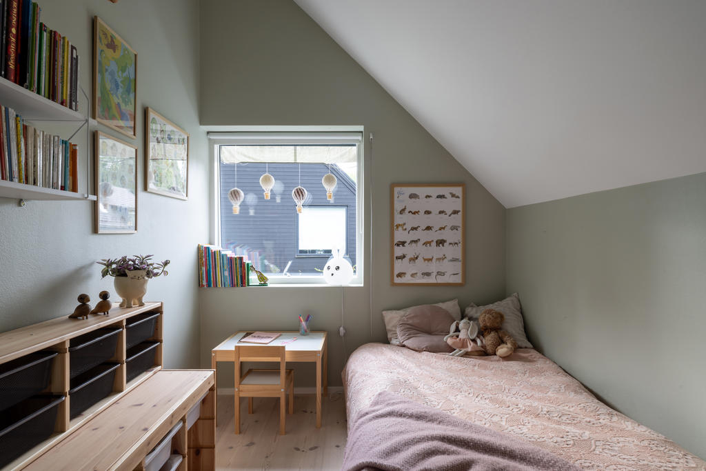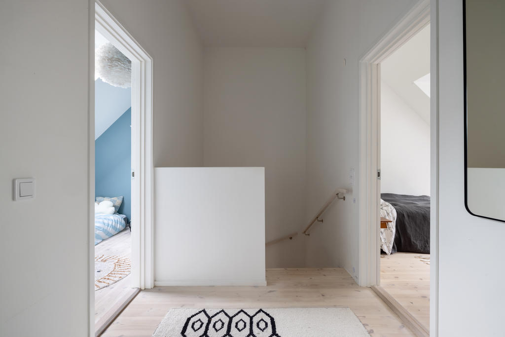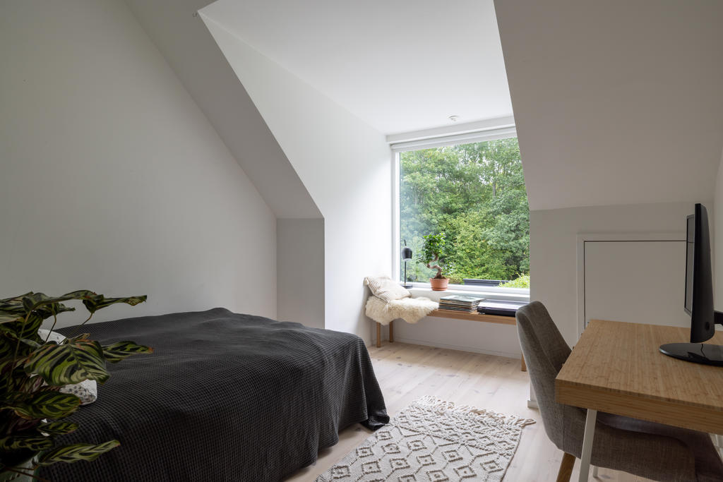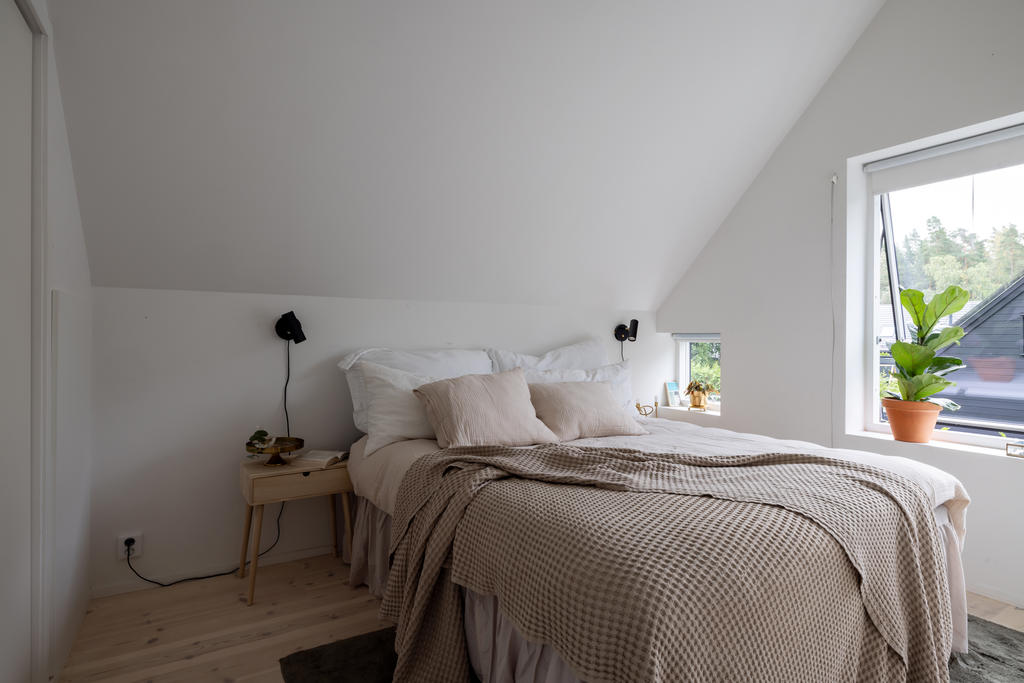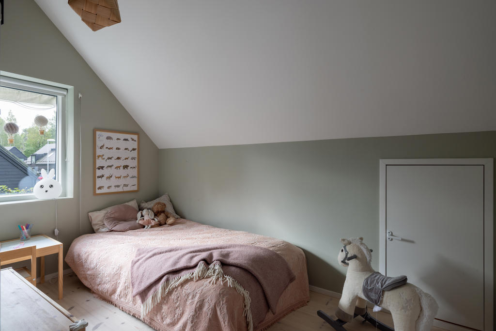 Övre plan är unikt tack vare den generösa takhöjden och det fina ljusinsläppet från både stora fönster och takfönster. Master bedroom är rymligt och erbjuder gott om plats för både säng och förvaring. Utöver detta finns ytterligare tre sovrum, lämpliga som barnrum eller kontor, samtliga med fint ljusinsläpp och utsikt mot grönska. Även familjebadrummet på övre plan har en elegant design och är utrustat med badkar.