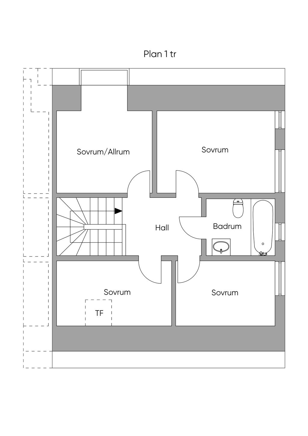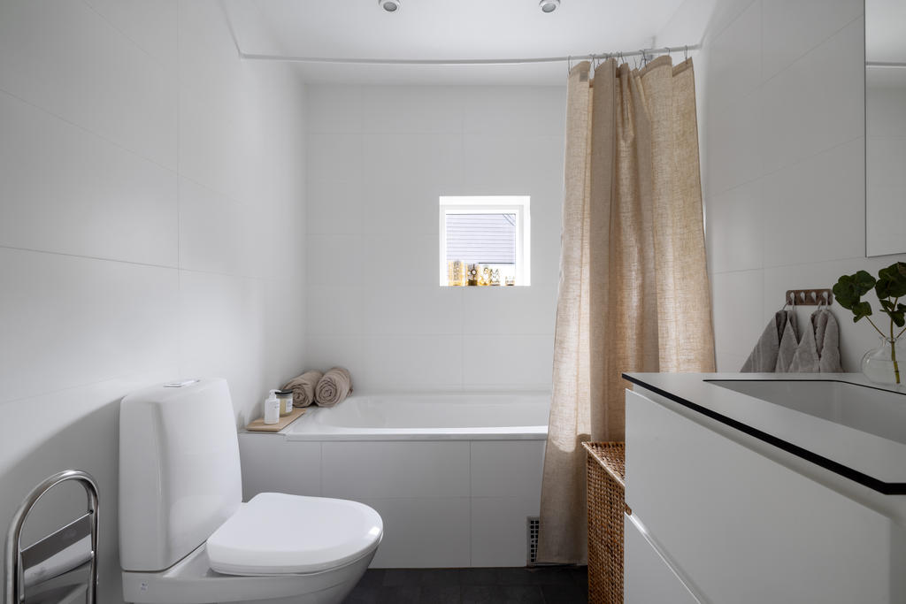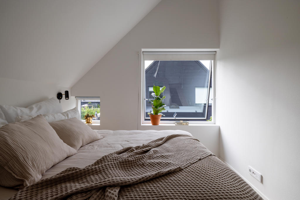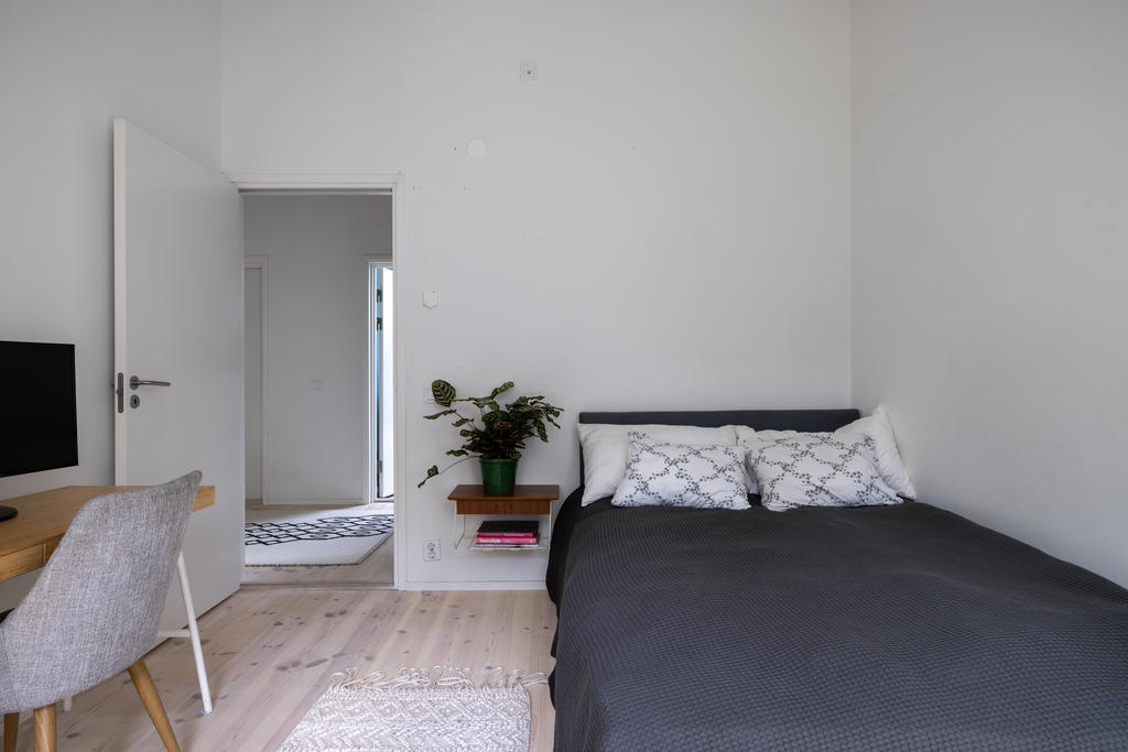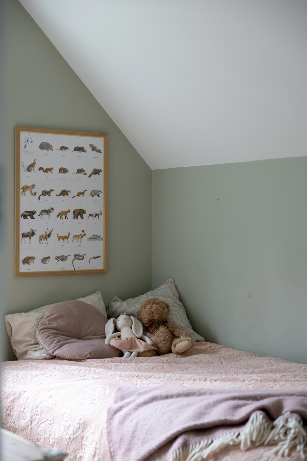 Övre plan är unikt tack vare den generösa takhöjden och det fina ljusinsläppet från både stora fönster och takfönster. Master bedroom är rymligt och erbjuder gott om plats för både säng och förvaring. Utöver detta finns ytterligare tre sovrum, lämpliga som barnrum eller kontor, samtliga med fint ljusinsläpp och utsikt mot grönska. Även familjebadrummet på övre plan har en elegant design och är utrustat med badkar.