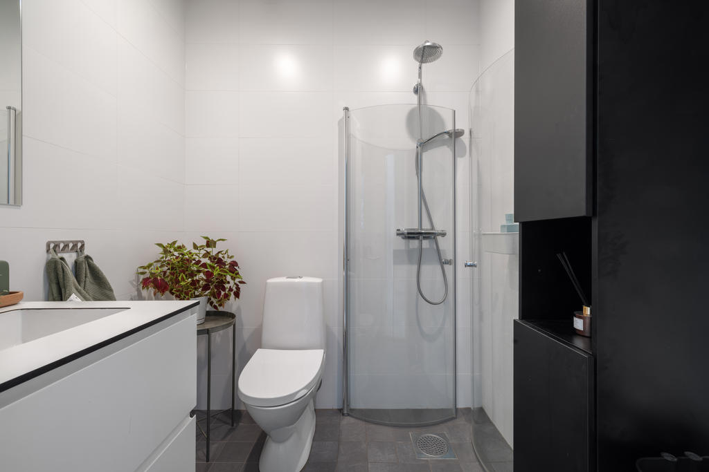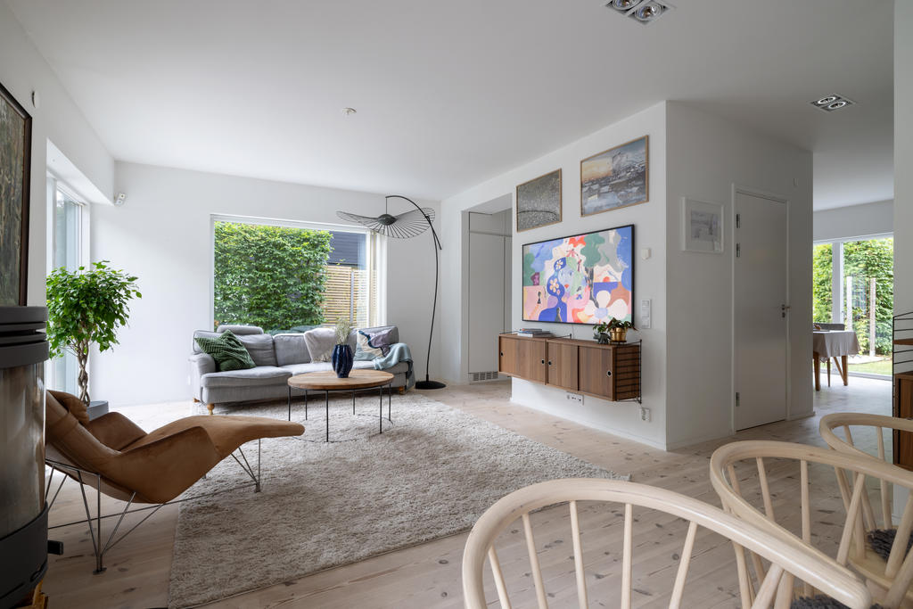 Genomgående håller huset hög klass med fina materialval, ljusa golv och infällda spotlights. Kök och vardagsrum ligger i öppen planlösning, vilket skapar en inbjudande miljö för både vardagsliv och festliga tillställningar. Braskaminen utgör hemmets naturliga mittpunkt och bidrar med både värme och trivsel. Här finns även utgång till det generösa trädäcket – en perfekt plats för utemöbler och umgänge. På entréplan finns även ett stilrent familjebadrum samt en separat tvättstuga.