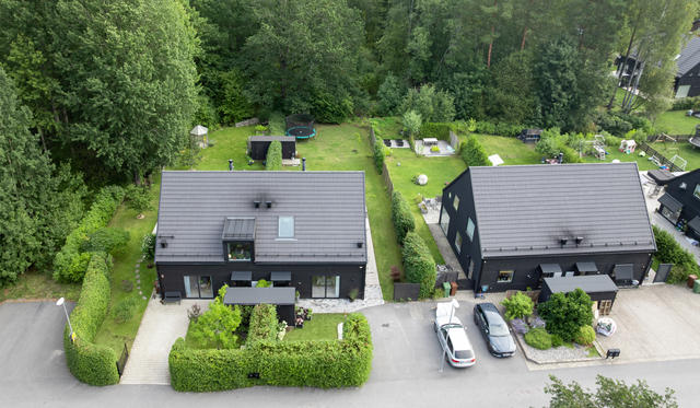 Tomten är något utöver det vanliga för ett parhus. Här finns sol någonstans under hela dagen och gott om plats för lek, odling och middagar på altanen. Att tomten dessutom gränsar direkt mot skog ger både en vacker grön fond från fönstren i huset och en fantastisk lekmiljö. Stämningen på gatan är varm och social, med en fin balans mellan gemenskap och privatliv. För oss med små barn har området varit perfekt. Barnen kan gå ut och leka på gatan eller i skogen utan att man behöver planera, och vill man inte leka själv finns det nästan alltid någon kompis i närheten. Parken, fotbollsplanen eller att bada i Lycksjön är enkla utflyktsmål när man vill byta miljö med en kort 5-10 minuters promenad. Vill man istället ta sig in till stan med bilen tar det inte mer än 25 minuter innan man parkerat för besök på Skansen en lördag förmiddag. Logistiken har gjort vardagen väldigt smidig. Förskolor och skola ligger på gångavstånd och direktbussarna tar en snabbt och enkelt in både till stan (Vattugatan) och Gullmarsplan. Vardagsservice som matbutik, vårdcentral, apotek och frisör m.m. finns alla inom 5 minuters gångavstånd, vilket gör att bilen sällan behövs.