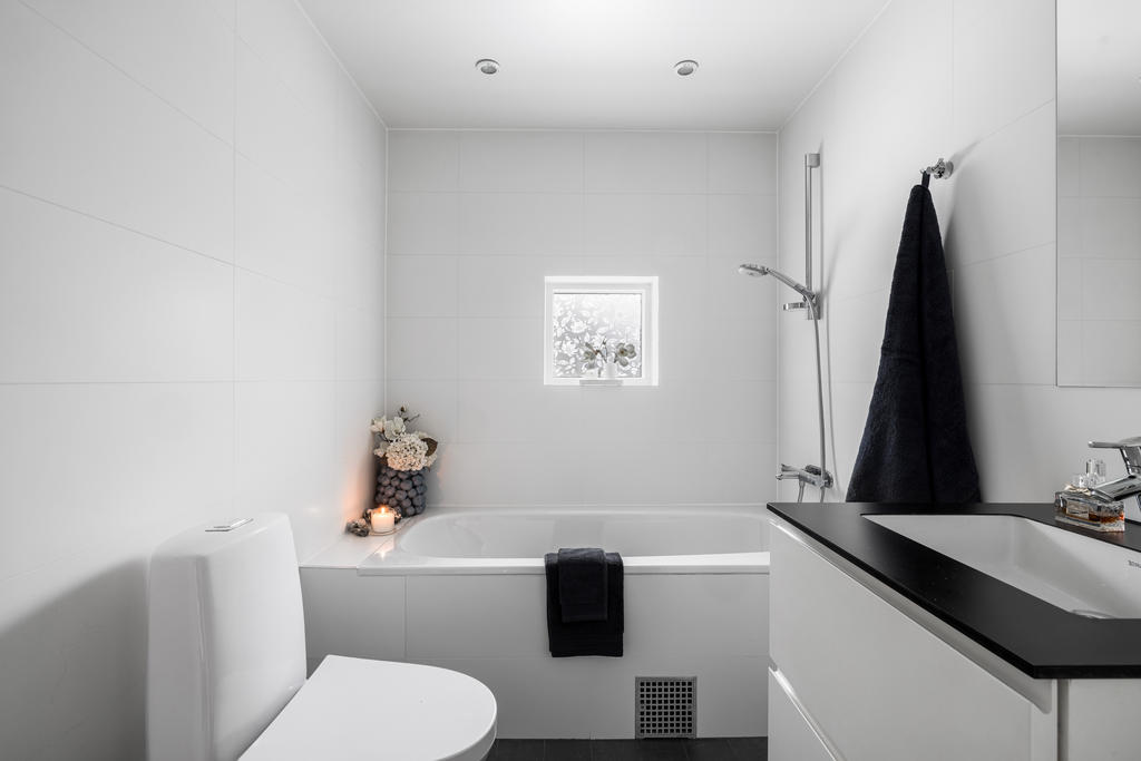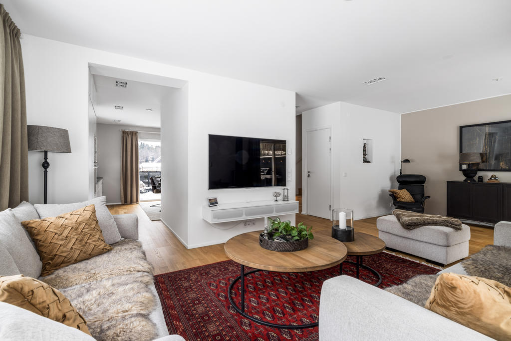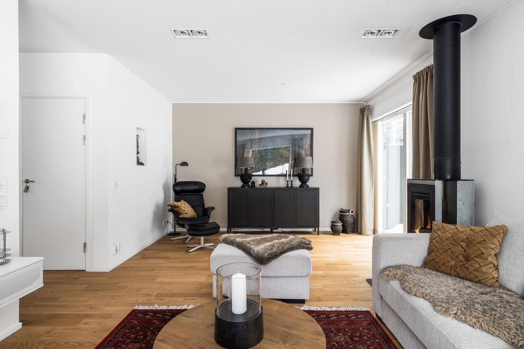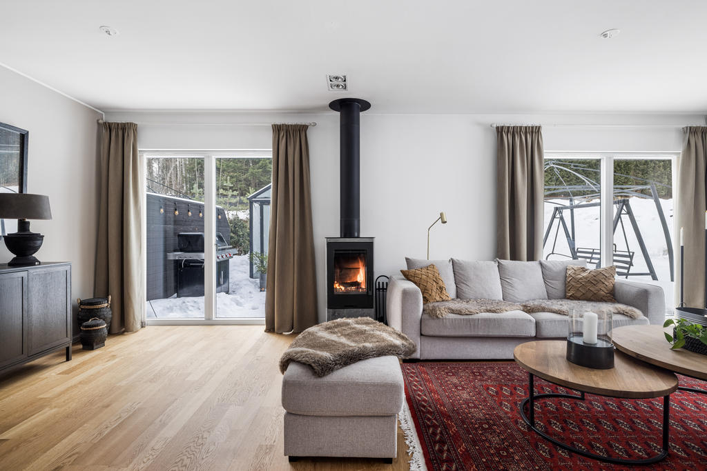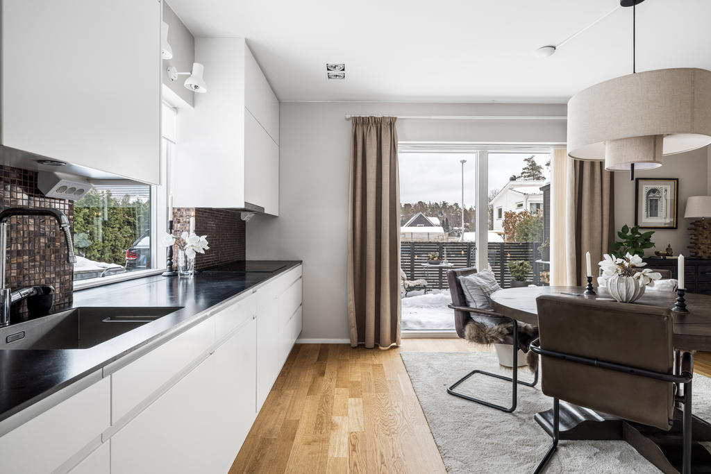 Genomgående håller huset hög klass med fina materialval, nya golv och infällda spotlights. Kök och vardagsrum ligger i öppen planlösning, vilket skapar en inbjudande miljö för både vardagsliv och festliga tillställningar. Braskaminen utgör hemmets naturliga mittpunkt och bidrar med både värme och trivsel. Här finns även utgång till det generösa trädäcket – en perfekt plats för utemöbler och umgänge. På entréplan finns även ett stilrent familjebadrum samt en separat tvättstuga.