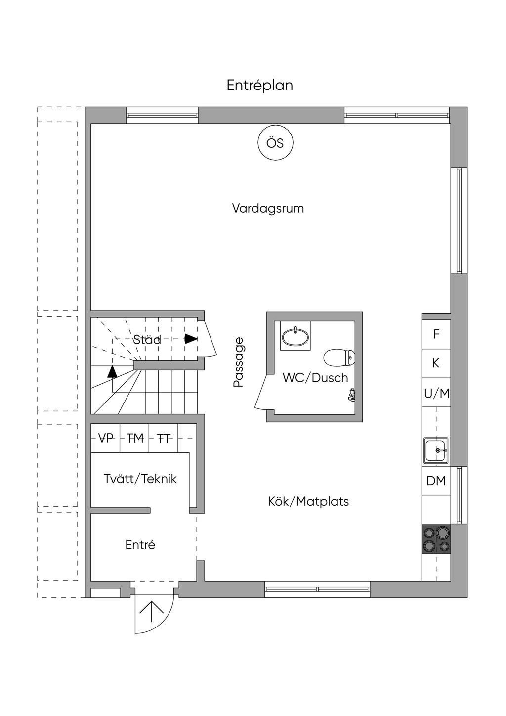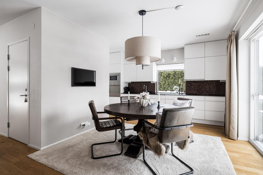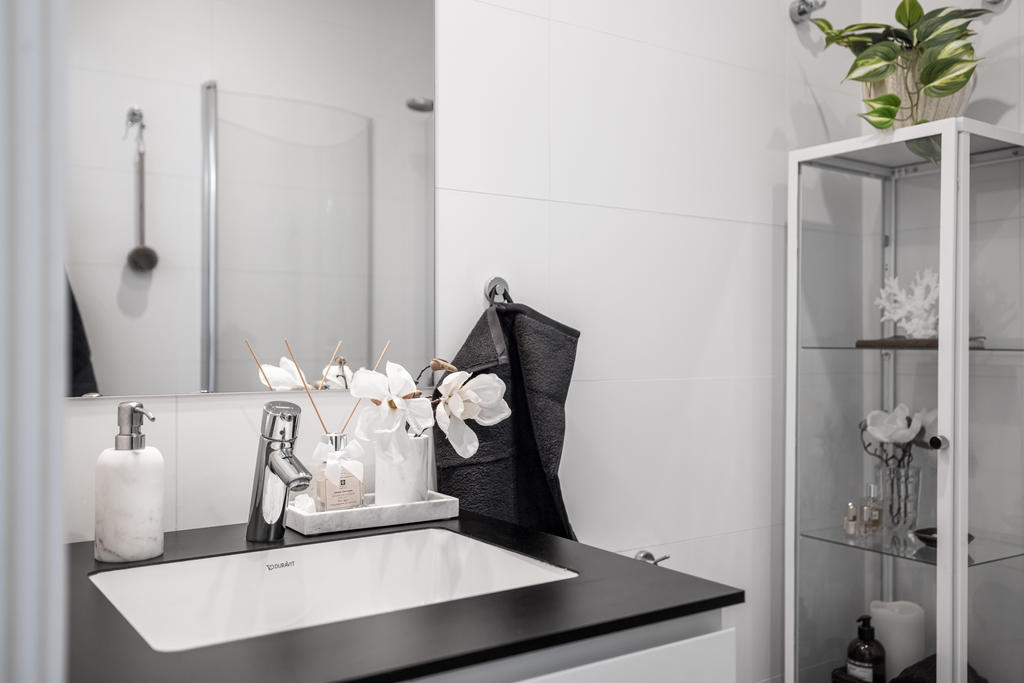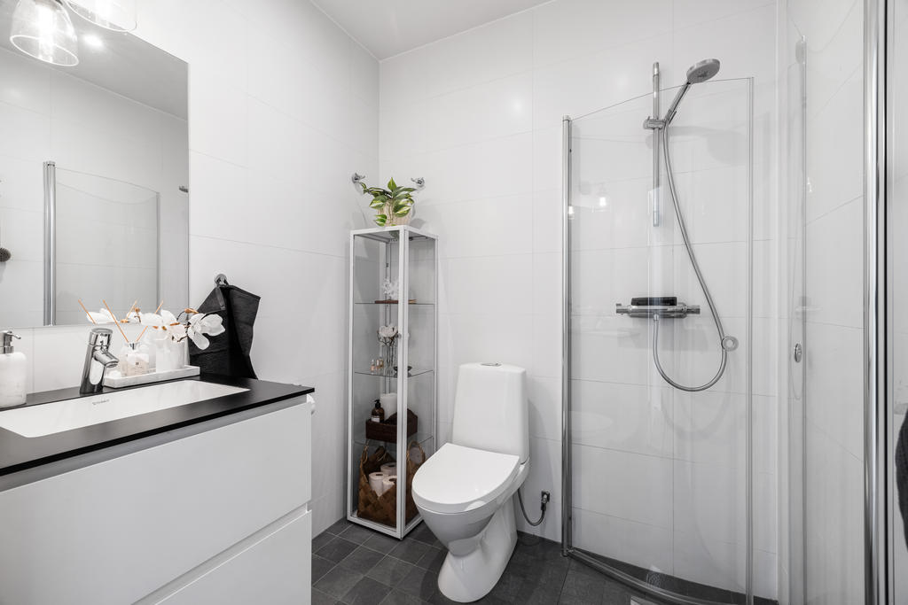 Genomgående håller huset hög klass med fina materialval, nya golv och infällda spotlights. Kök och vardagsrum ligger i öppen planlösning, vilket skapar en inbjudande miljö för både vardagsliv och festliga tillställningar. Braskaminen utgör hemmets naturliga mittpunkt och bidrar med både värme och trivsel. Här finns även utgång till det generösa trädäcket – en perfekt plats för utemöbler och umgänge. På entréplan finns även ett stilrent familjebadrum samt en separat tvättstuga.