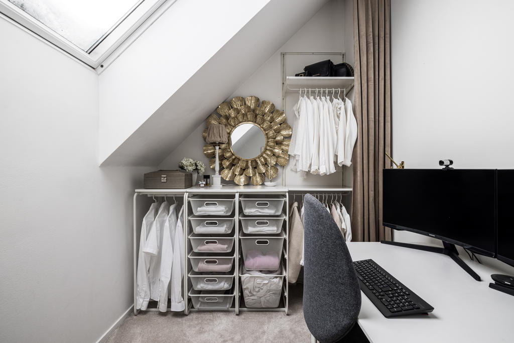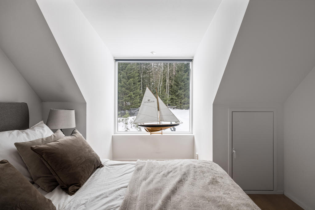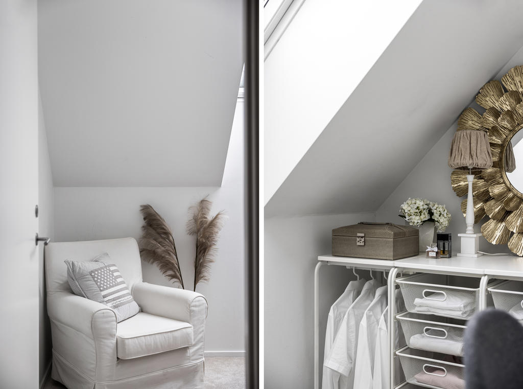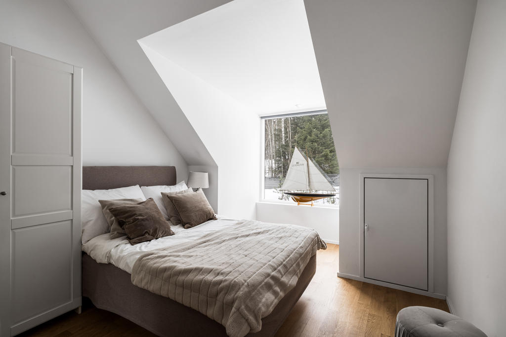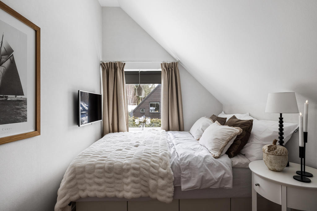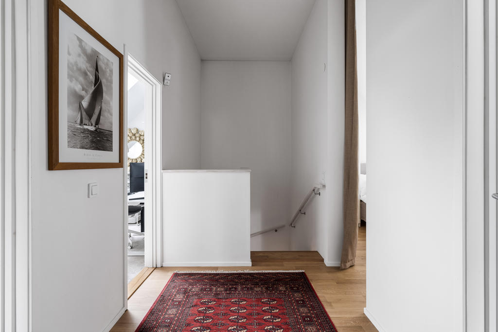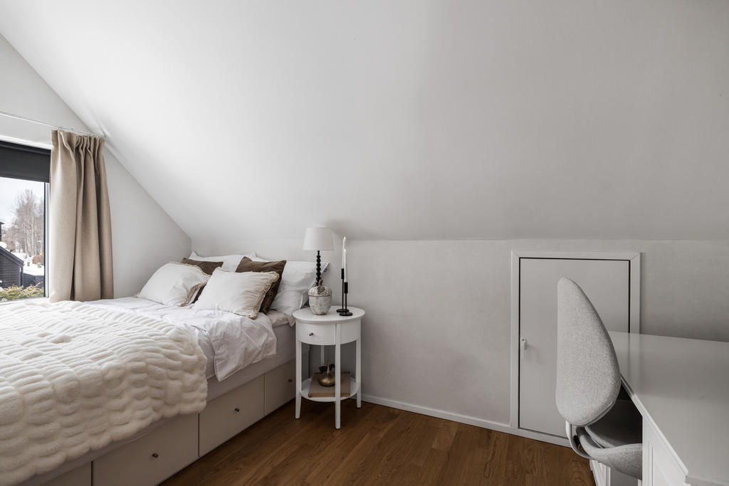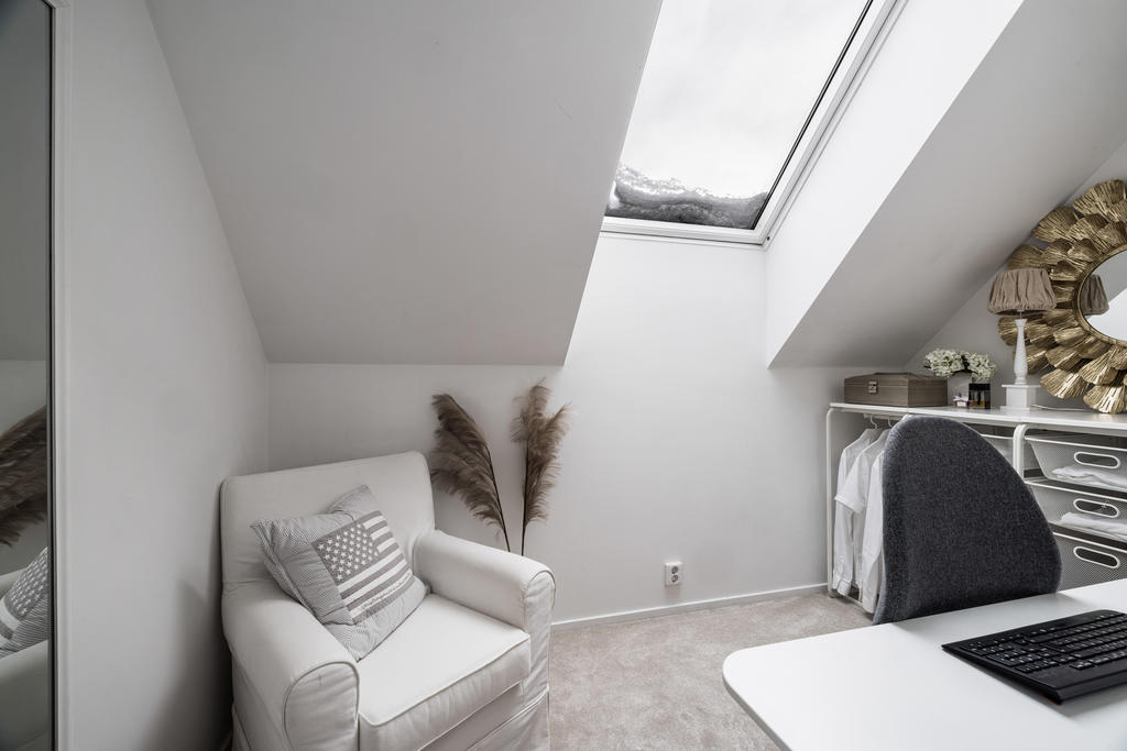Övre plan är unikt tack vare den generösa takhöjden och det fina ljusinsläppet från både stora fönster och takfönster. Master bedroom är rymligt och erbjuder gott om plats för både säng och förvaring. Utöver detta finns ytterligare tre sovrum, lämpliga som barnrum eller kontor, samtliga med fint ljusinsläpp och utsikt mot grönska. Även familjebadrummet på övre plan har en elegant design och är utrustat med badkar.