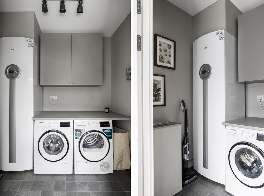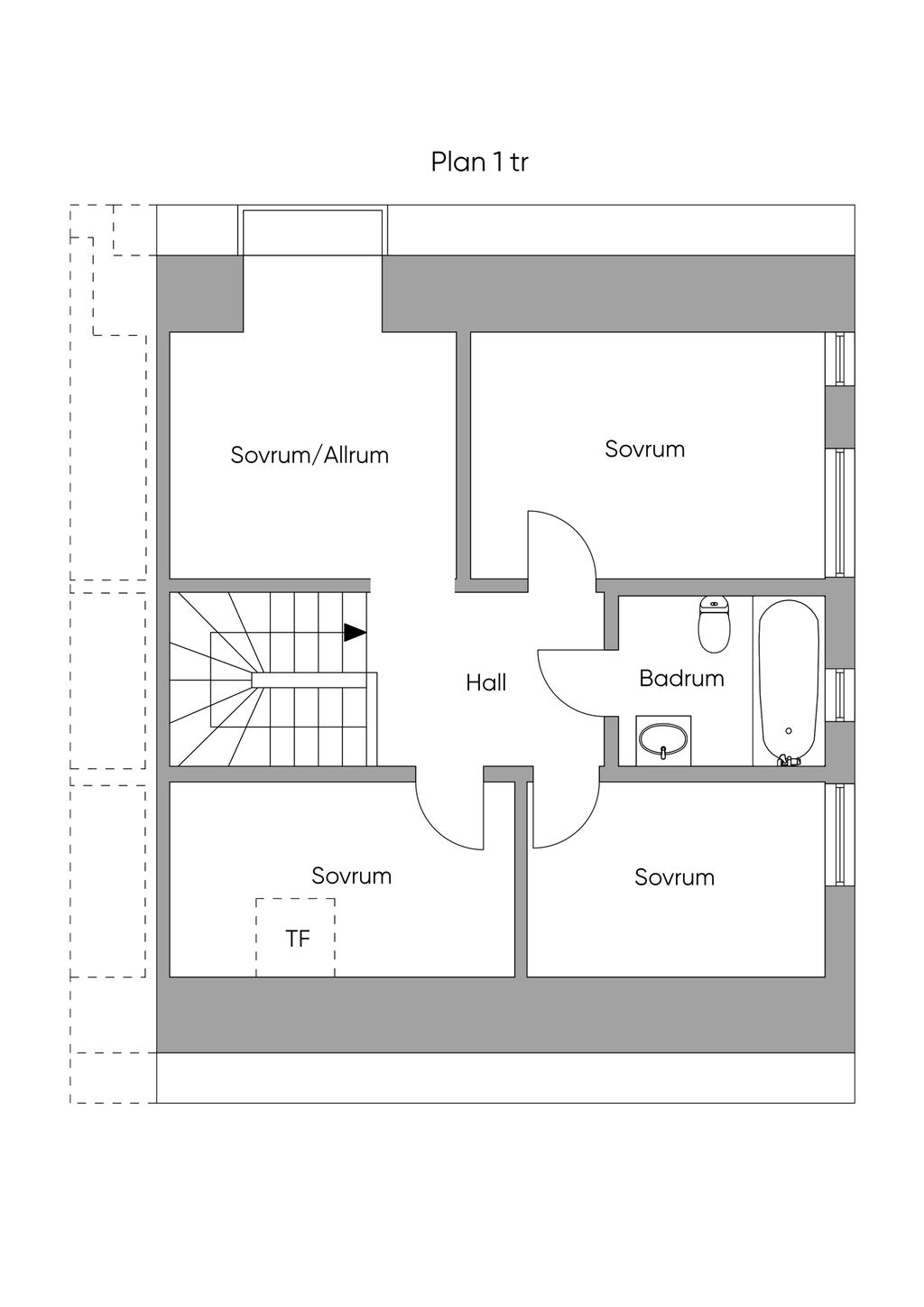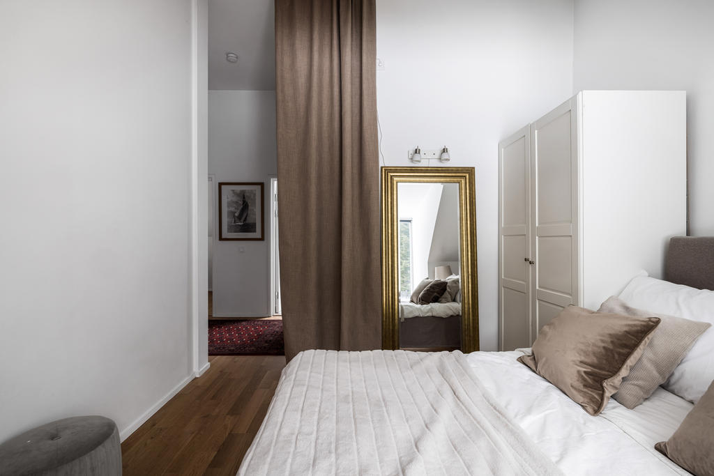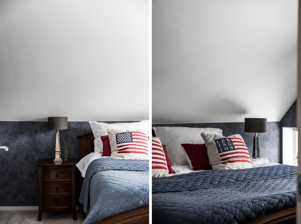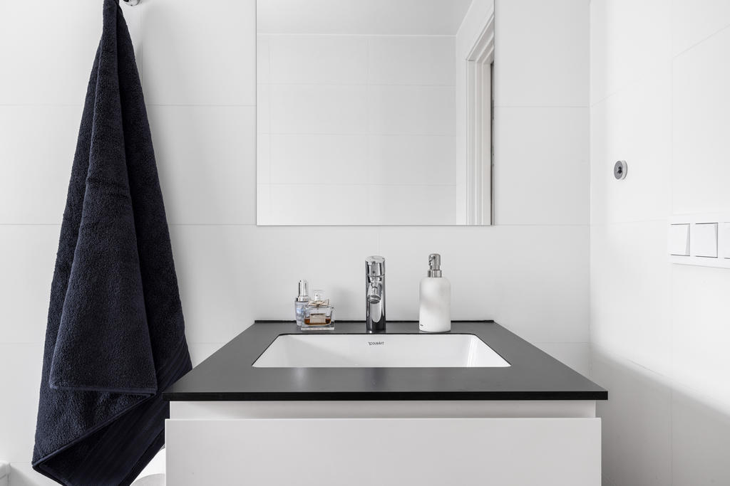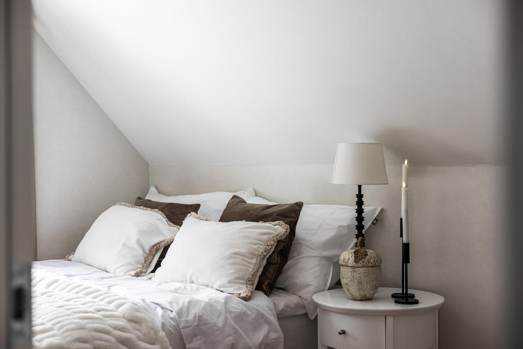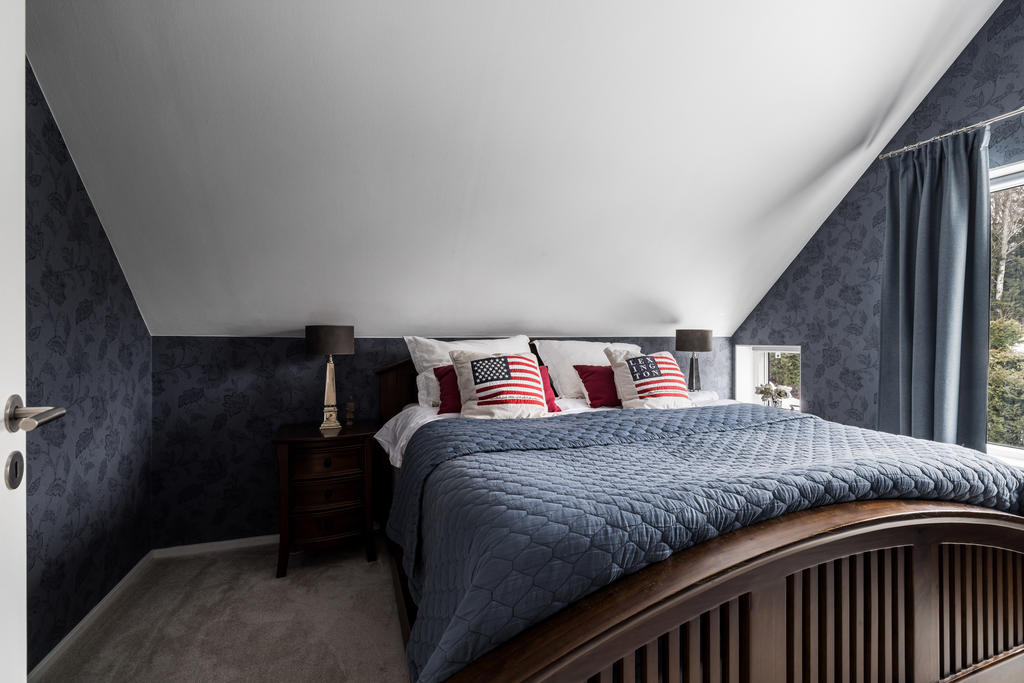 Övre plan är unikt tack vare den generösa takhöjden och det fina ljusinsläppet från både stora fönster och takfönster. Master bedroom är rymligt och erbjuder gott om plats för både säng och förvaring. Utöver detta finns ytterligare tre sovrum, lämpliga som barnrum eller kontor, samtliga med fint ljusinsläpp och utsikt mot grönska. Även familjebadrummet på övre plan har en elegant design och är utrustat med badkar.