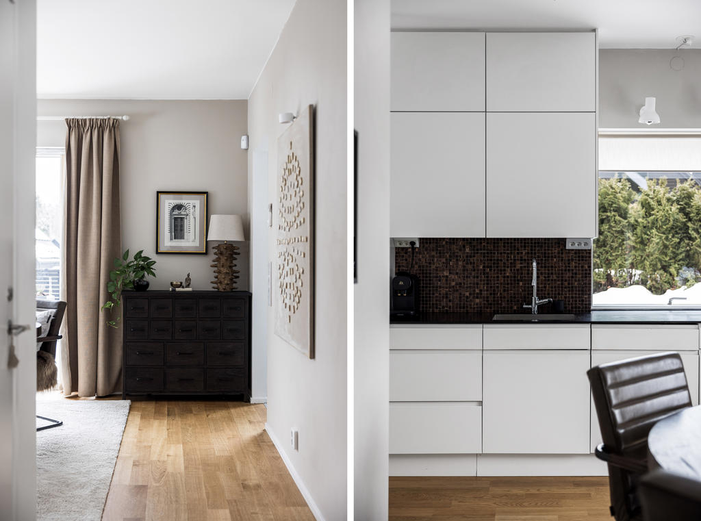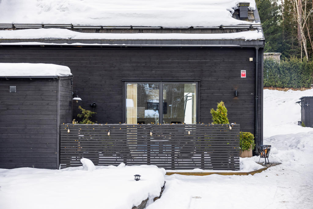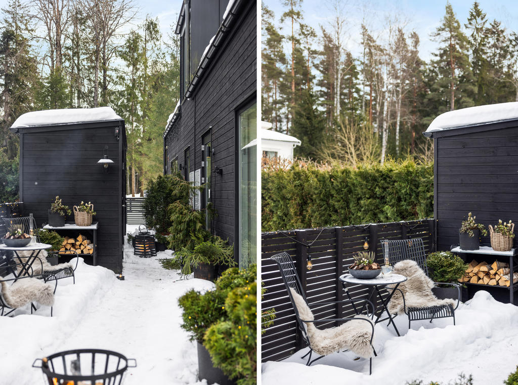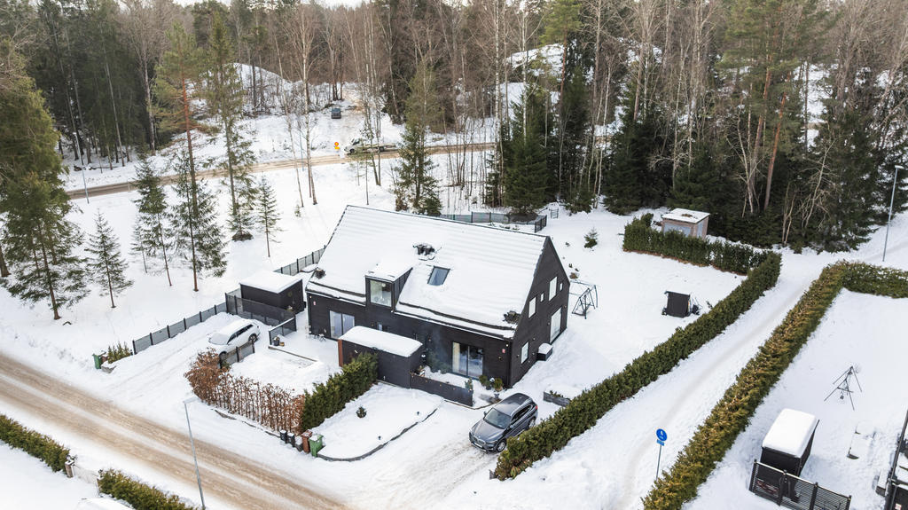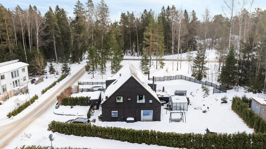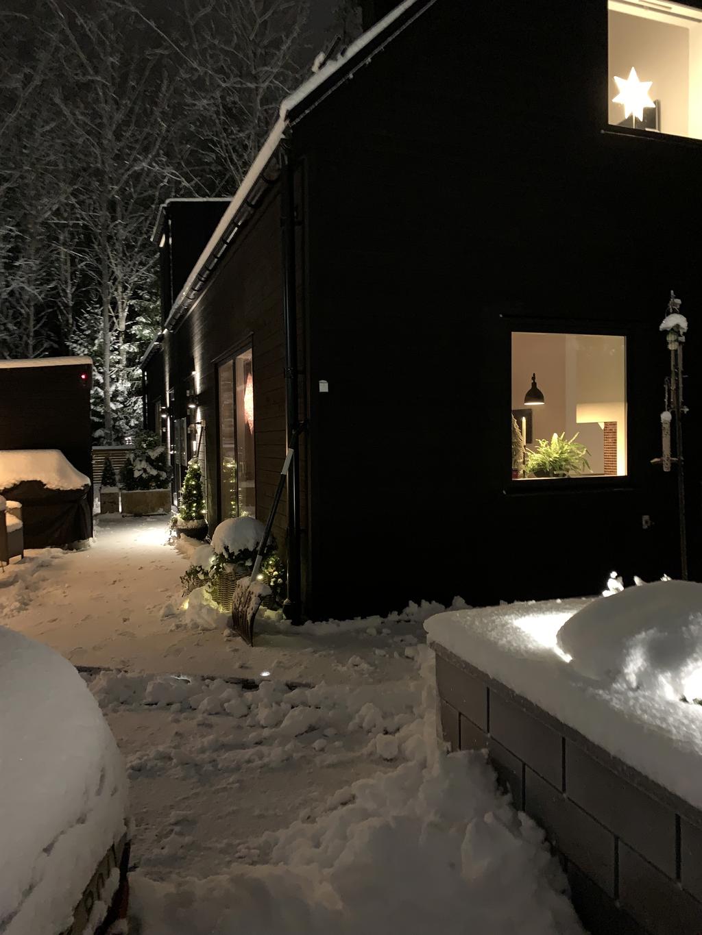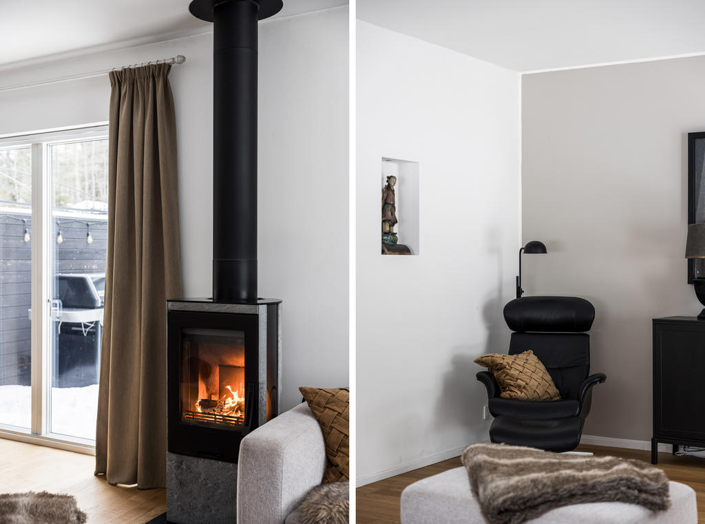 "Vi blev förälskade direkt när vi körde ner i denna lilla ”Alpby”. Den moderna arkitekturen som jag alltid drömt om, alla husen i matt svart med stora fönster som suddar ut inne och ute. Det branta taken med kupor och takfönster. På sommaren möter man personer i badrock som kommer från sjön som bara ligger några minuter bort. På vintern är det så otroligt vackert med snön och all belysning mot den fina arkitekturen. På Lucia kan man möta ett luciatåg av hästar som rider förbi huset. Huset har exklusiva materialval val som tex. matt borstade ekgolv, öppenspis, stort badkar och alla vitvaror i köket är SMEG. Takhöjden på övervåningen är 3,60 och ger en lyxig känsla.