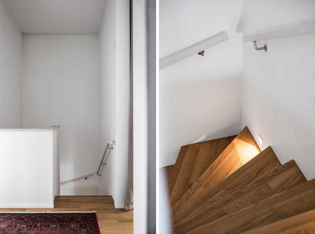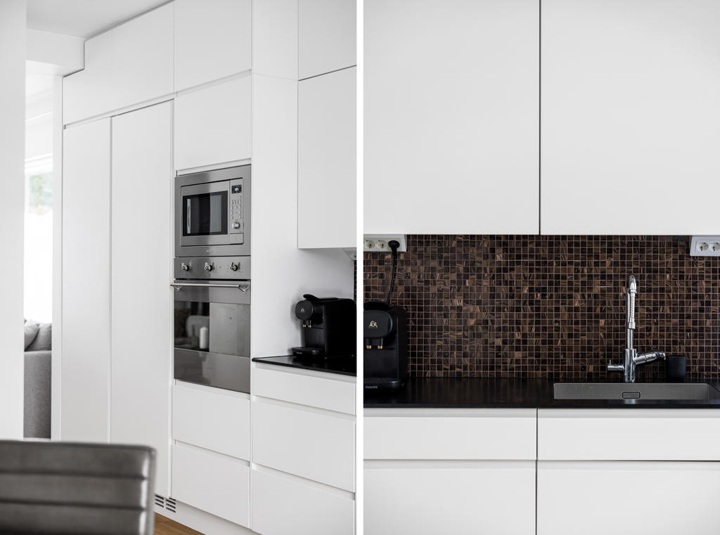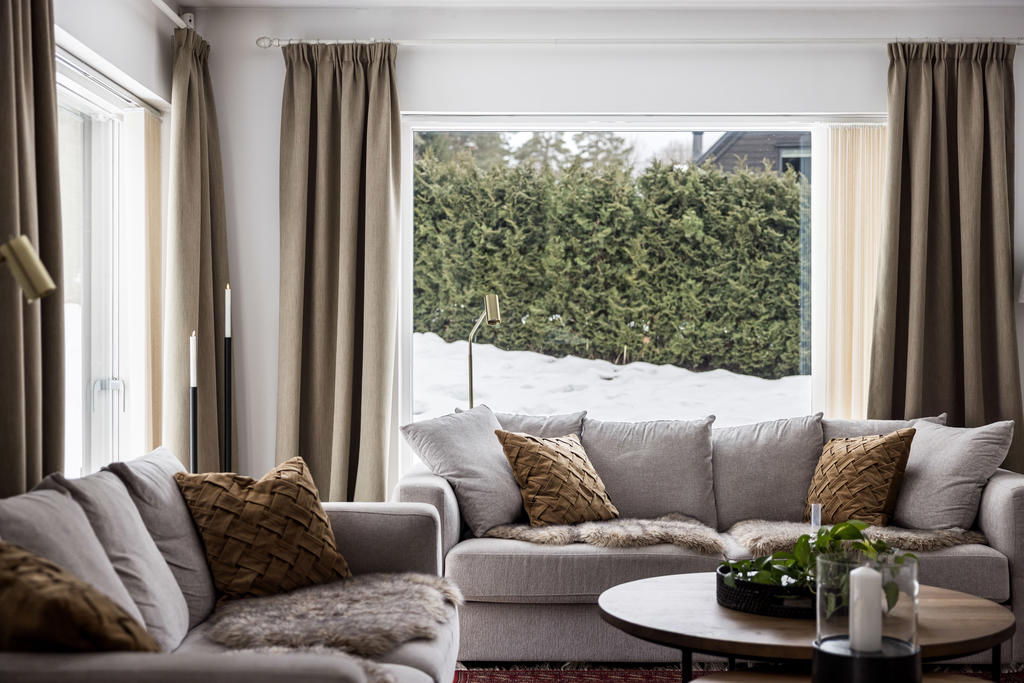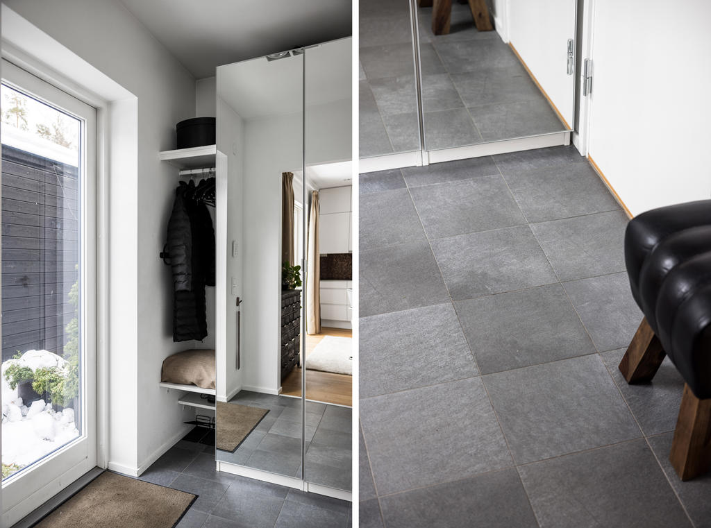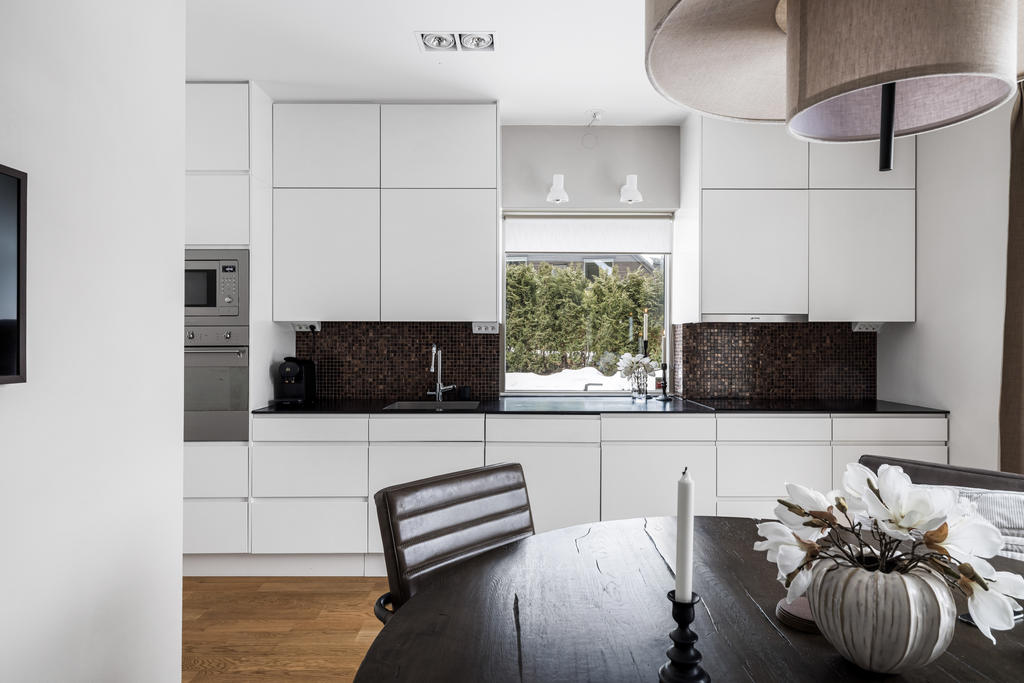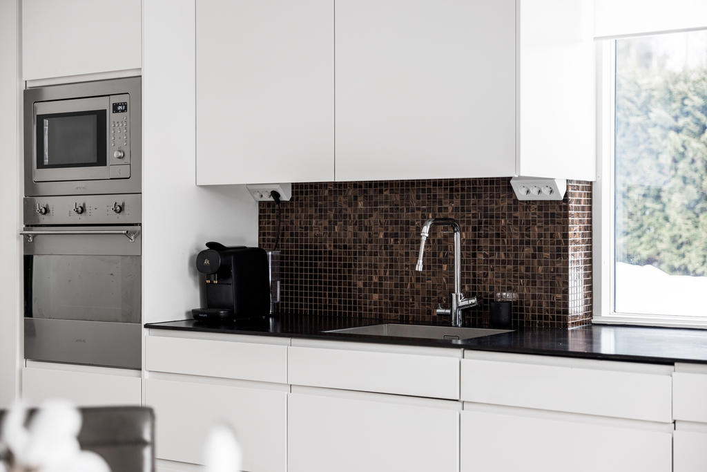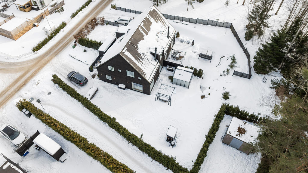 "Vi blev förälskade direkt när vi körde ner i denna lilla ”Alpby”. Den moderna arkitekturen som jag alltid drömt om, alla husen i matt svart med stora fönster som suddar ut inne och ute. Det branta taken med kupor och takfönster. På sommaren möter man personer i badrock som kommer från sjön som bara ligger några minuter bort. På vintern är det så otroligt vackert med snön och all belysning mot den fina arkitekturen. På Lucia kan man möta ett luciatåg av hästar som rider förbi huset. Huset har exklusiva materialval val som tex. matt borstade ekgolv, öppenspis, stort badkar och alla vitvaror i köket är SMEG. Takhöjden på övervåningen är 3,60 och ger en lyxig känsla.
