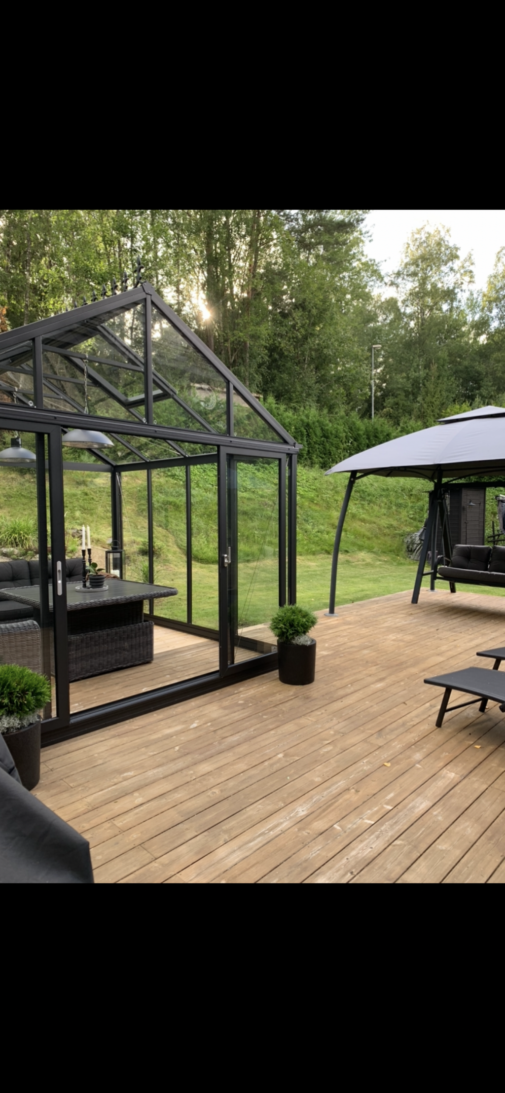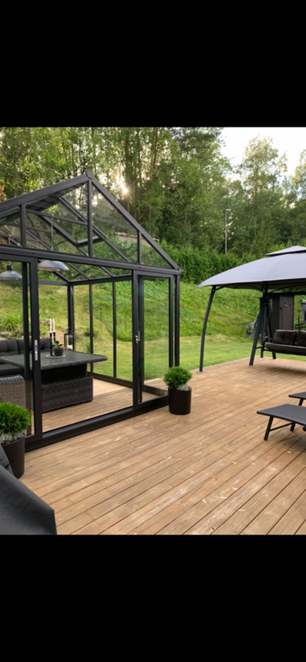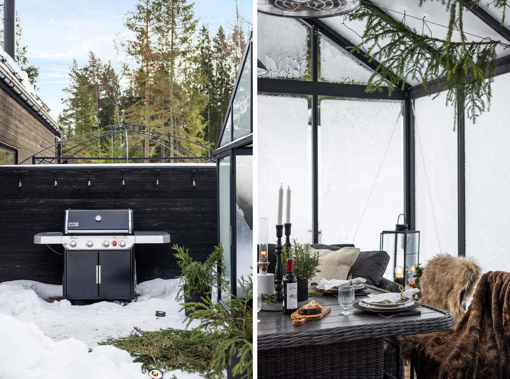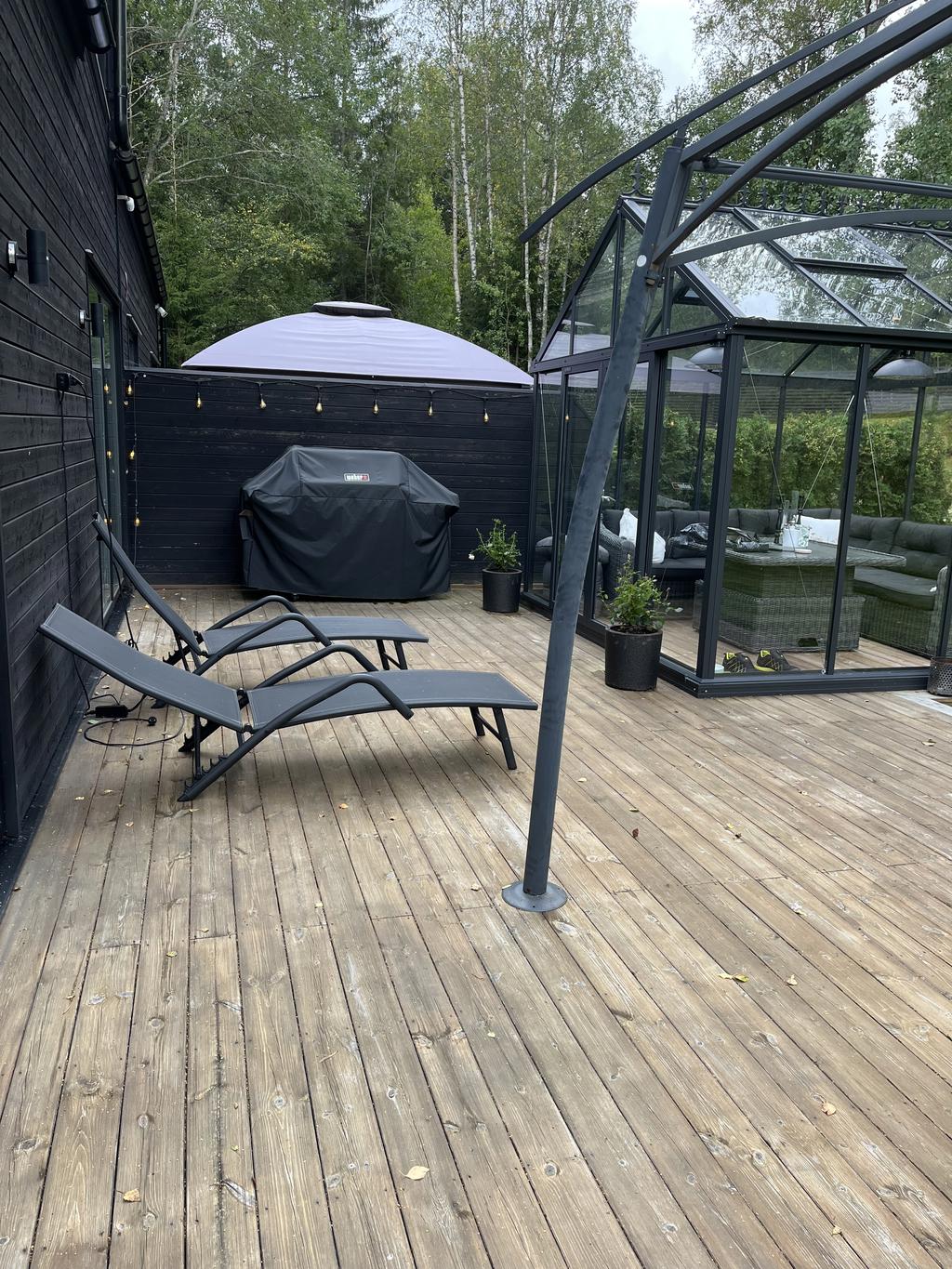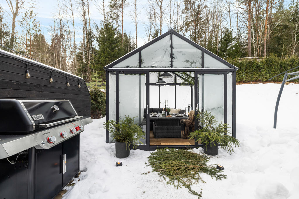 Den generösa tomten angränsar till naturen och erbjuder en underbar plats där familj och vänner kan njuta av uteliv tillsammans. Gott om utrymme för barnens lek, studsmatta och aktiviteter. Skyddande grönska skapar en privat oas. Här finns även ett orangerie för växter och mysiga tillställningar.