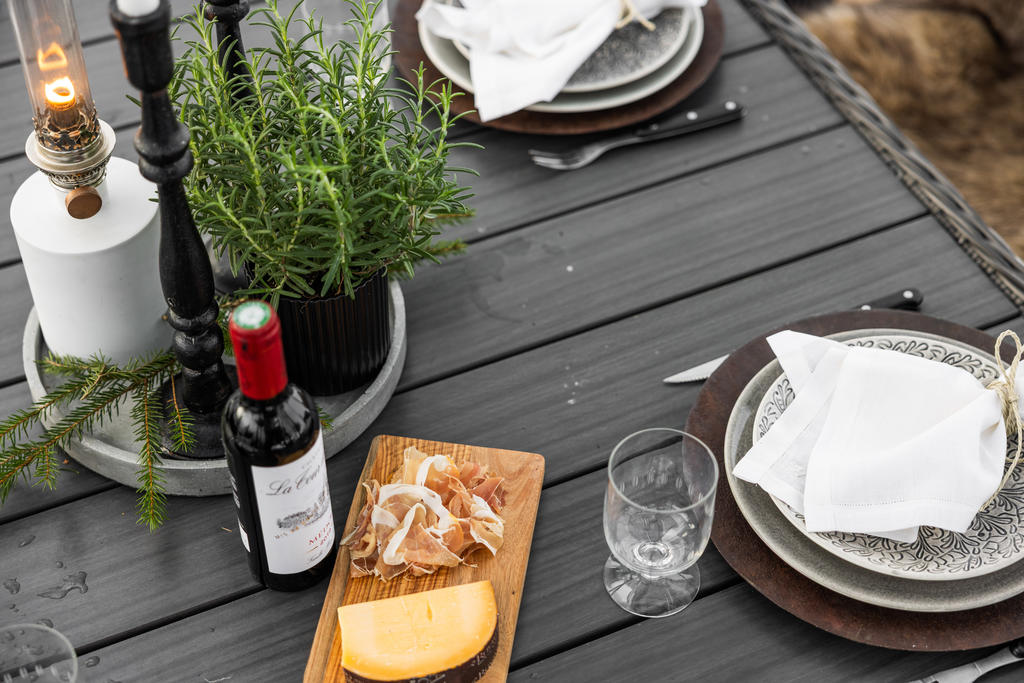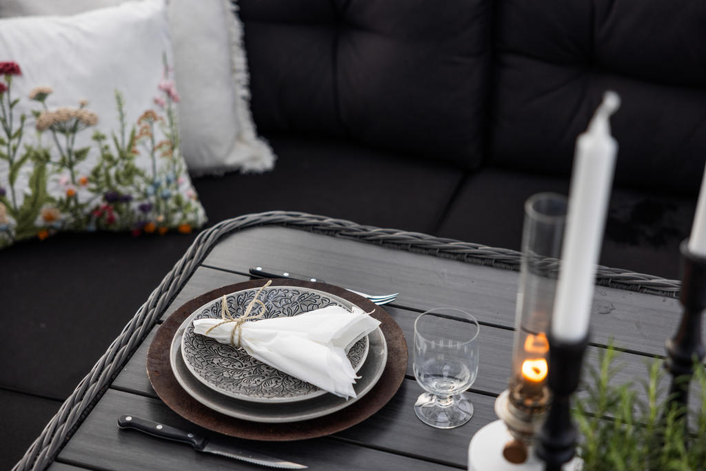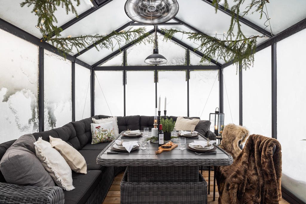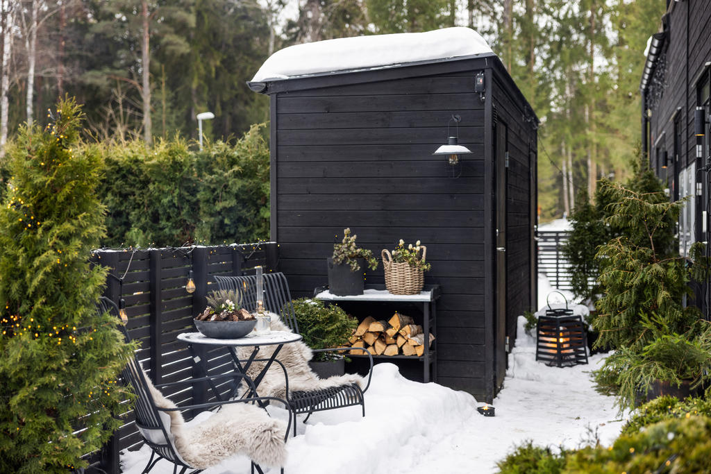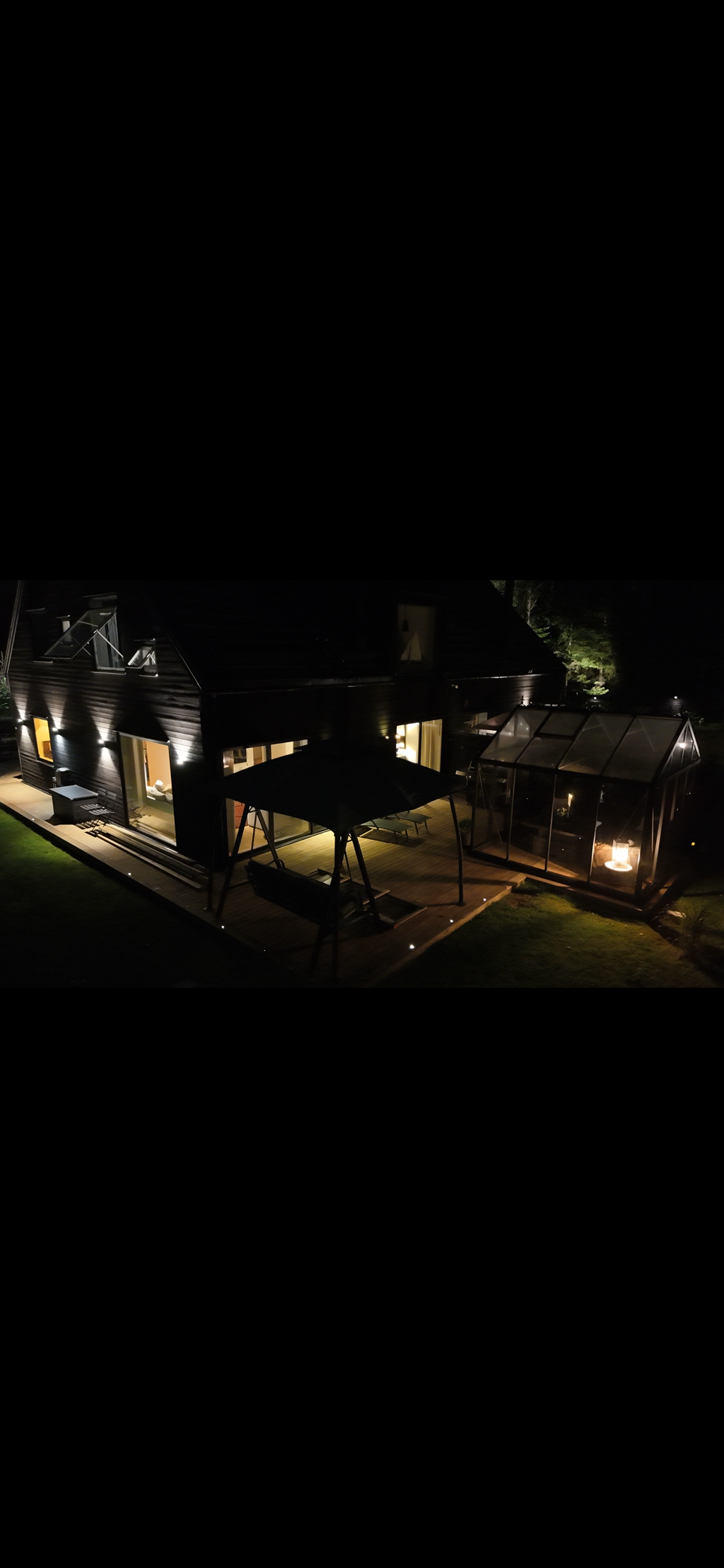 Den generösa tomten angränsar till naturen och erbjuder en underbar plats där familj och vänner kan njuta av uteliv tillsammans. Gott om utrymme för barnens lek, studsmatta och aktiviteter. Skyddande grönska skapar en privat oas. Här finns även ett orangerie för växter och mysiga tillställningar.