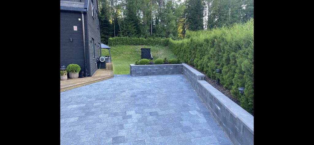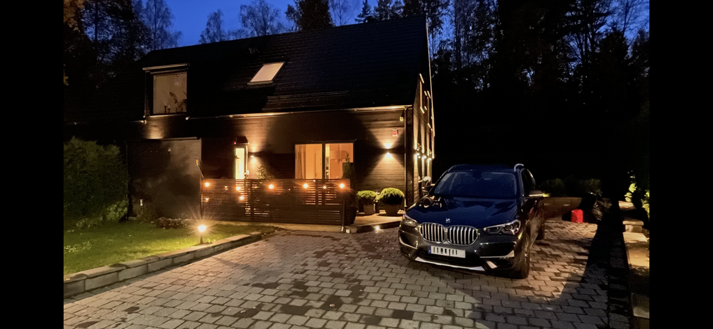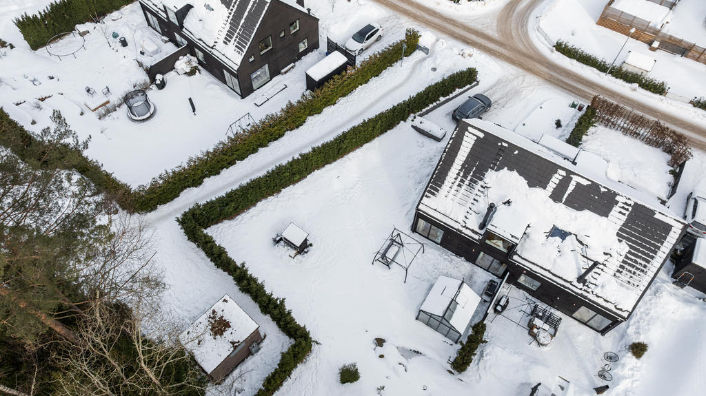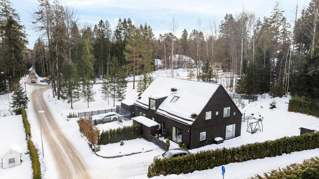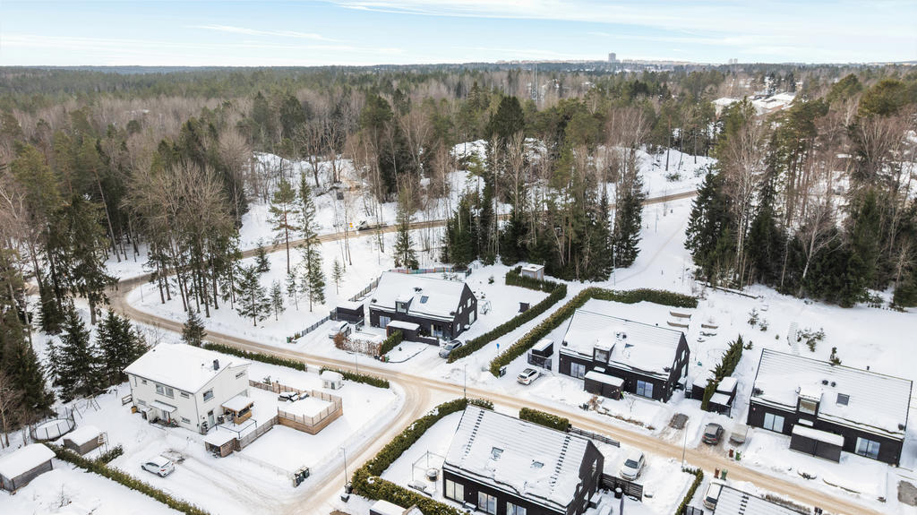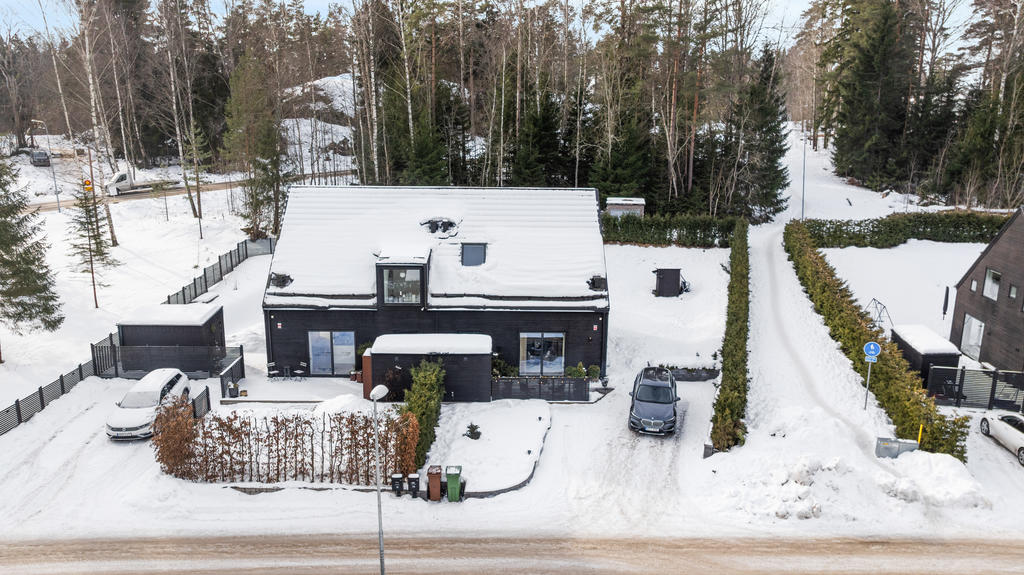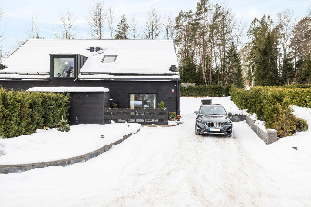 Tomten ligger i sydväst läge och är något utöver det vanliga för ett parhus. På baksidan har vi byggt ett växthus/uterum som rymmer upp till 10 personer. Det har två infra värmare i taket och är specialbeställt i mattsvart lack för att matcha husets design. På framsidan har uppfart fått en stenläggning som omgärdas av murar i mörk grå sten som rymmer 3 bilar. Tyresta naturreservat ligger bredvid huset och har ett elljusspår som påbörjas vid oss. Slingan har porlande bäckar och våtmarker, otroligt vackert.