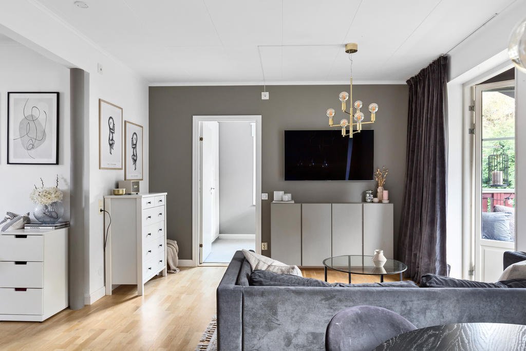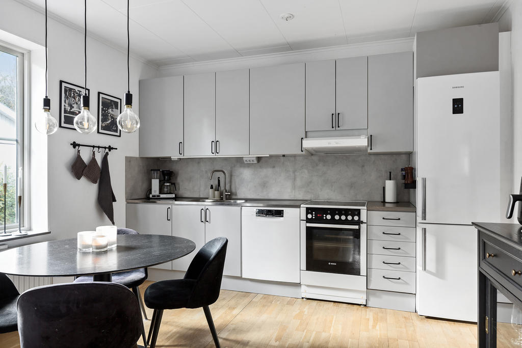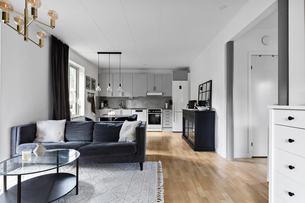 Här flyter vardagsrum och kök samman på ett naturligt sätt och bildar bostadens hjärta – en social yta där man gärna samlas. Det smakfullt renoverade köket bjuder in till både matlagning och gemenskap, med gott om arbetsyta, moderna vitvaror och en sober design där varje detalj är noga vald.