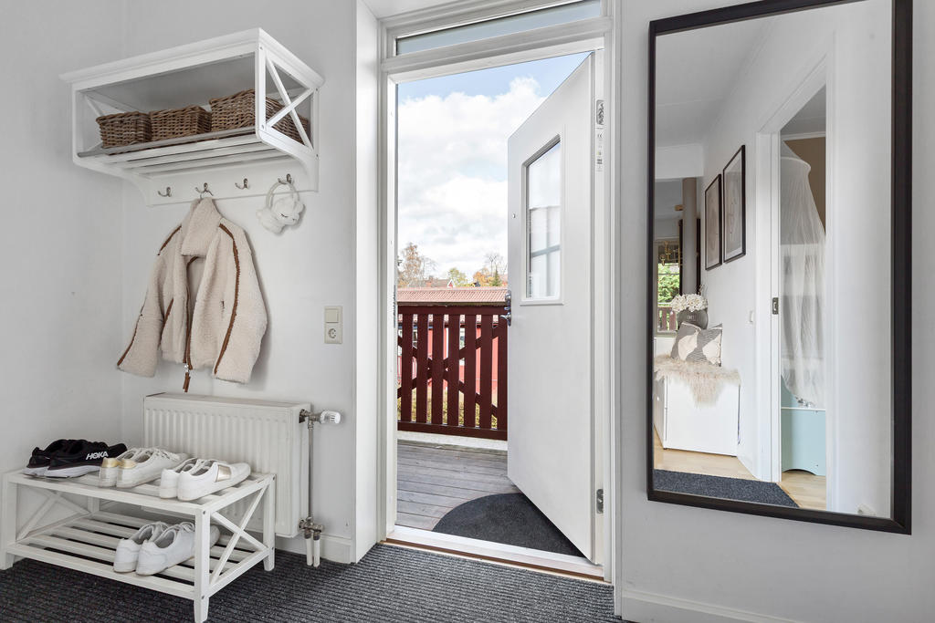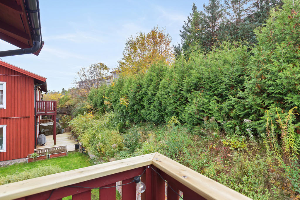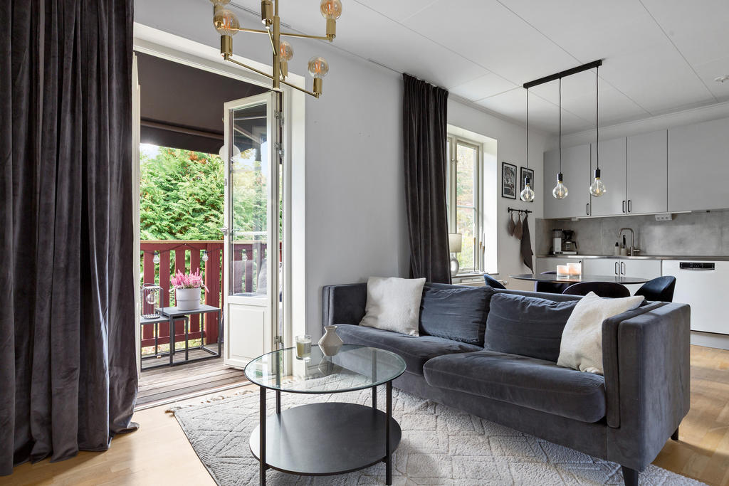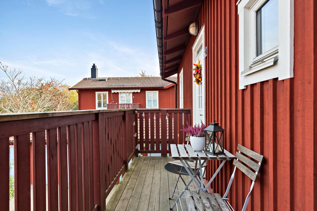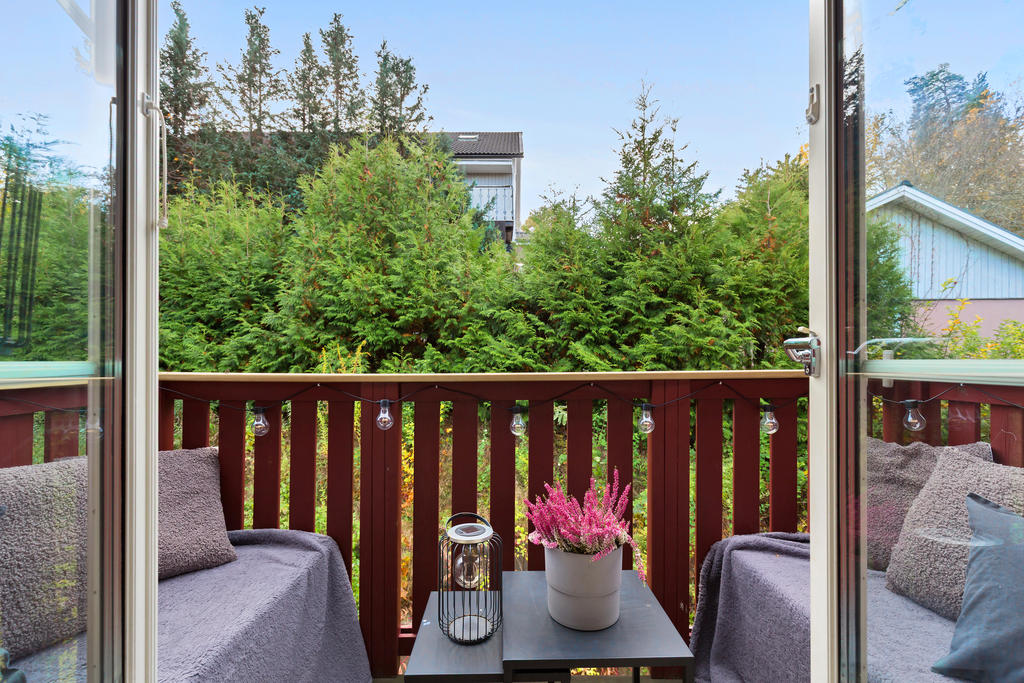 Från vardagsrummet når du den insynsskyddade balkongen i helt rätt solläge. Här kan du njuta av dagens alla stunder – från morgonens första solstrålar till kvällens gyllene sken – en perfekt plats för kaffekoppen, middagen eller en lugn stund med en bok.