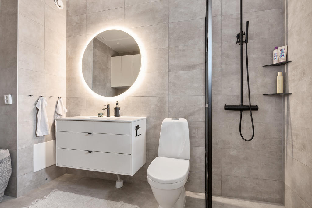 Det nyrenoverade badrummet bjuder på en känsla av lyx och avkoppling, med exklusiva materialval, stilrena detaljer och golvvärme som ger den där sköna hotellkänslan varje dag.