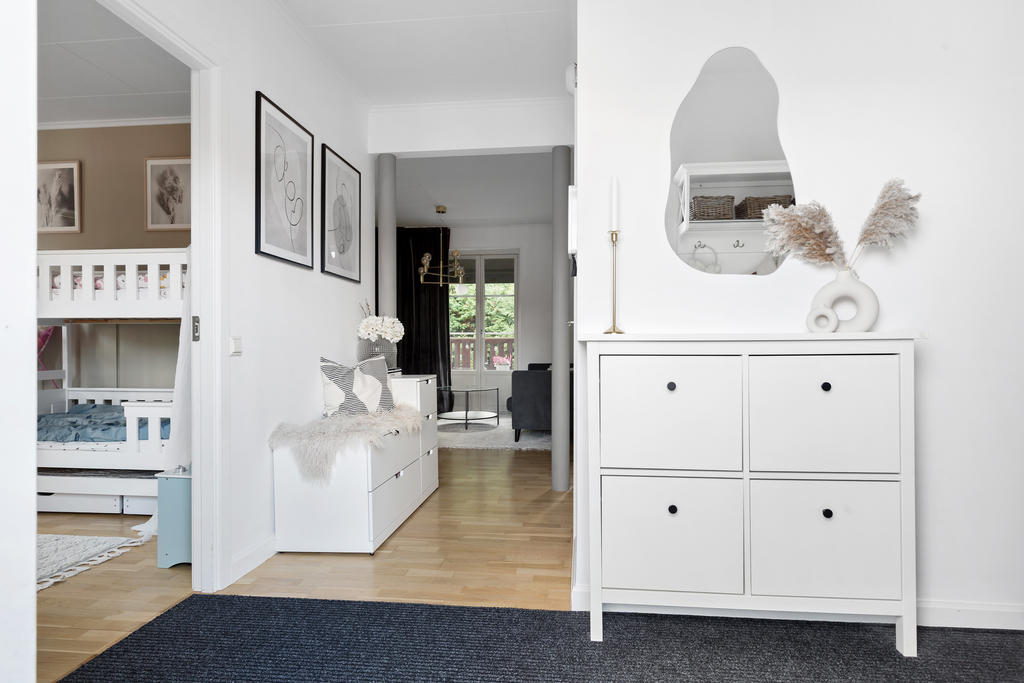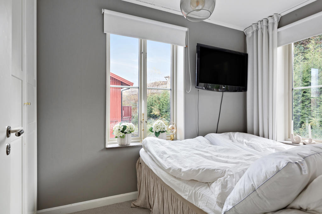 Sovrummen erbjuder lugn, trivsel och generös förvaring – här sover du gott med grönskan utanför fönstret. Vardagen blir dessutom extra bekväm med egen parkeringsplats och ett eget förråd i markplan, perfekt för barnvagn, cyklar eller sportutrustning – lättillgängligt och praktiskt.