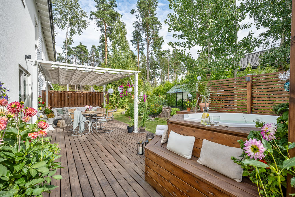 Uteplatsen knyter an till den imponerande trädgården, där en stor mängd perenna växter mixas med bärbuskar och pallkragar för odling av grönsaker och snittblommor. I den prunkande oasen kan du njuta av blommor som tulpaner, rosor, pioner, kaprifol och lavendel eller dignande buskar med björnbär, hallon, blåbär och krusbär. På tomten finns även ett körsbärsträd och ett plommonträd – som är lika härliga att njuta av under våren som när det är dags för skörd under sensommaren. Utöver detta ges härliga plana gräsytor där barnen kan leka fritt. Vintertid kan ni ta varma och mysiga bad i spabadet.