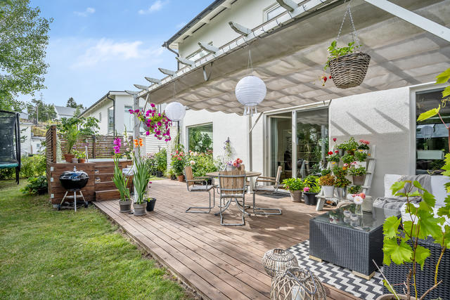 Vardagsrummet är väl tilltaget och socialt med plats för större soffgrupp samt tv-möbel. Här ges genom stora fönsterpartier en lummig utsikt mot den inbonade uteplatsen och samtidigt ett härligt ljusinsläpp. Via altandörr når ni här ut till husets härliga trallbelagda baksida med pergola och spabad. Baksidan som ligger i ett mycket privat och insynsskyddat läge blir en förlängning av bostaden och här kan ni med enkelhet duka upp för det stora sällskapet. En perfekt plats för varma soliga dagar eller trevliga grillkvällar. Hit når solens strålar under många timmar av dagen.