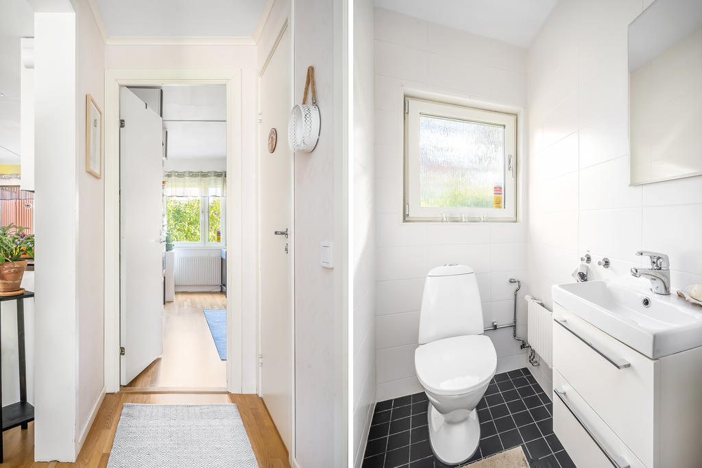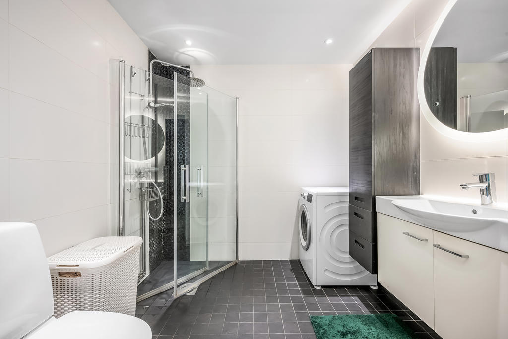 Badrummet är stilrent renoverat med moderna materialval och stilren design. Här finns dusch med svängbara duschväggar, handfat, kommod, wc, tvättmaskin och god förvaring i skåp. Den extra gäst-wc:n är även den inredd i samma smakfulla stil.