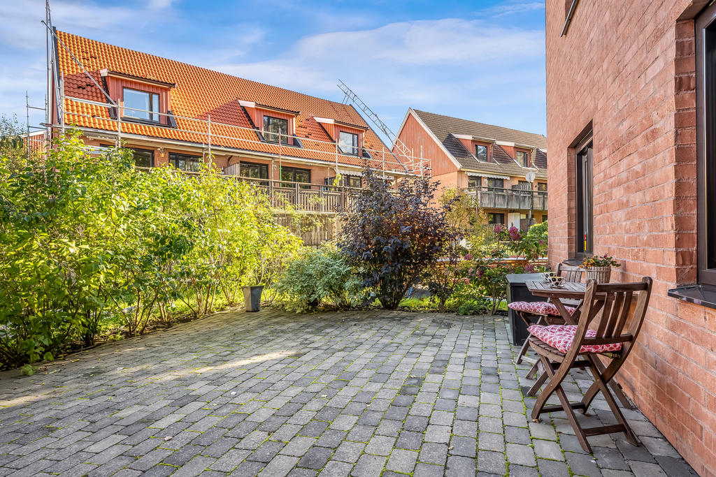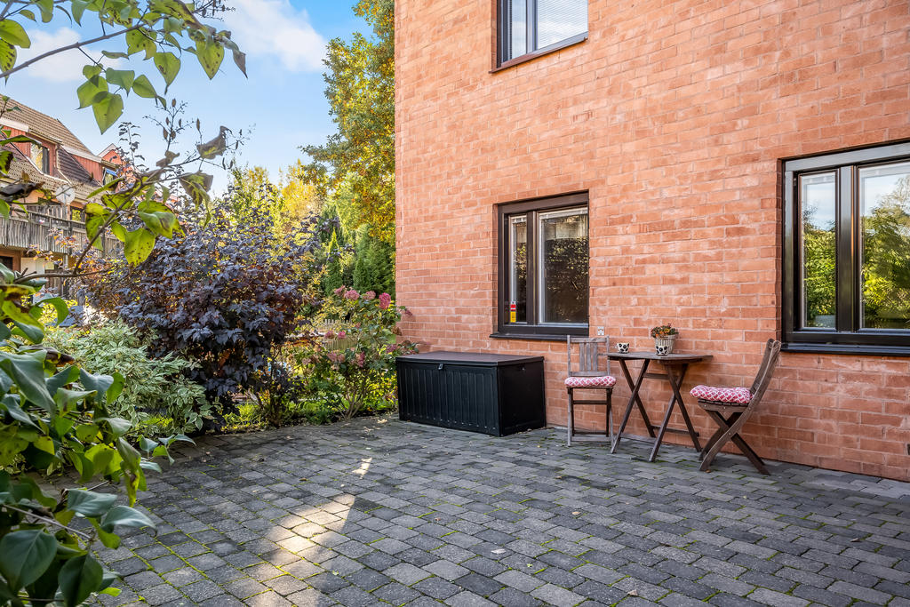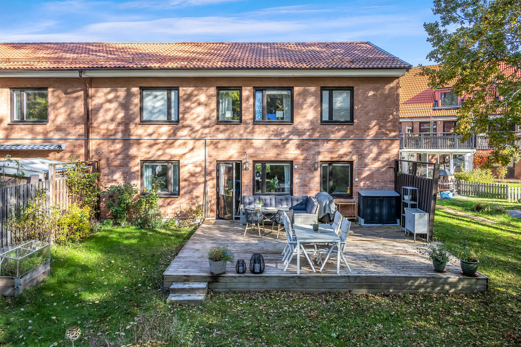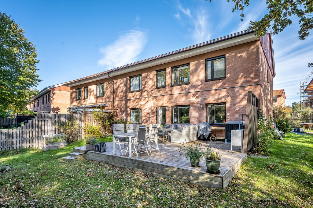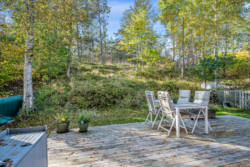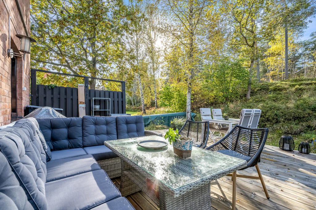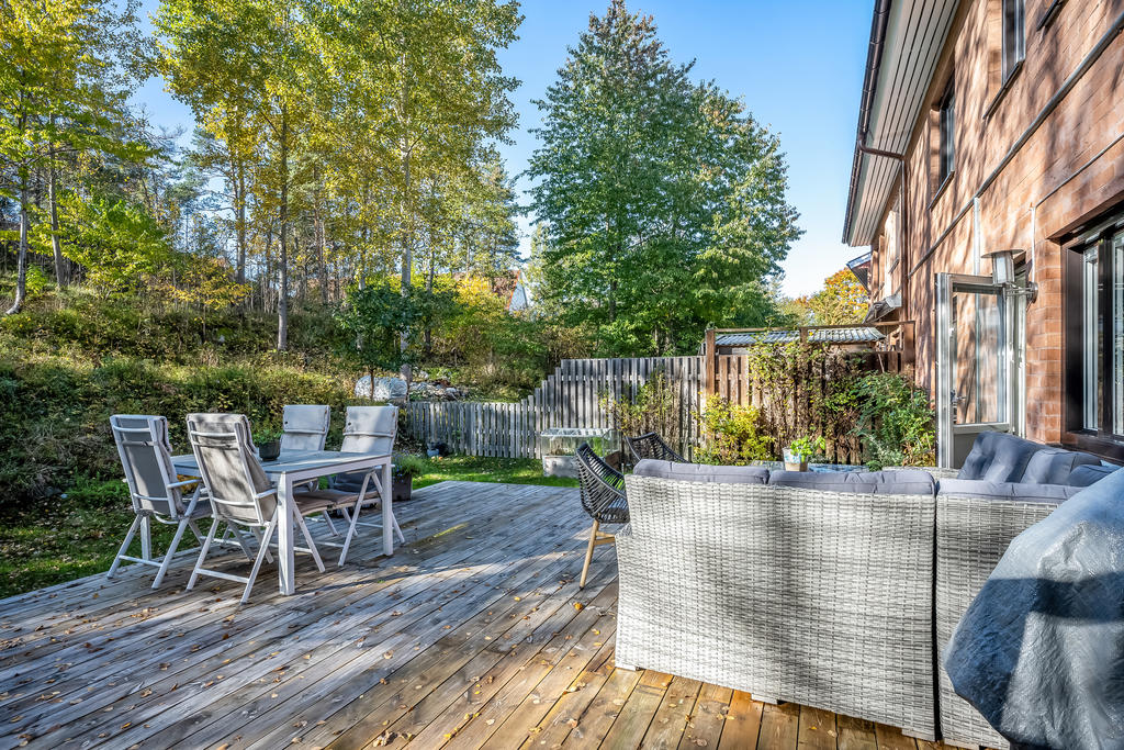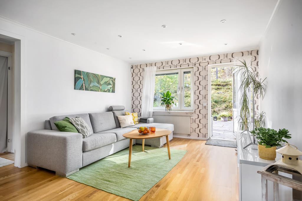 Vardagsrummet är rymligt och inbjudande, med gott om plats för stor soffgrupp och sociala ytor. Från vardagsrummet når du ut till en mycket privat altan i lummigt läge mot ett rogivande skogsparti. Här bor du insynsskyddat och lugnt med naturen som närmaste granne – en perfekt plats för avkoppling, middagar i kvällssolen eller för de små att springa fritt.