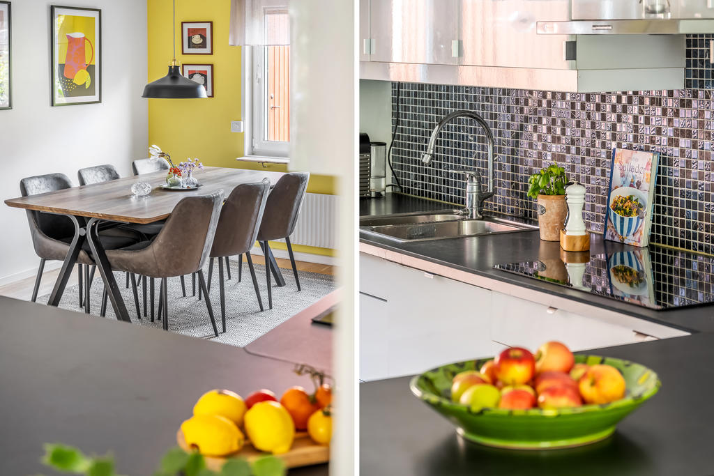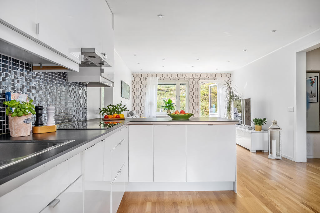 Köket är generöst tilltaget i en praktisk L-form och utrustat med en stilfull bardel som skapar en naturlig övergång till vardagsrummet – perfekt för social matlagning eller en snabb frukost. Vita luckor i modern design kombineras med mörkt stänkskydd och bänkskiva i elegant ton, vilket ger köket ett exklusivt och harmoniskt uttryck. Här finns gott om arbetsyta och förvaring samt plats för stort matbord vid fönsterpartiet med utsikt mot en av bostadens uteplatser.