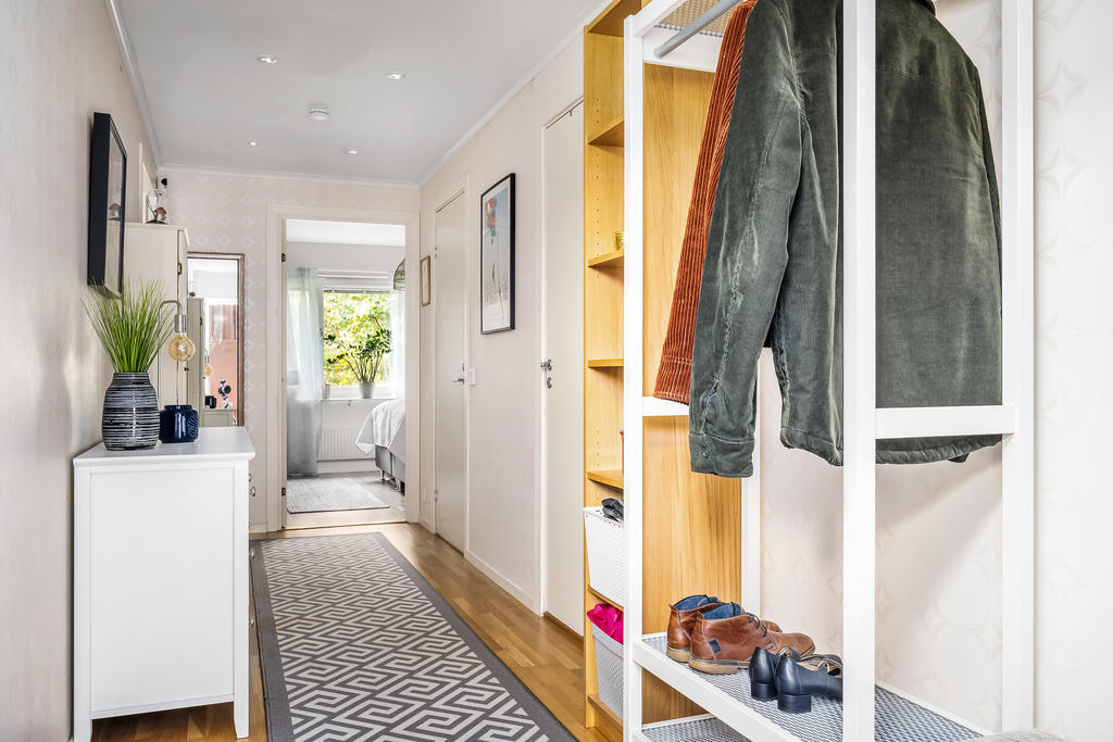 Bostaden välkomnar dig med en rymlig och inbjudande hall med gott om avhängningsmöjligheter samt förvaring i en praktisk, anslutande klädkammare. Här får du en trivsam och ordnad start på varje dag. Vidare erbjuds tre väldisponerade sovrum, varav master bedroom ligger avskilt i rofyllt läge mot naturen. Här ryms både dubbelsäng och förvaring. De övriga rummen passar utmärkt som barnrum, gästrum eller kontor.