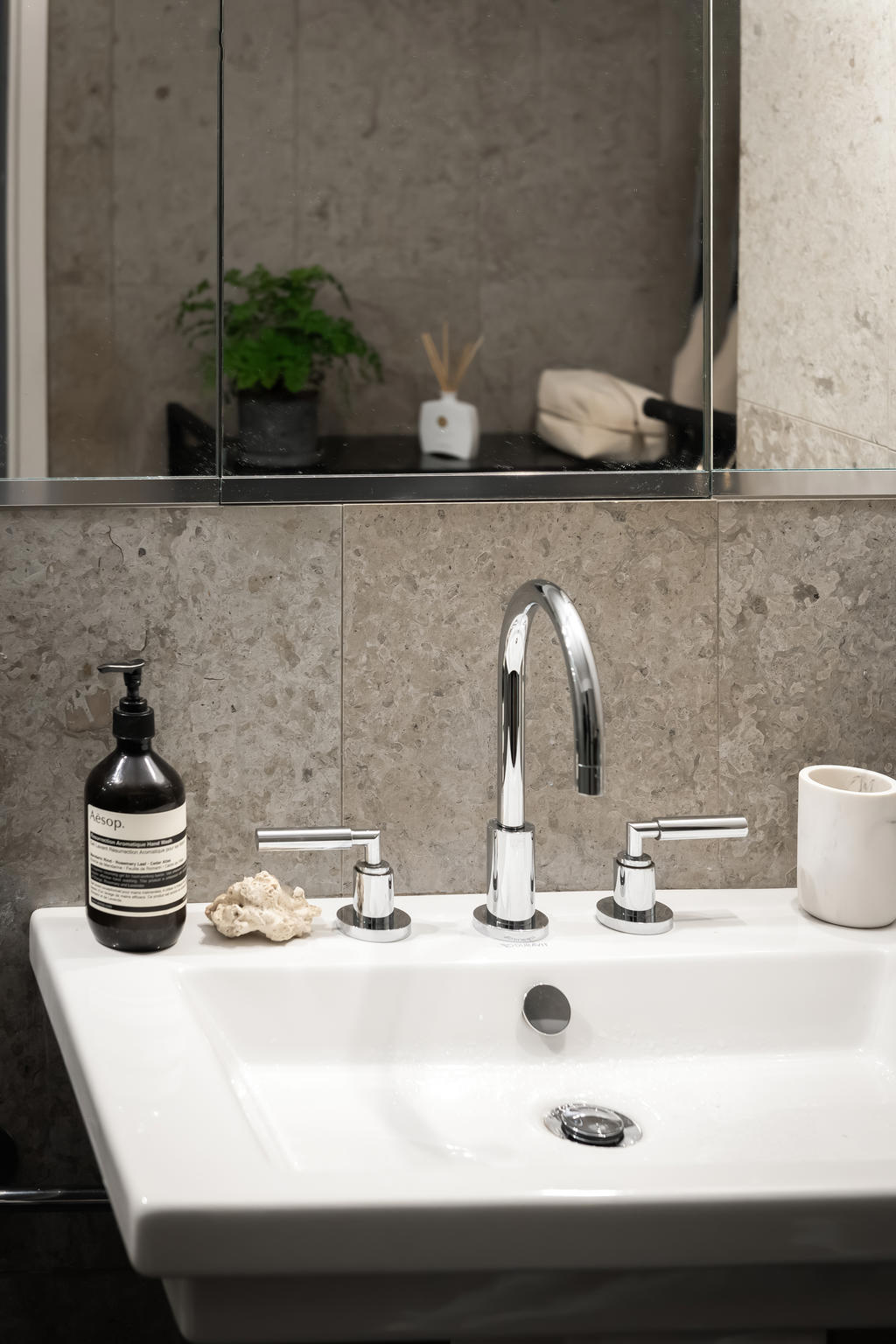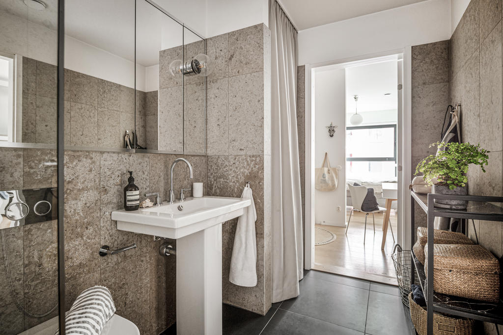 Badrummet nås via två ingångar, antingen direkt från sovrummet eller genom en mer neutral entré från hallen. Rummet präglas av naturstensinspirerade väggar och mörkgrå klinkergolv som ger en stilren och exklusiv känsla. Här finns dessutom modern komfort som vägghängd WC, inglasad takdusch, stor spegel med förvaring, tvättmaskin, torktumlare och handfat.