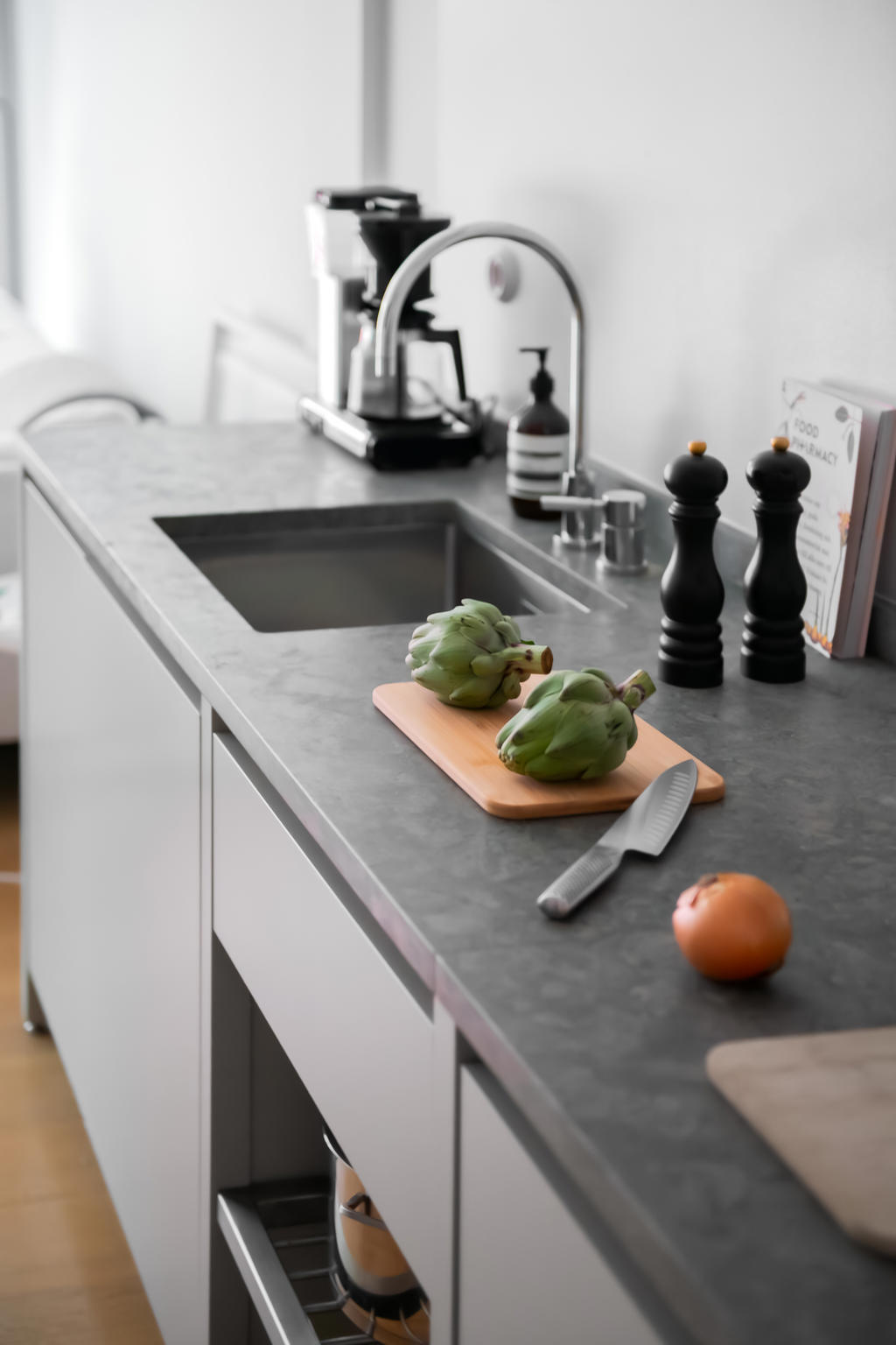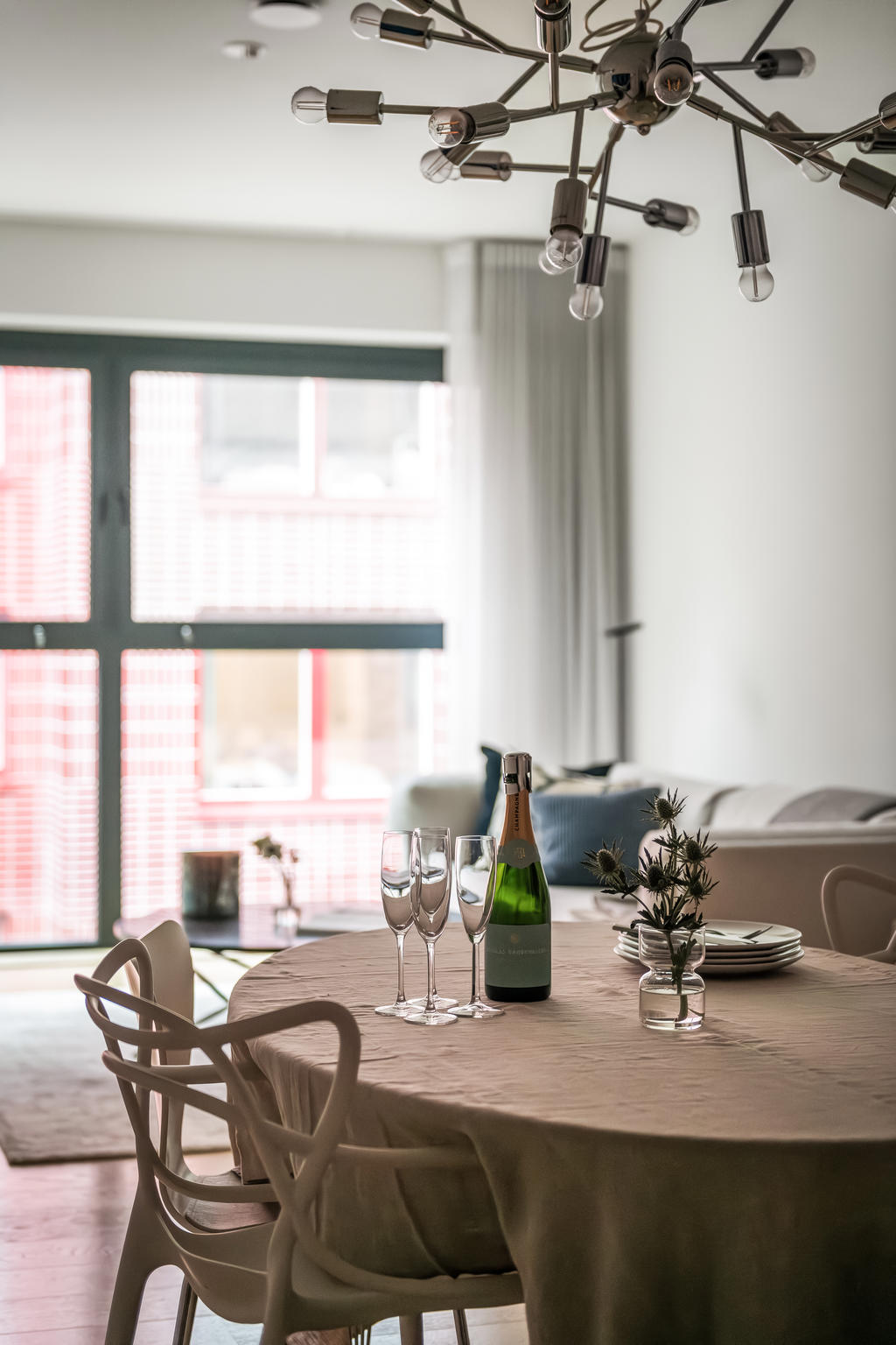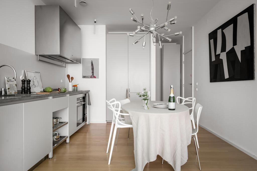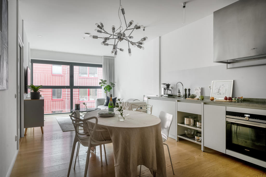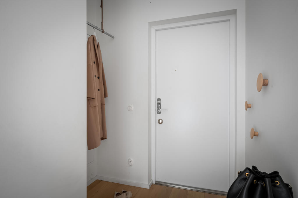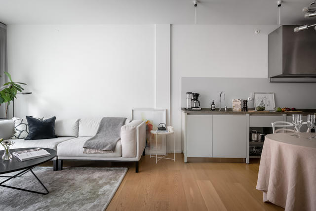 Bostaden utmärks av genomgående ljuspigmenterade ekgolv, påkostade materialval och en generös takhöjd om 2,7 meter, detaljer som tillsammans skapar en exklusiv och harmonisk atmosfär. Det moderna köket, i en öppen och social planlösning mot vardagsrummet, blir en naturlig samlingspunkt oavsett tillställning. Här finns gott om förvaring och en rymlig bänkskiva som ger både arbetsyta och avlastning, perfekt för dig som söker plats för både matlagningsglädje och trevligt umgänge.