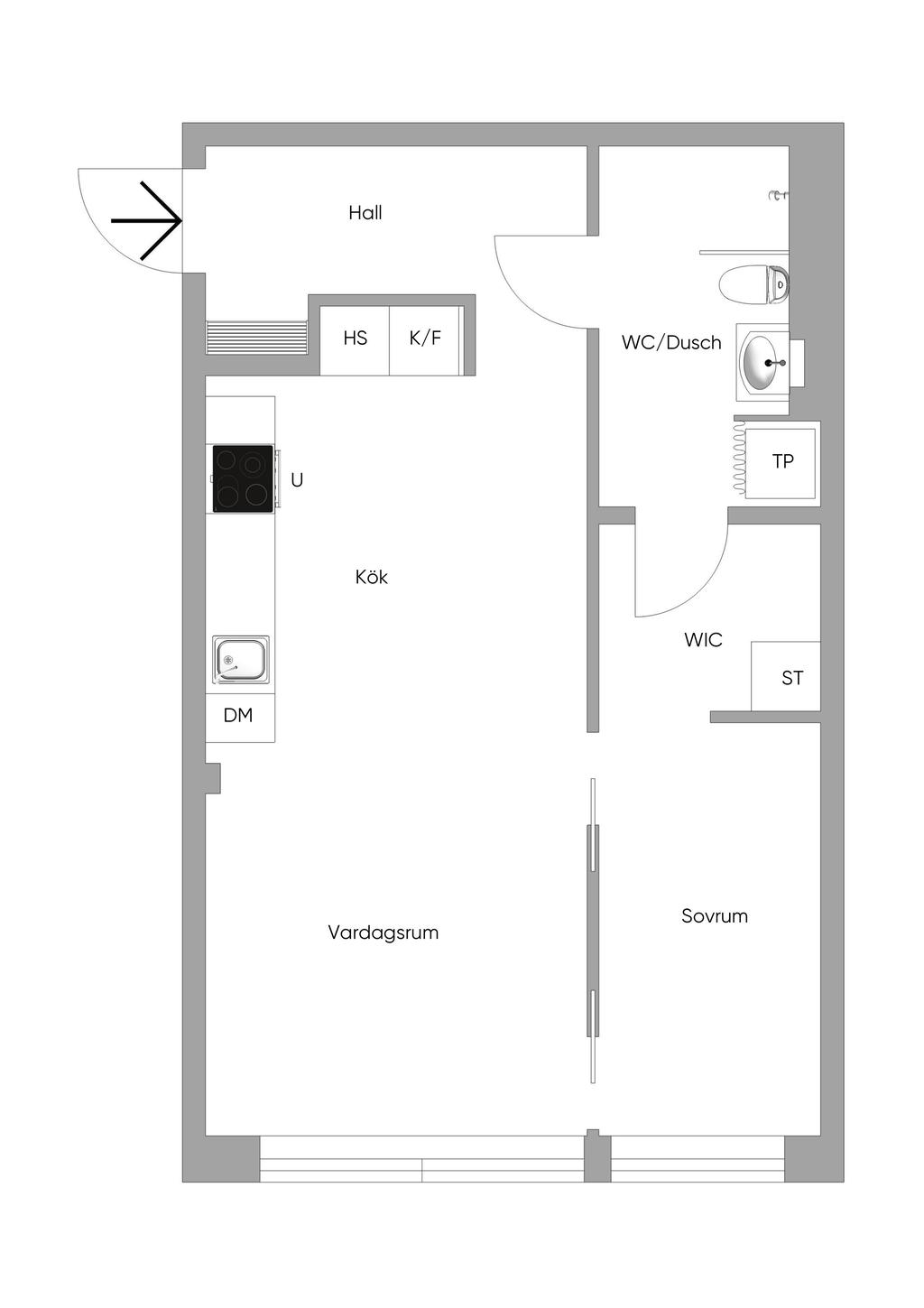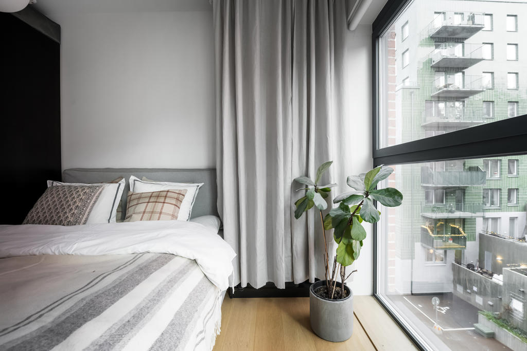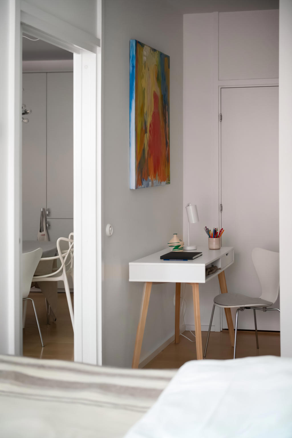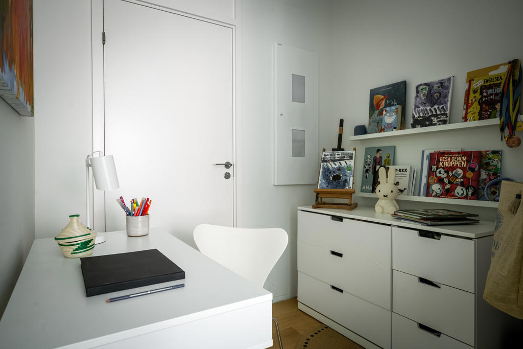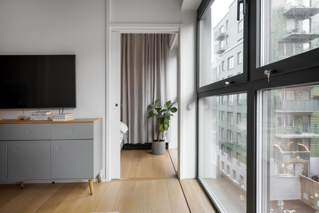 De stora fönsterpartierna i soligt söderläge som sträcker sig ända ned från golvet fyller hela lägenheten med ett fantastiskt ljusflöde. I det rogivande sovrummet finns plats för en generös säng och härifrån nås både en elegant walk-in-closet och en privat ingång till badrummet. Idag nyttjas garderoben även som en smart arbetsplats, vilket verkligen visar på bostadens flexibilitet och genomtänkta planlösning.